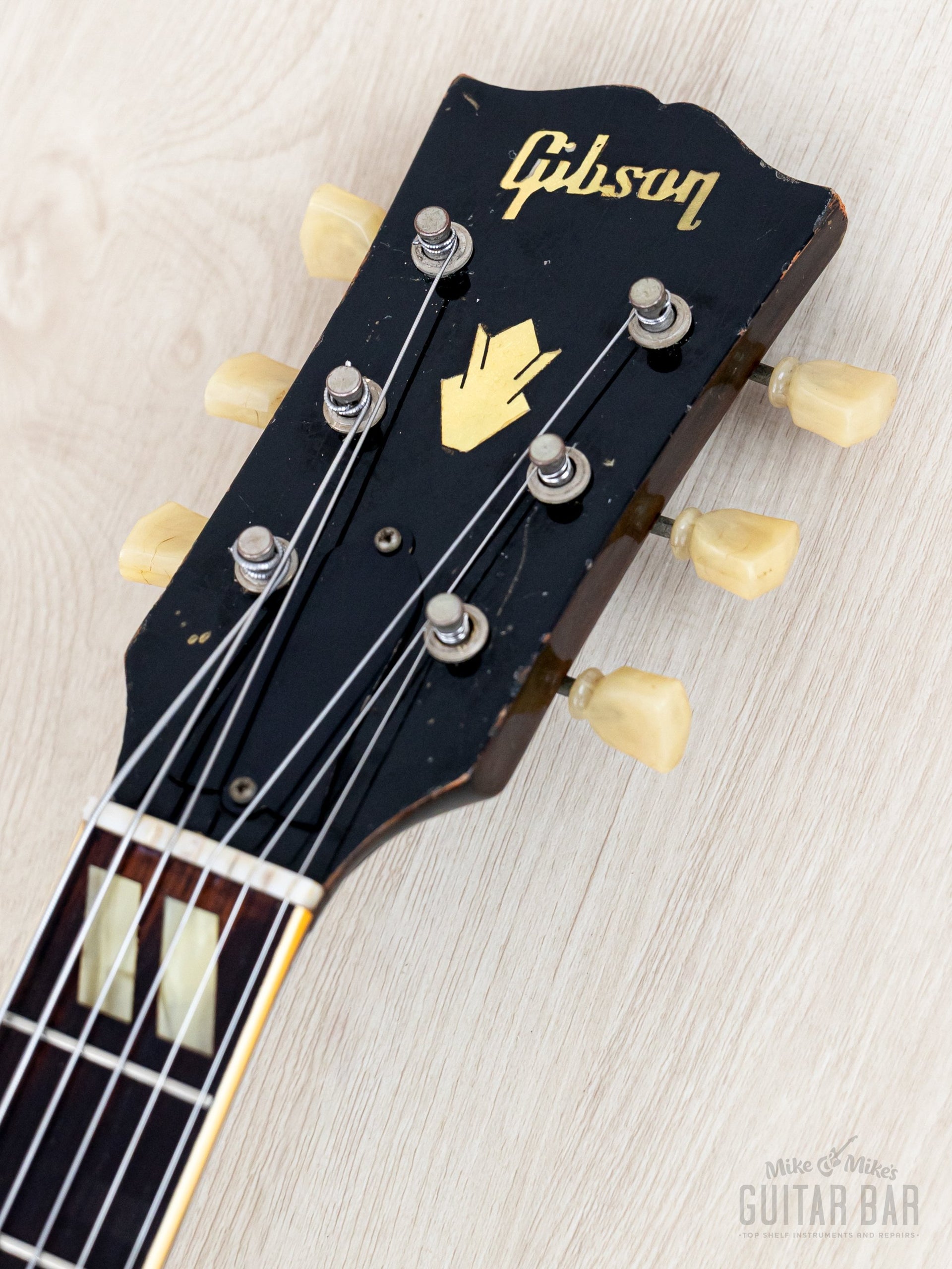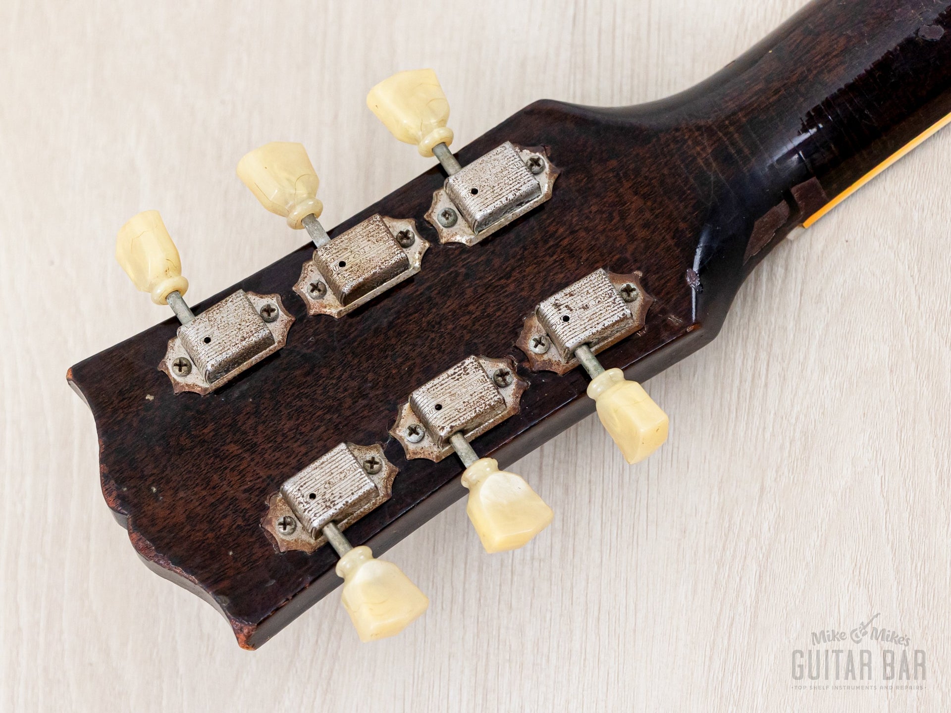 The gloss Sunburst nitro lacquer finish is 100% original with no touch-up or overspray, with just a handful of small chips and nicks along the lower bout rim and a few finish scratches on the back. There is fine, tight lacquer checking across the body, and two small doweled strap button mounting holes on the neck heel. The nitro gloss on the neck profile is smooth to the palm, with limited finish loss in the 1st position, plus a few shallow marks along the profile length.