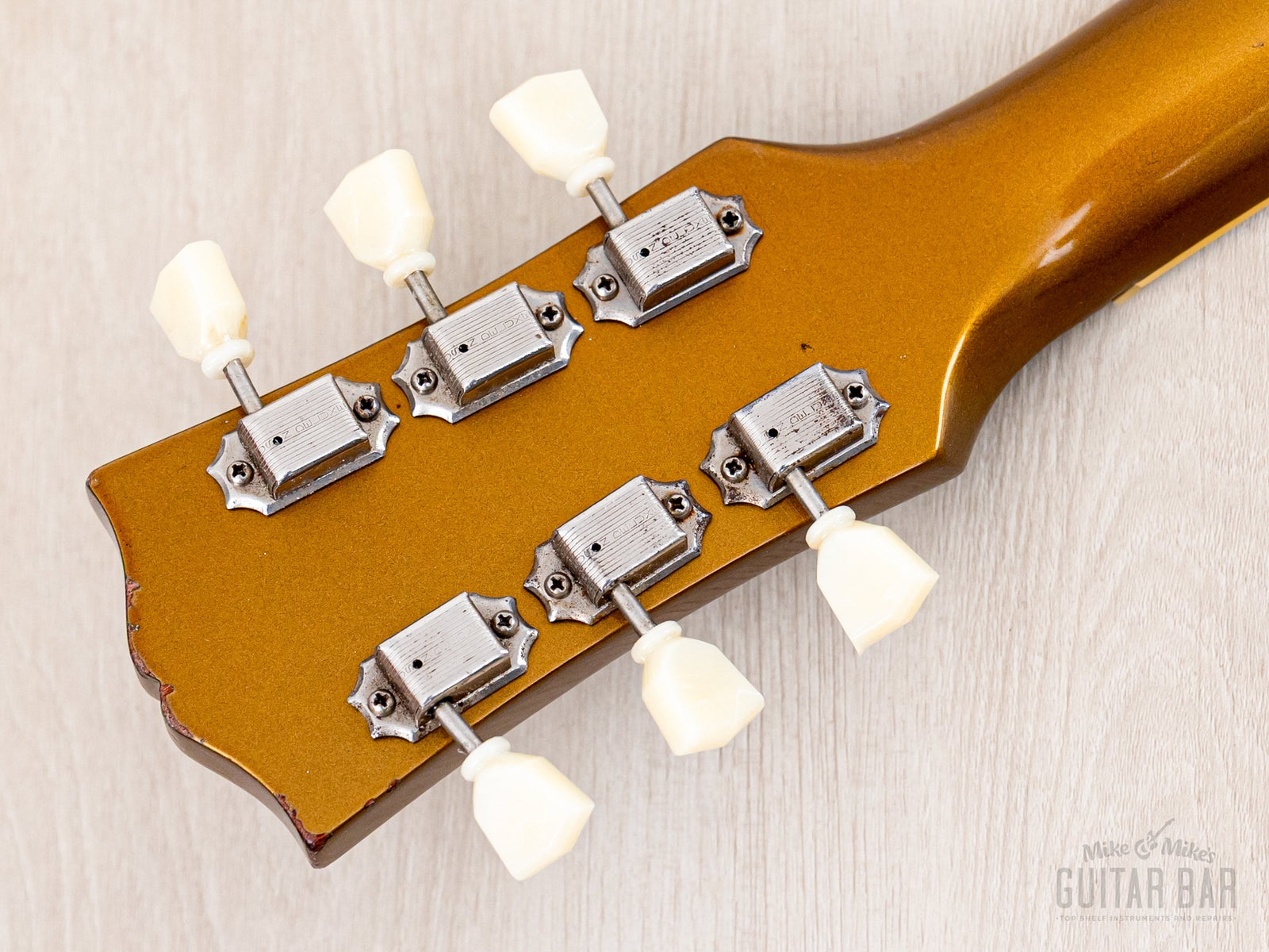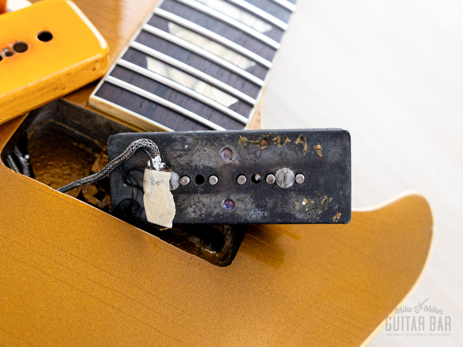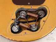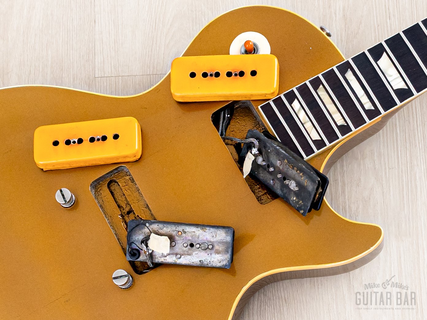Work on this very early ‘53 Les Paul includes a neck reset (to the proper angle for ‘54-style wraptail), full refret with ‘58-spec medium jumbo fretwire and fretboard rebinding with correct “nibs,” replacement aged acrylic fretboard inlays and grain-matched Brazilian rosewood fretboard extension, and carbon fiber-reinforced headstock repair, with all neck work done by Portland Fret Works. The “All-Gold” nitro lacquer finish and sympathetic relic is courtesy of Riggio Custom Guitars. In addition to the full suite of stock electronics, additional original parts include the gold speed knobs, notably yellowed pickup covers, and Pat. Pend Kluson Deluxe single-line tuning machines.