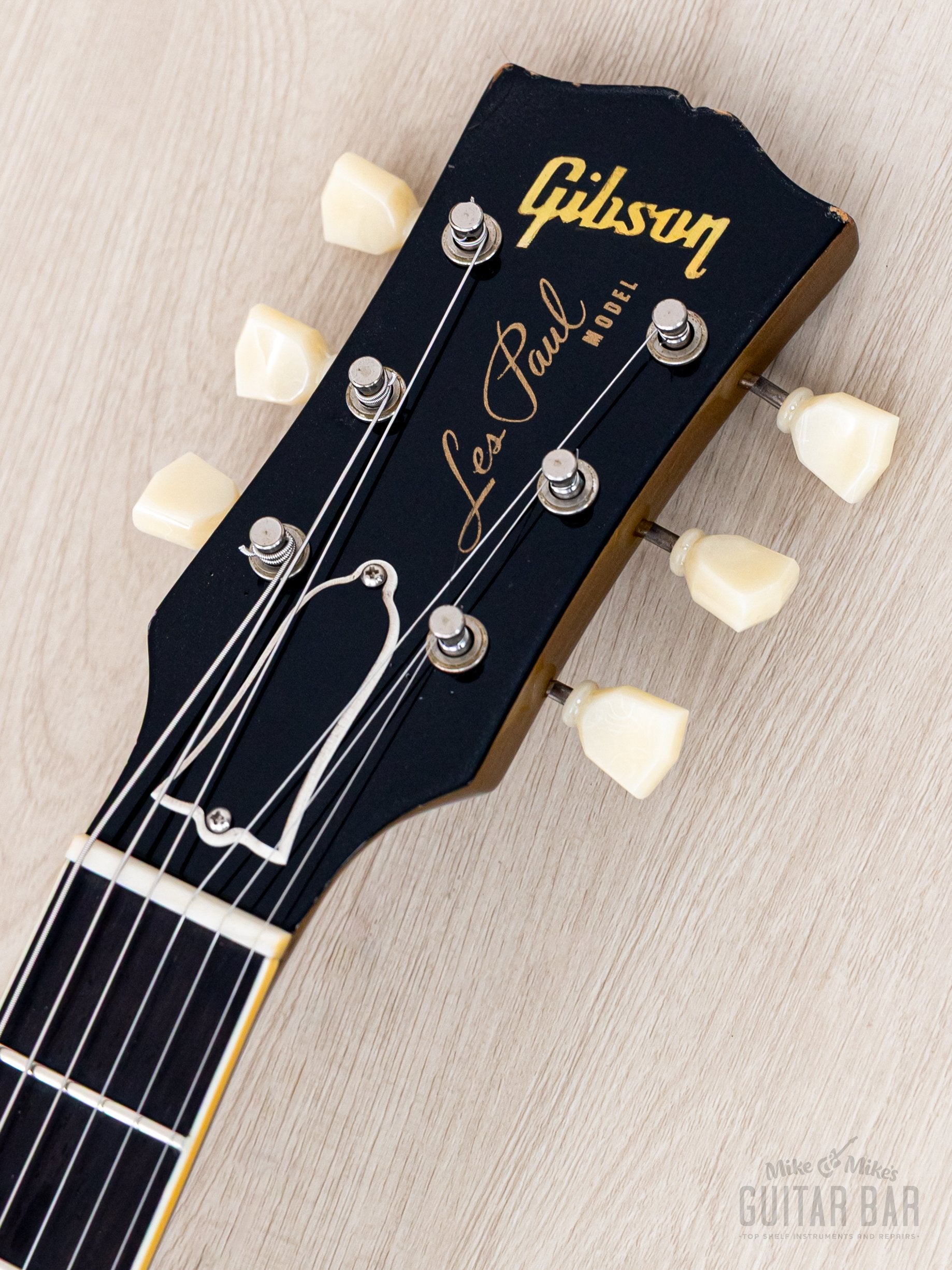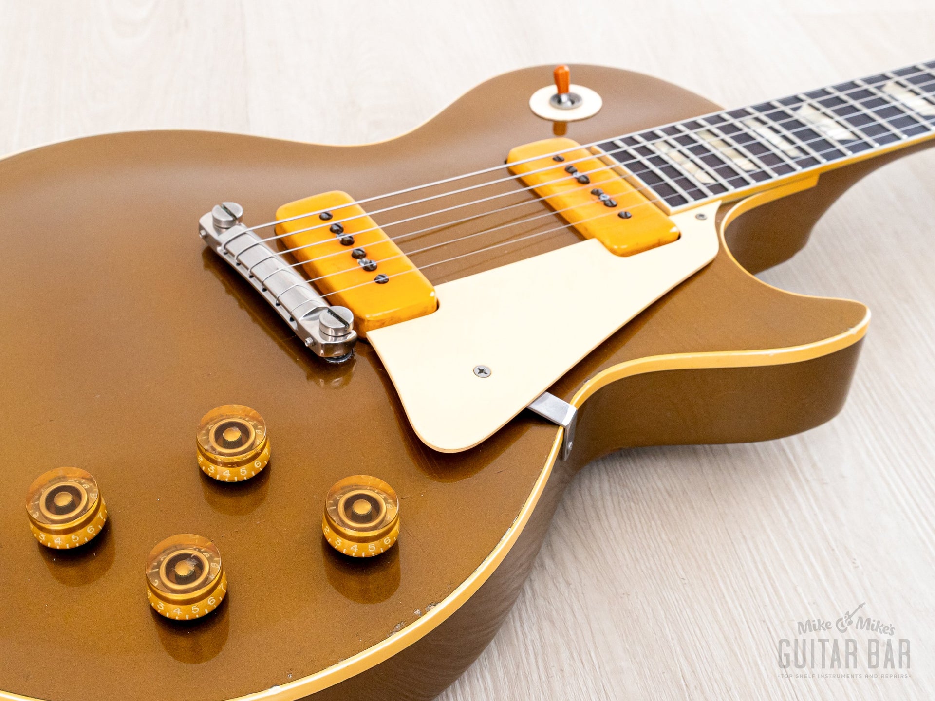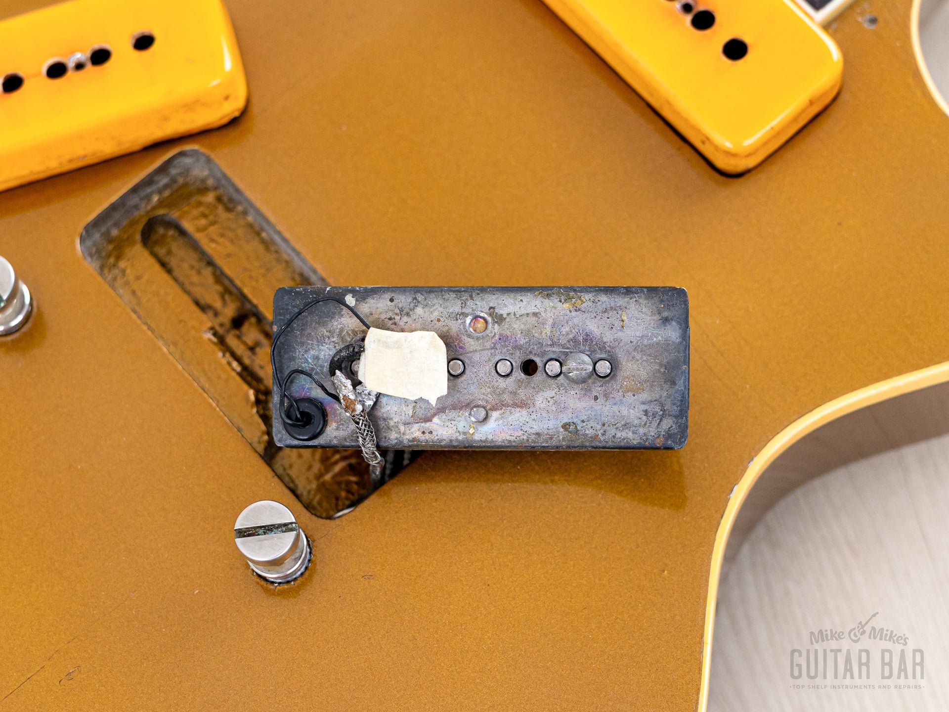 Work on this very early ‘53 Les Paul includes a neck reset (to the proper angle for ‘54-style wraptail), full refret with ‘58-spec medium jumbo fretwire and fretboard rebinding with correct “nibs,” replacement aged acrylic fretboard inlays and grain-matched Brazilian rosewood fretboard extension, and carbon fiber-reinforced headstock repair, with all neck work done by Portland Fret Works. The “All-Gold” nitro lacquer finish and sympathetic relic is courtesy of Riggio Custom Guitars. In addition to the full suite of stock electronics, additional original parts include the gold speed knobs, notably yellowed pickup covers, and Pat. Pend Kluson Deluxe single-line tuning machines.