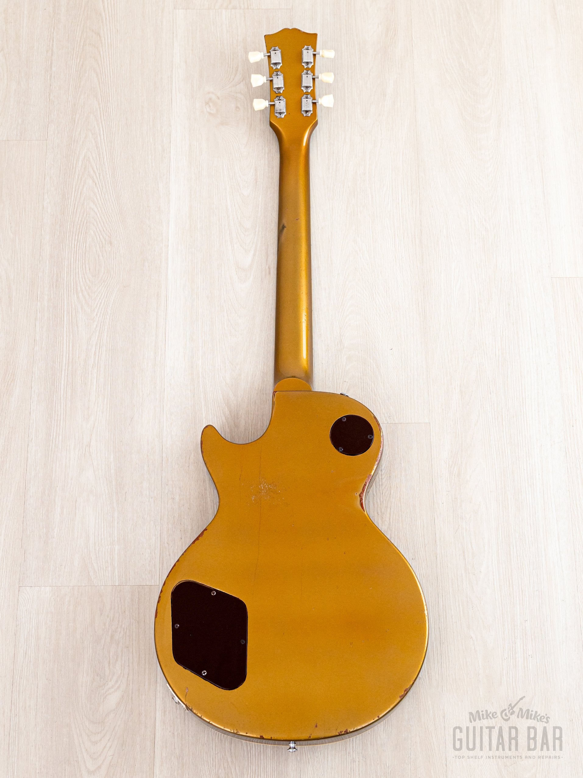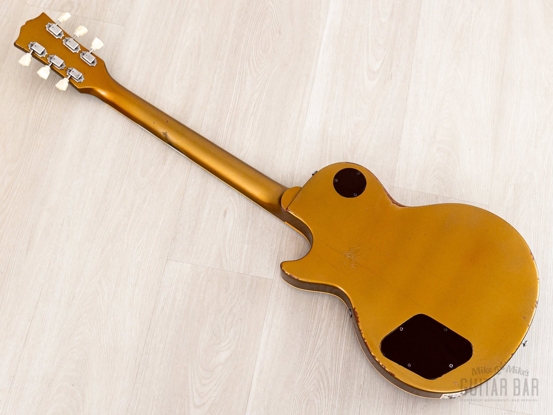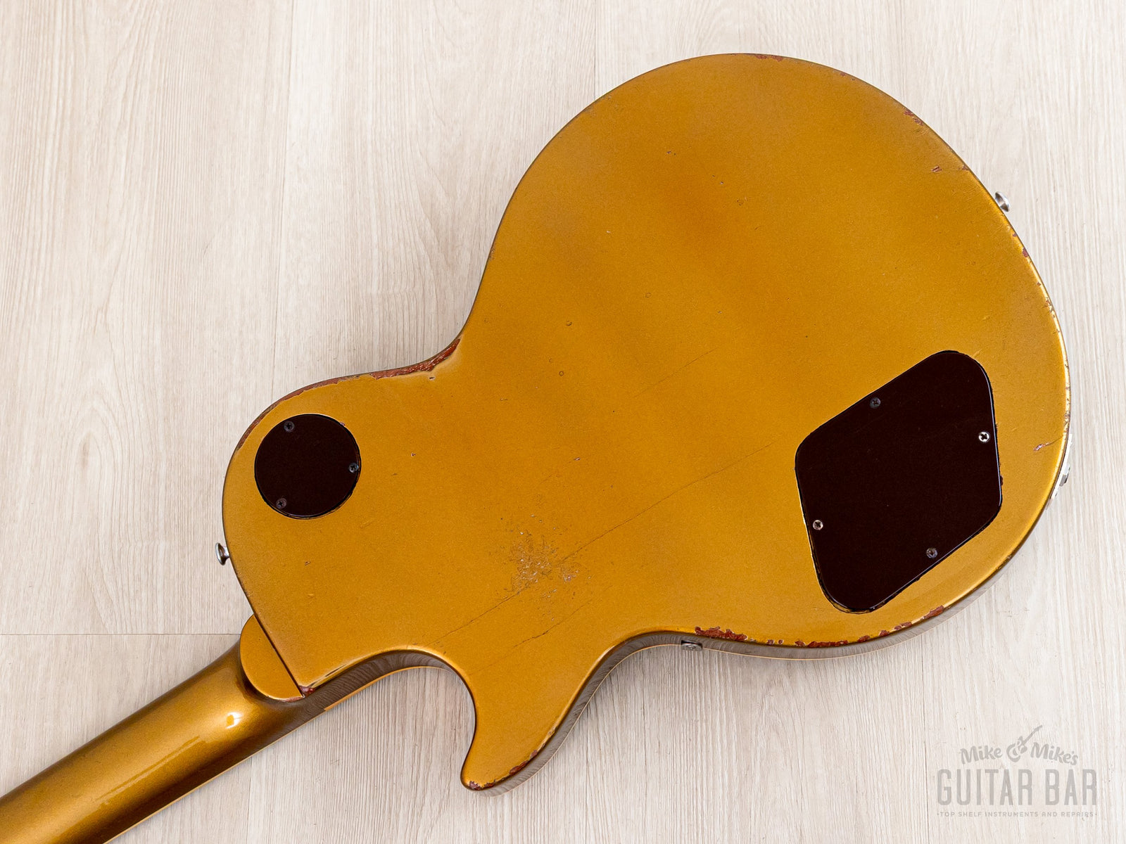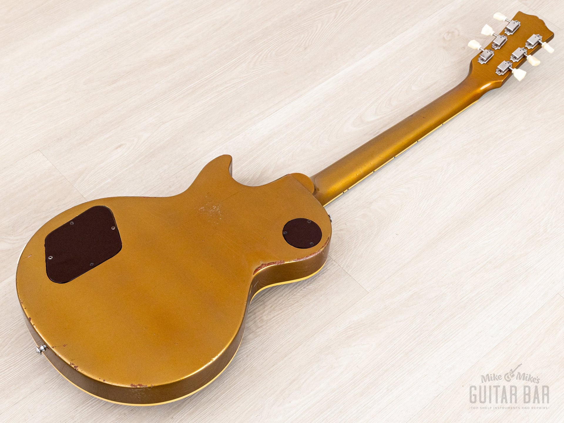 The fresh gloss “All Gold” nitro lacquer refinish was executed by Riggio Custom Guitars, pitch-perfect in its hue and saturation. Riggio partnered with Gibson to share his gold finish formulation, which has been in-use on Gibson’s Custom Shop Historic instruments since 2023. The finish has been treated with Riggio’s aging process (light relic), exhibiting checking and marks of synthesized wear. The neck profile has undergone the same treatment.