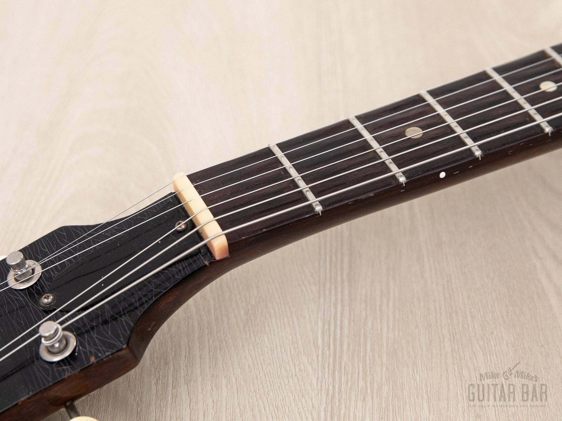 Featuring a Honduran mahogany body and chunky C-shaped neck capped by a Brazilian rosewood fretboard, this Les Paul Junior offers plenty of natural treble zing and rich growl. The P-90 pickup is wound slightly more conservatively than later examples at 7.8k ohms, with a very dynamic, touch-sensitive quality and excellent note detail. Cleans are glassy and textured, while overdriven tones have ample bark and midrange push. Weighing 7lbs 6oz, this Les Paul Junior has been professionally setup here at Mike & Mike's Guitar Bar with 10-46 strings, low action and accurate intonation.