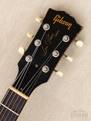 There is a professionally-addressed headstock repair, with overspray on the bottom third of the headstock face, masking three small dowels added for structural integrity. There is some minor reshaping of the neck carve behind the nut, and gloss lacquer overspray extending down the neck profile until fret 9. There is no visible repaired crack, and the nitro gloss is very smooth to the palm on the profile length. The Sunburst gloss nitro lacquer finish on the body is 100% original, with prominent horizontal checking and notable edge wear down to the bare mahogany, particularly on the back, as well as various nicks and scuffs from use.