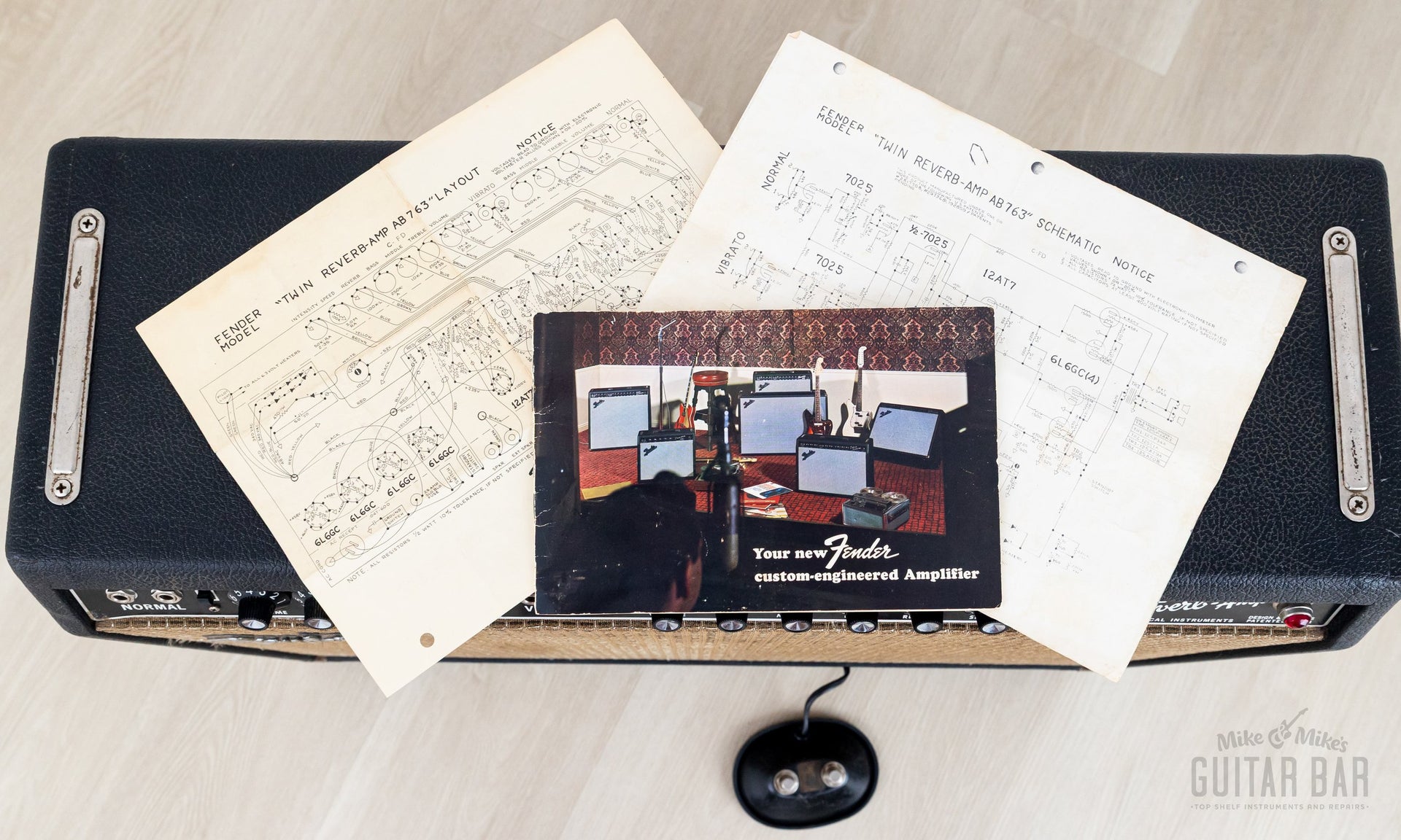 The original two-button footswitch is included, along with the original Victoria Luggage-branded slip cover and the factory paperwork comprising the full color Fender catalog and a pair of schematics.