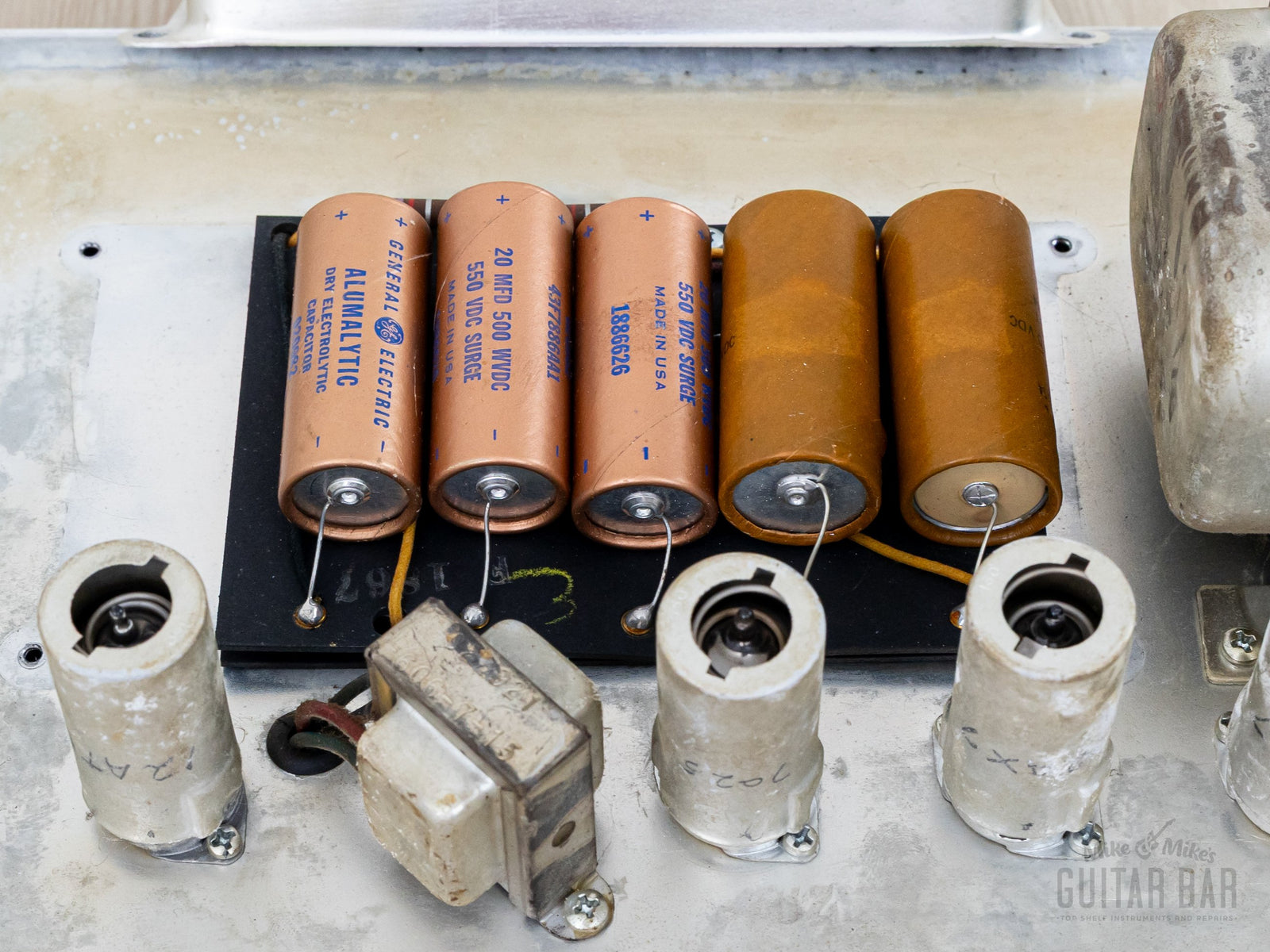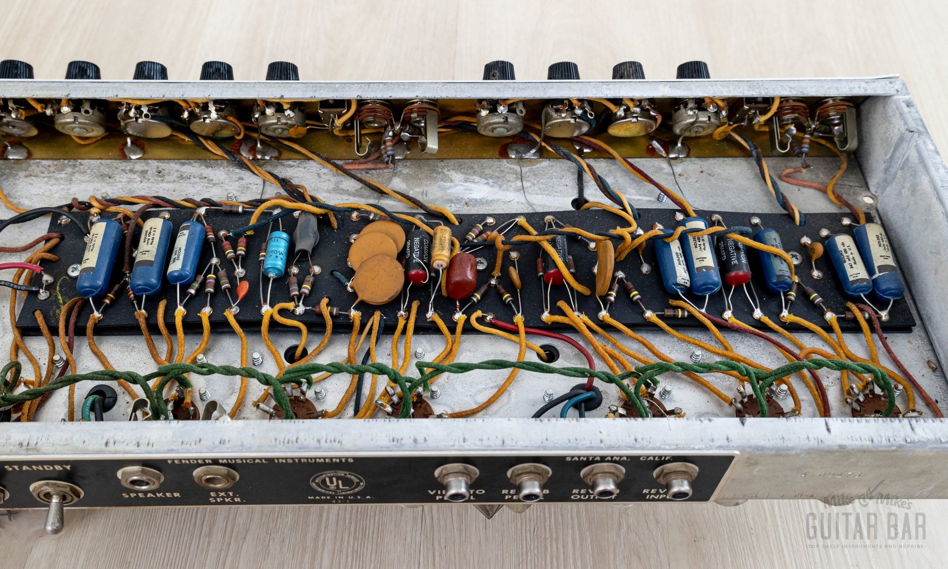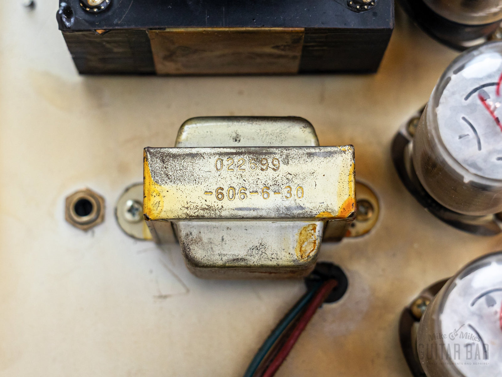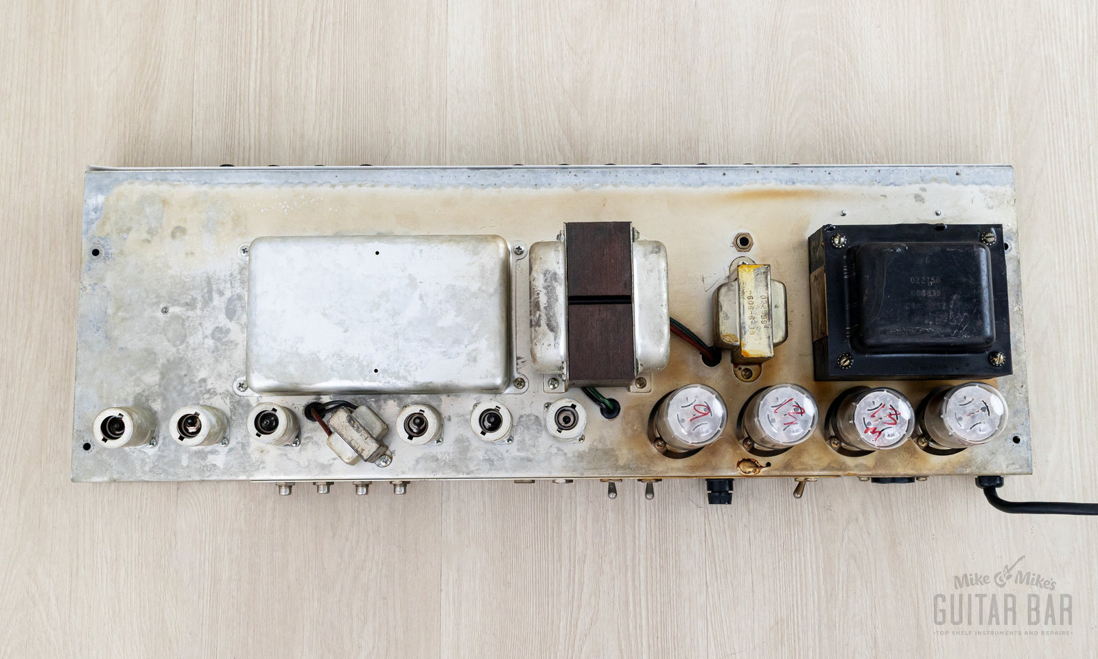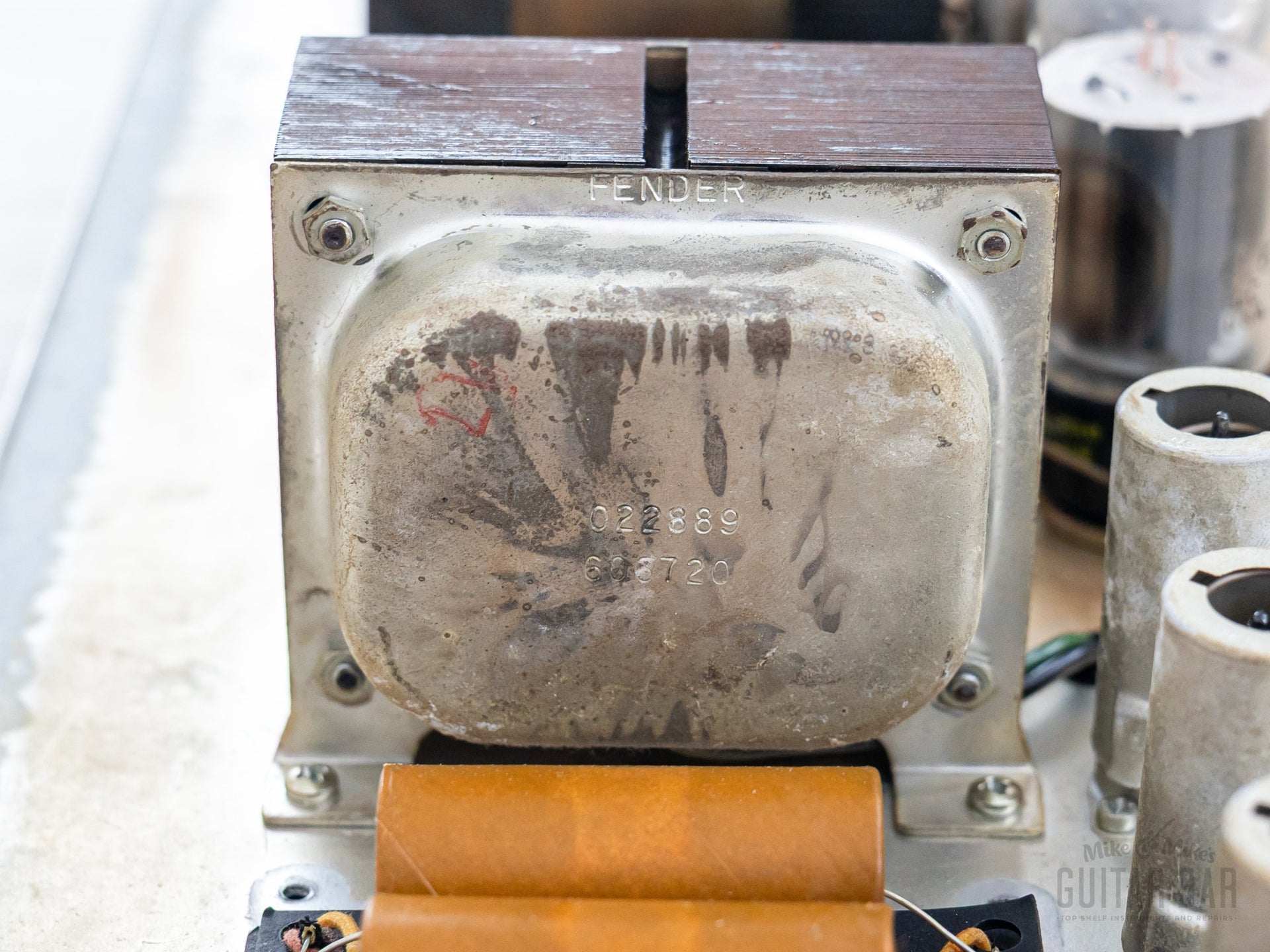 The circuit is extremely straight, retaining all of the original blue molded Ajax capacitors, a key part of the sweet, musical character of the Black Panel-era preamps. All of the original Schumacher-made transformers are intact, with date codes spanning mid-1966 to early ‘67. The original CTS pots have visible date codes from the 38th week of '66. The amp has a single new electrolytic capacitor in the preamp along with a new bias capacitor. Even the stock power supply caps are still intact and viable. The power tubes comprise three Sylvanias and a closely matched Fender-branded 6L6 with the same construction. The preamp features RCA, Amperex and GE-branded valves.