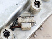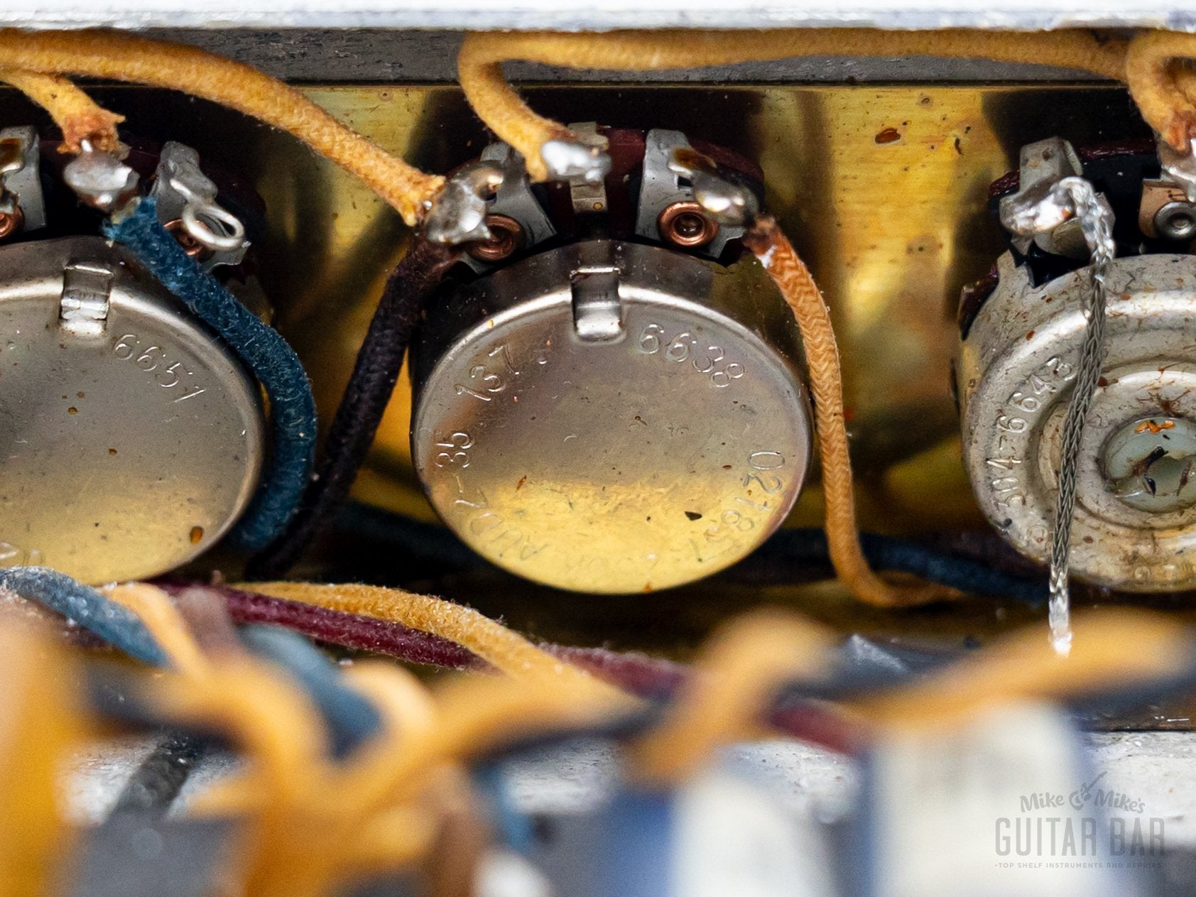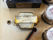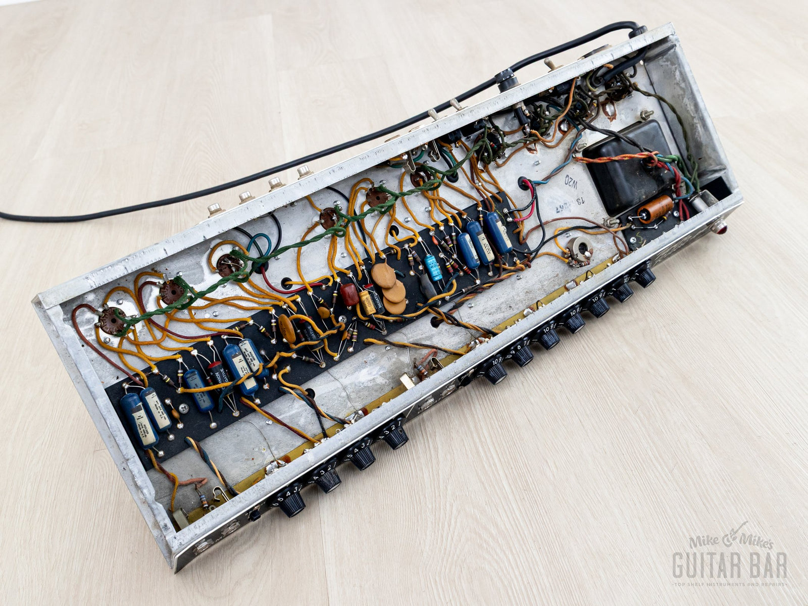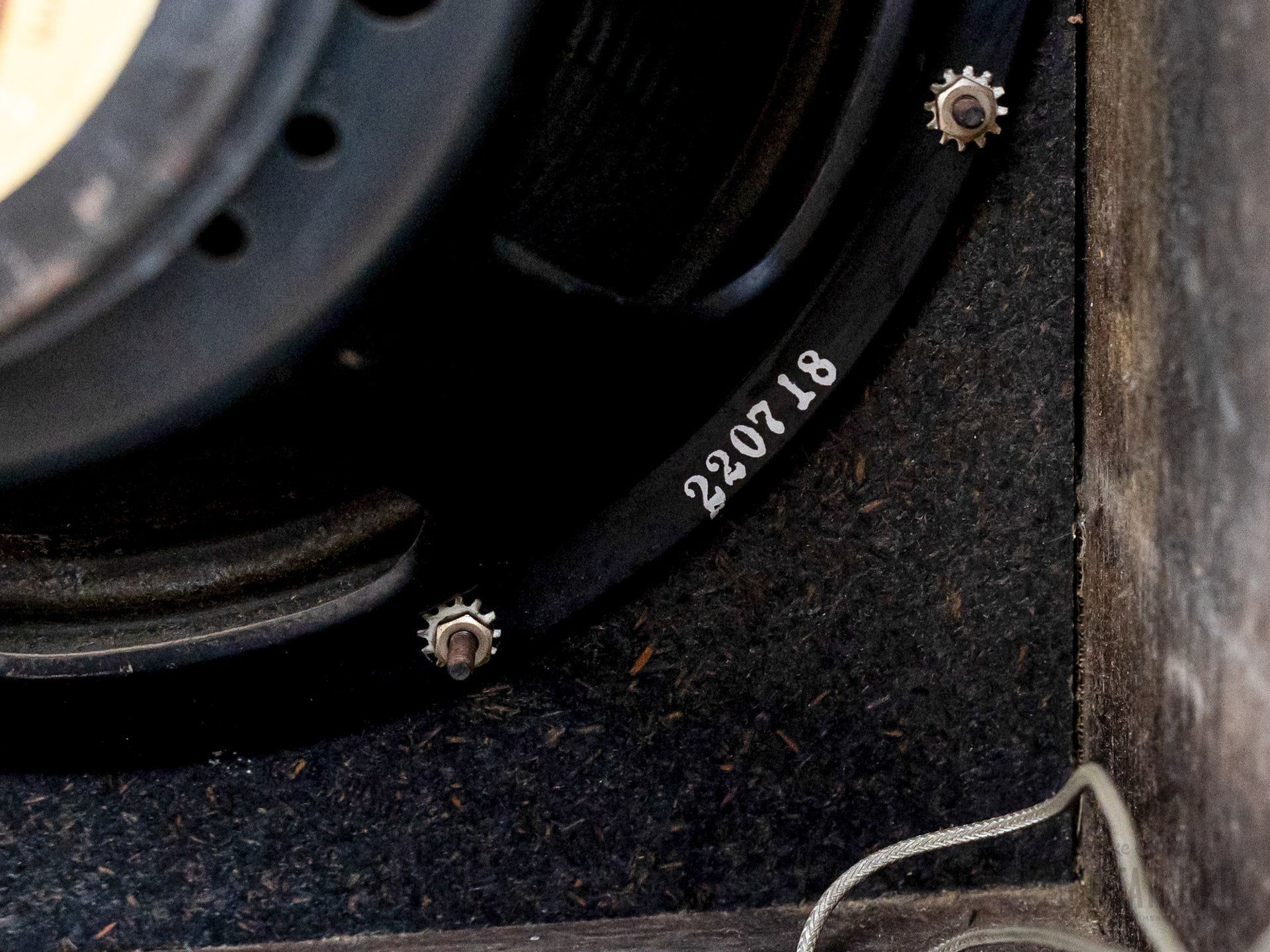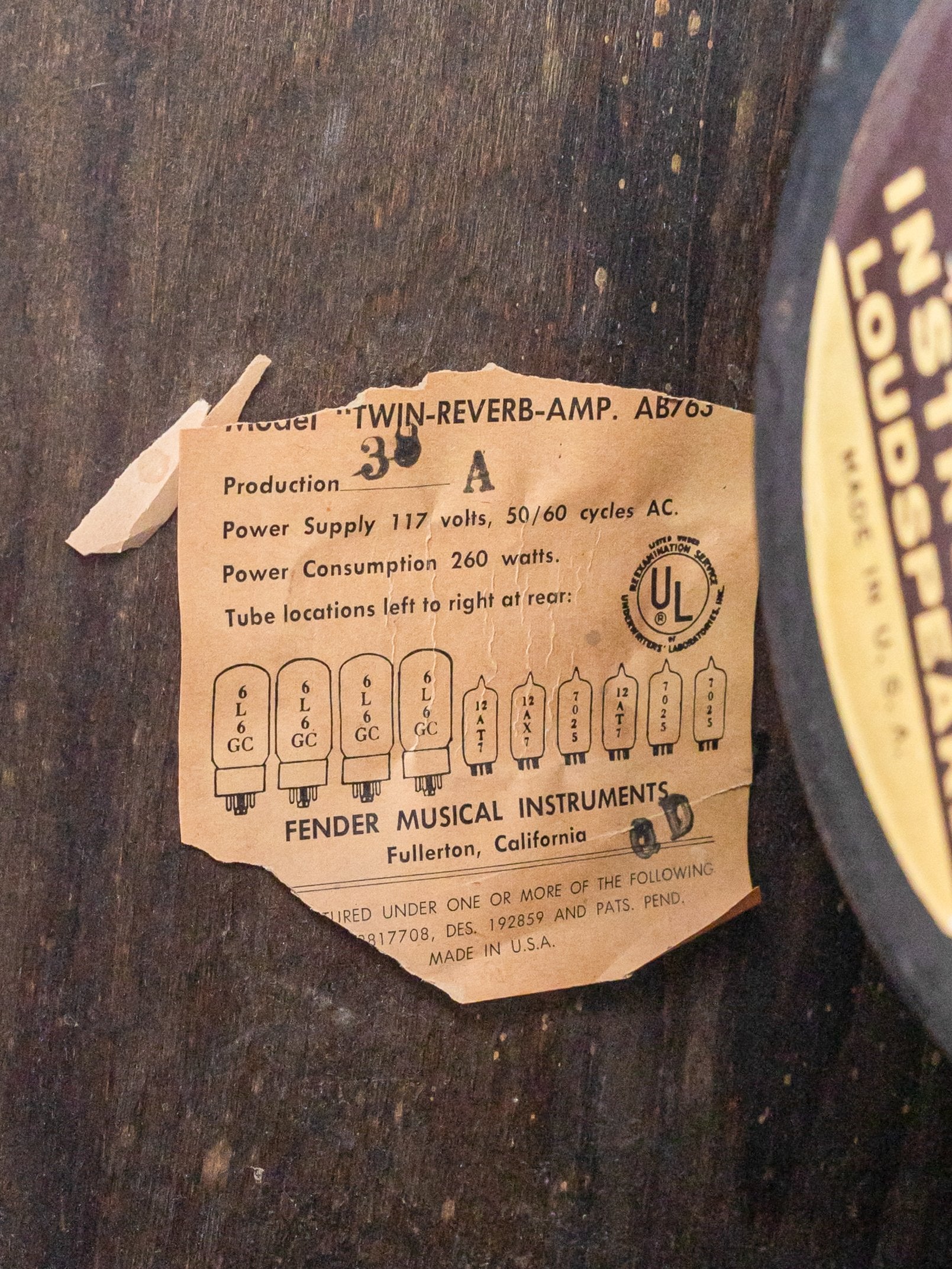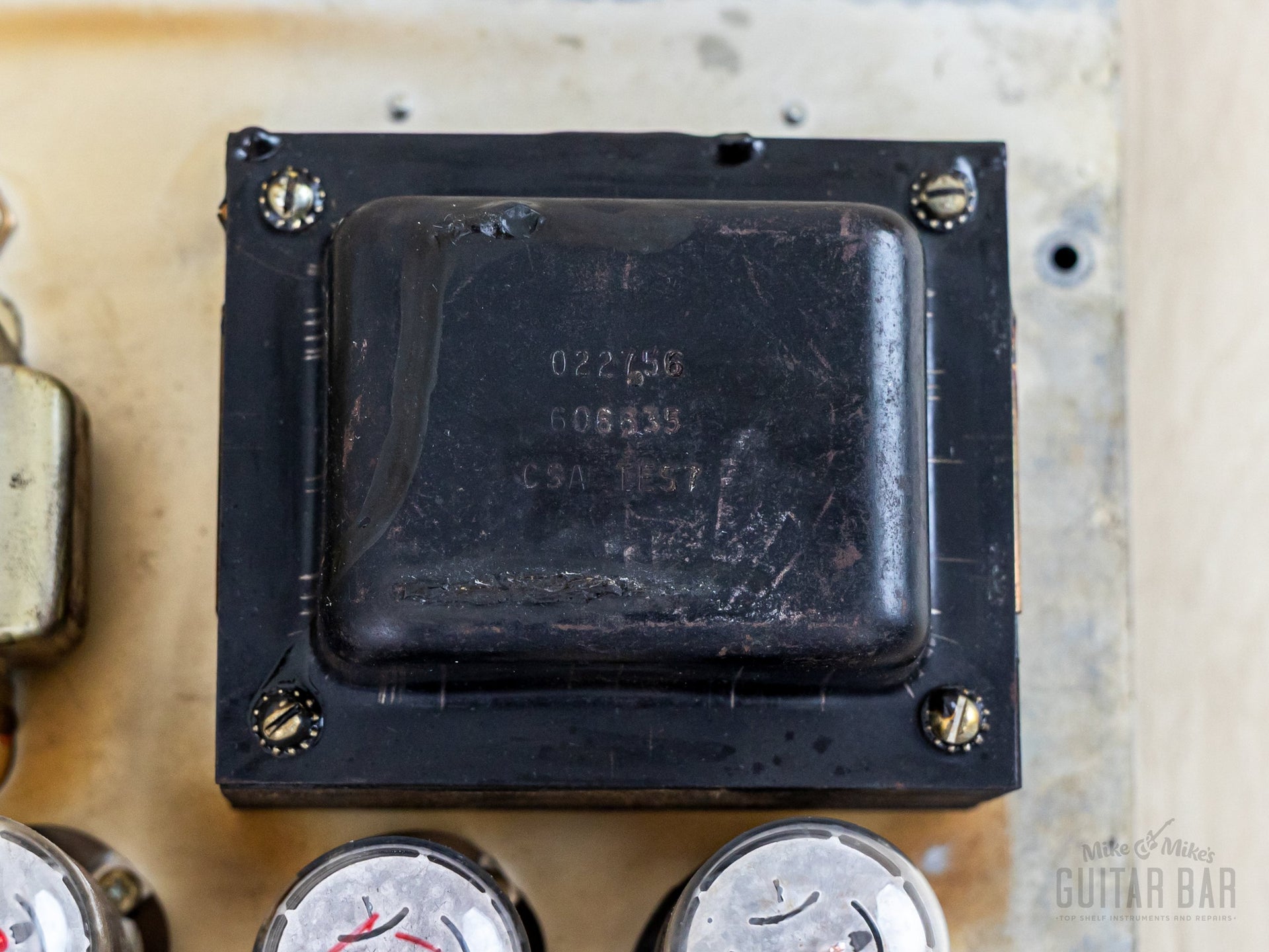 The circuit is extremely straight, retaining all of the original blue molded Ajax capacitors, a key part of the sweet, musical character of the Black Panel-era preamps. All of the original Schumacher-made transformers are intact, with date codes spanning mid-1966 to early ‘67. The original CTS pots have visible date codes from the 38th week of '66. The amp has a single new electrolytic capacitor in the preamp along with a new bias capacitor. Even the stock power supply caps are still intact and viable. The power tubes comprise three Sylvanias and a closely matched Fender-branded 6L6 with the same construction. The preamp features RCA, Amperex and GE-branded valves.