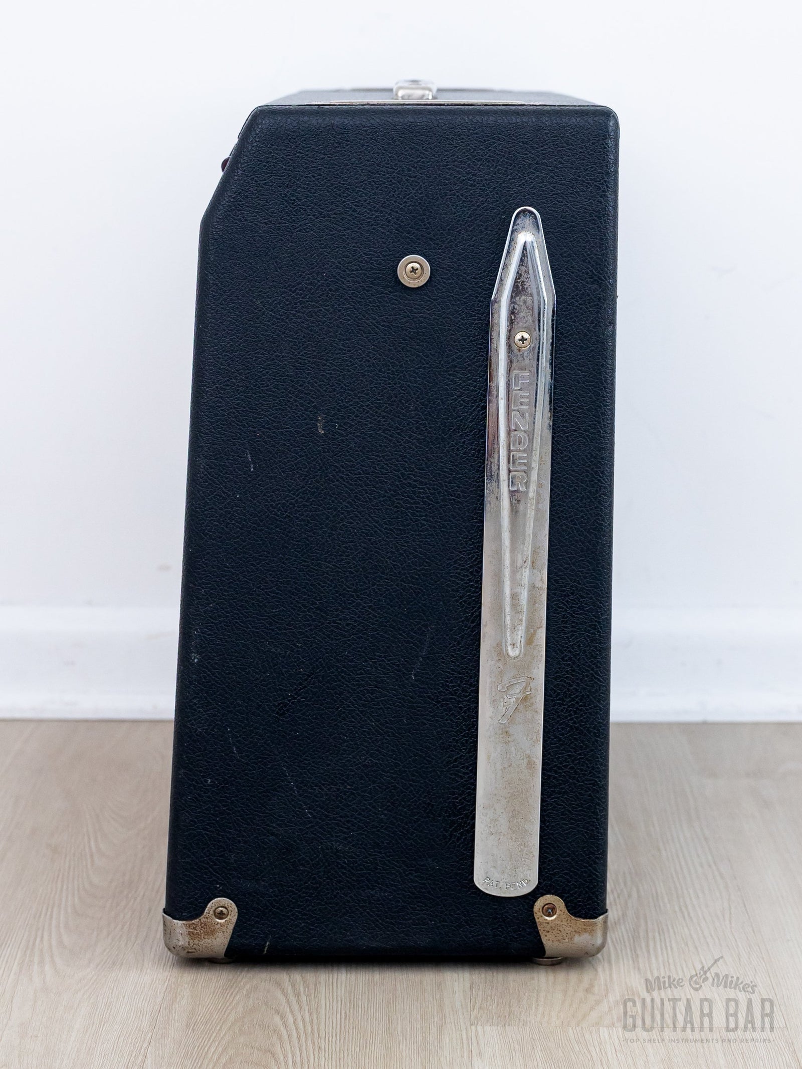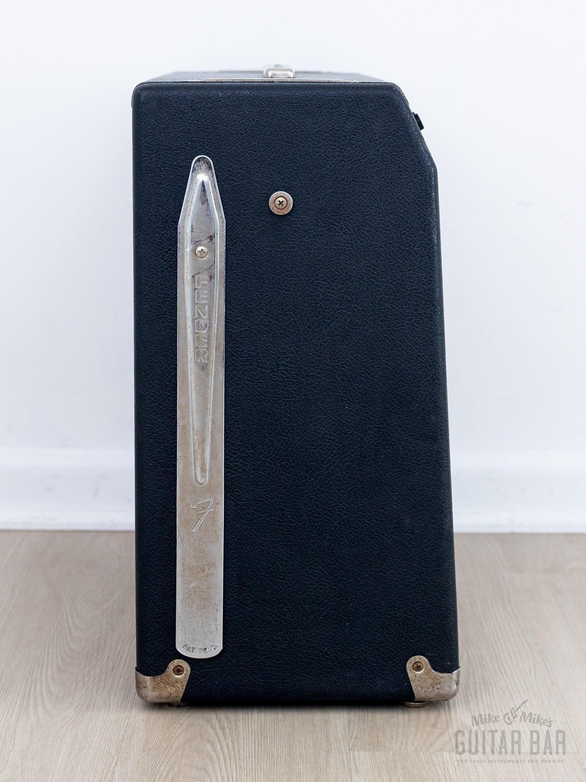 The original black tolex is exceptionally clean, and the silver sparkle grillcloth shows minimal wear and modest darkening. The faceplate is notably well-kept, retaining a full complement of original witch hat knobs. All of the original hardware is present, including the chrome tilt back legs, nickel corners, sphinx glides, handle, and raised Fender logo on the amp's face.