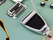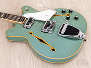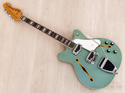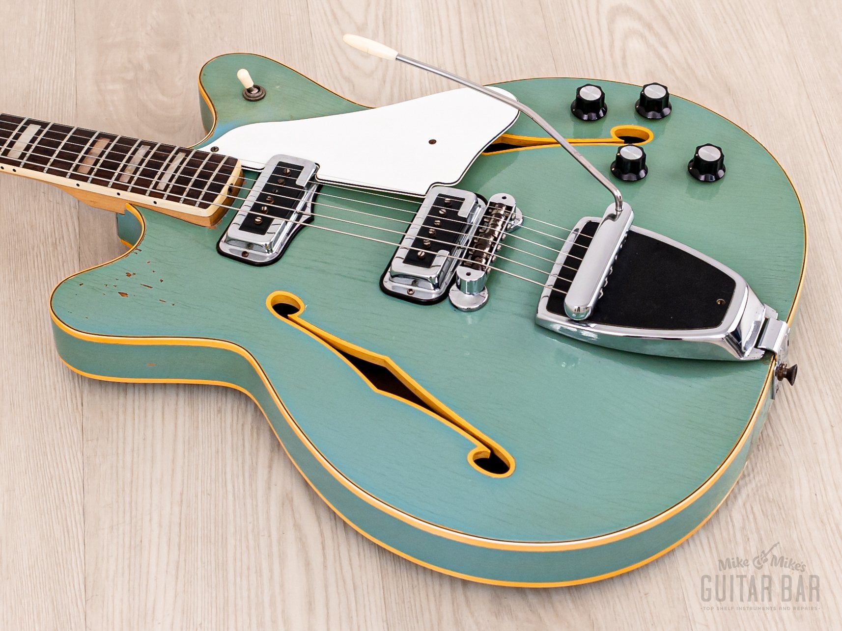 This Coronado is featherweight at 6lbs 7oz with a fully hollow maple body, offering a rich acoustic bark and crisp note attack. The DeArmond-made single coils are sweet and detailed with a sparkling treble register. The bridge pickup has more upper midrange bite, while the neck pickup has a mellow percussive cut. This Coronado II has been professionally setup here at Mike & Mike’s Guitar Bar with 11-49 strings, low action, and accurate intonation.