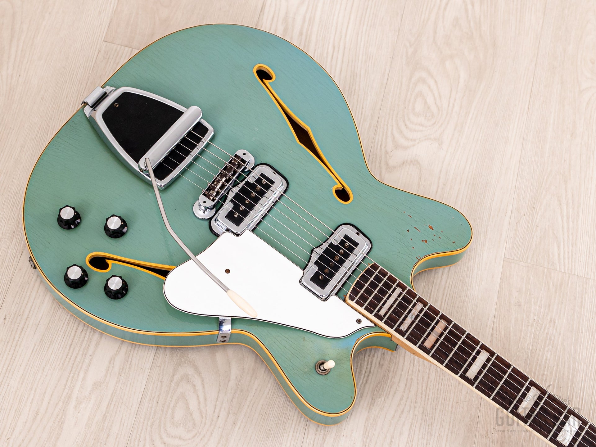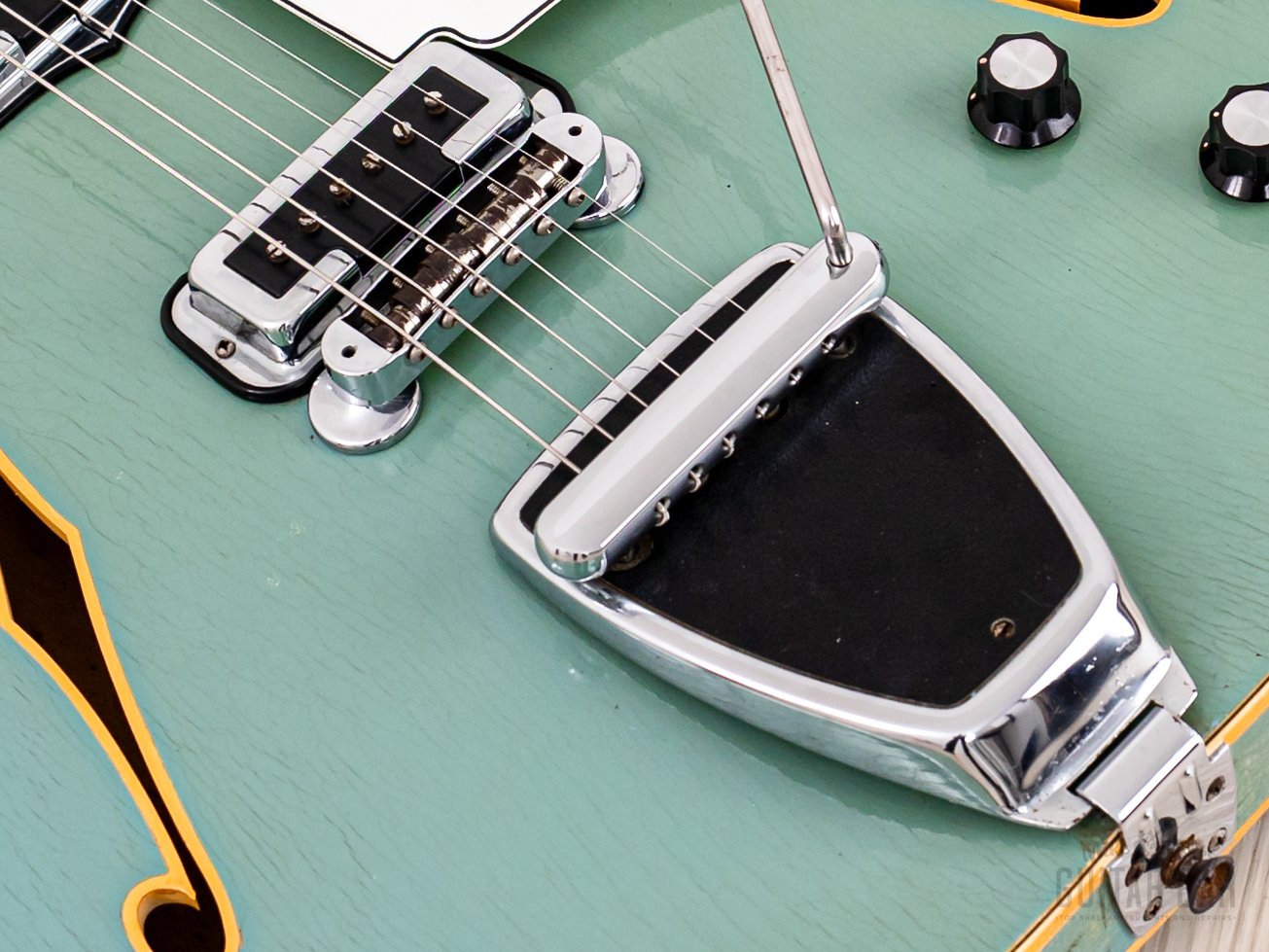 -Hardware: Floating bridge with Mustang-style barrel saddles, vibrato unit w/ arm