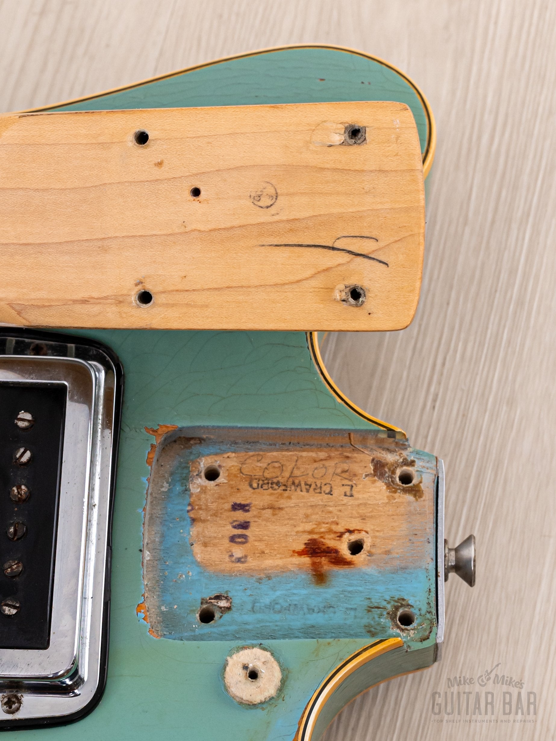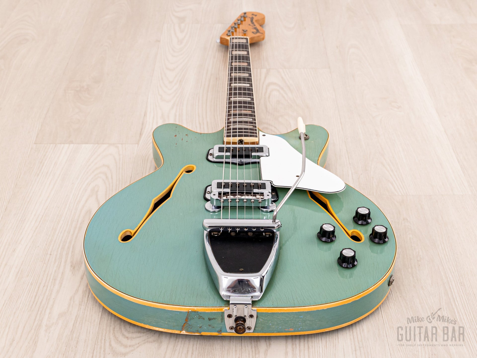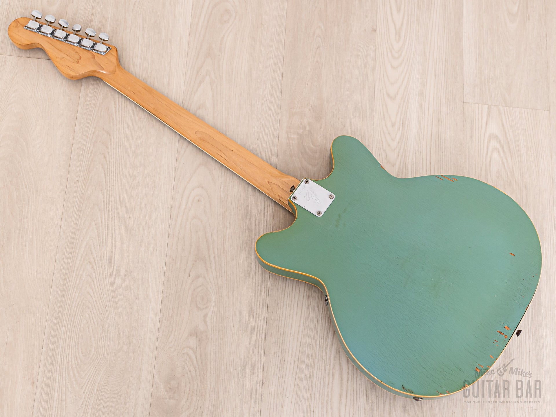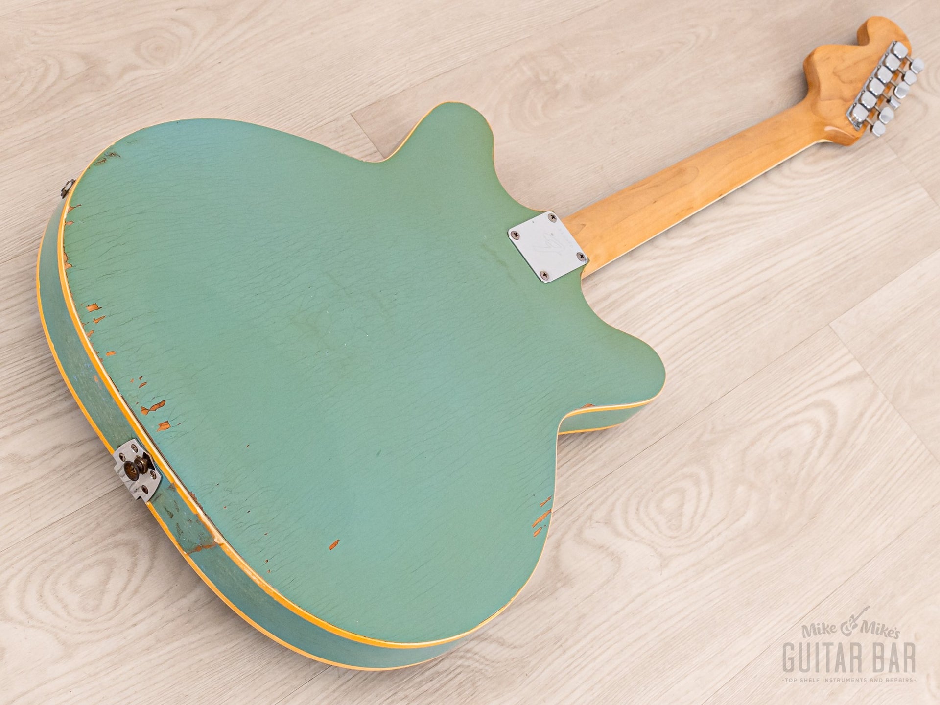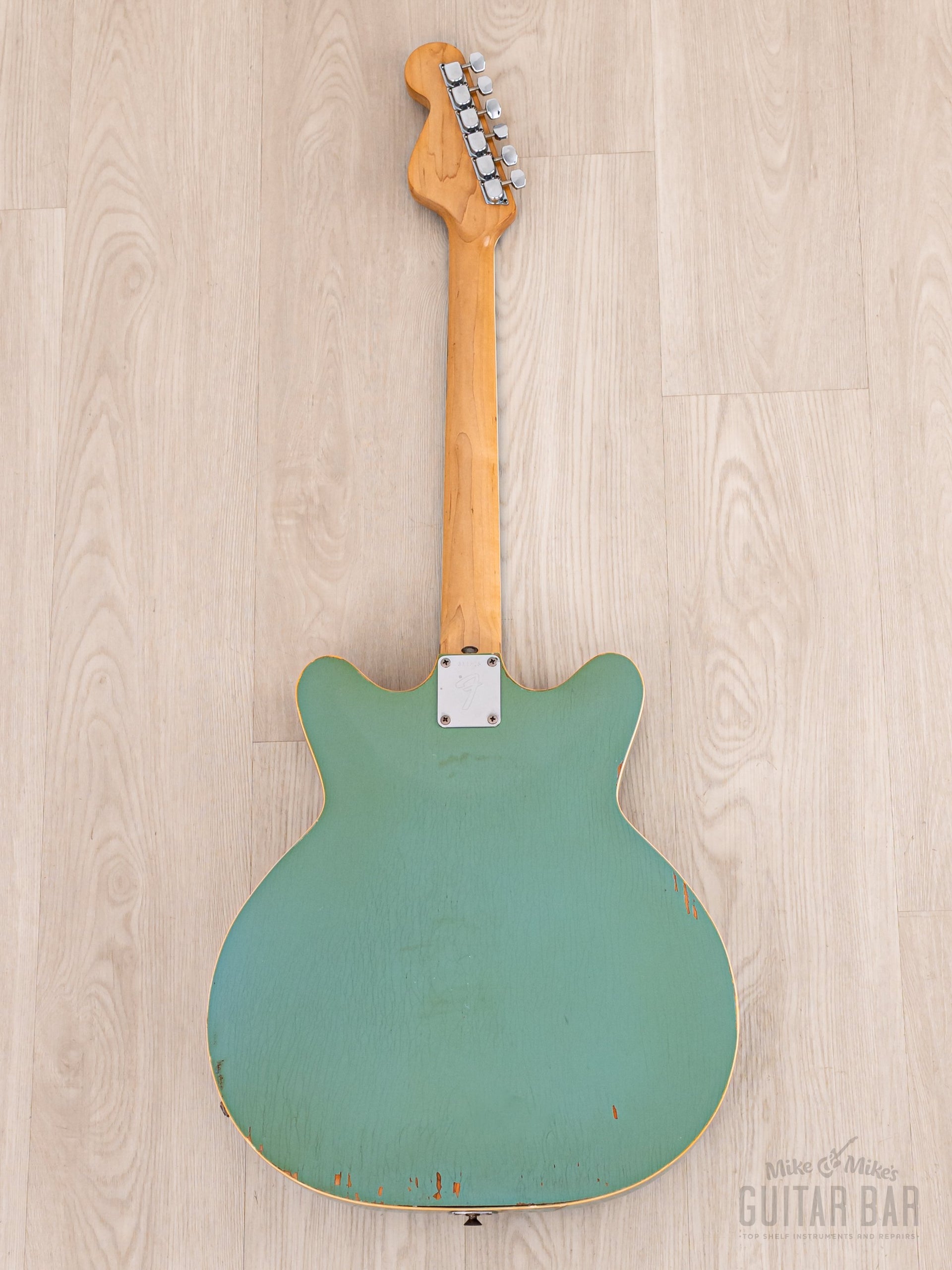 Notable for being finished in nitro lacquer, despite Fender largely abandoning this practice in 1968, this Coronado’s original custom color Sonic Blue finish exhibits extensive tight and wavy lacquer checking across the body, with notable greening of the clear coat and some minor (stabilized) finish chipping along the back lower bout body edge and on the bass-side cutaway on top. The finish is otherwise notably well-kept, with a bit of strap-related wear to the left of the tailpiece hinge and zero buckle wear on the back. The nitro gloss on the neck profile is flawless.