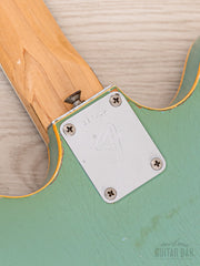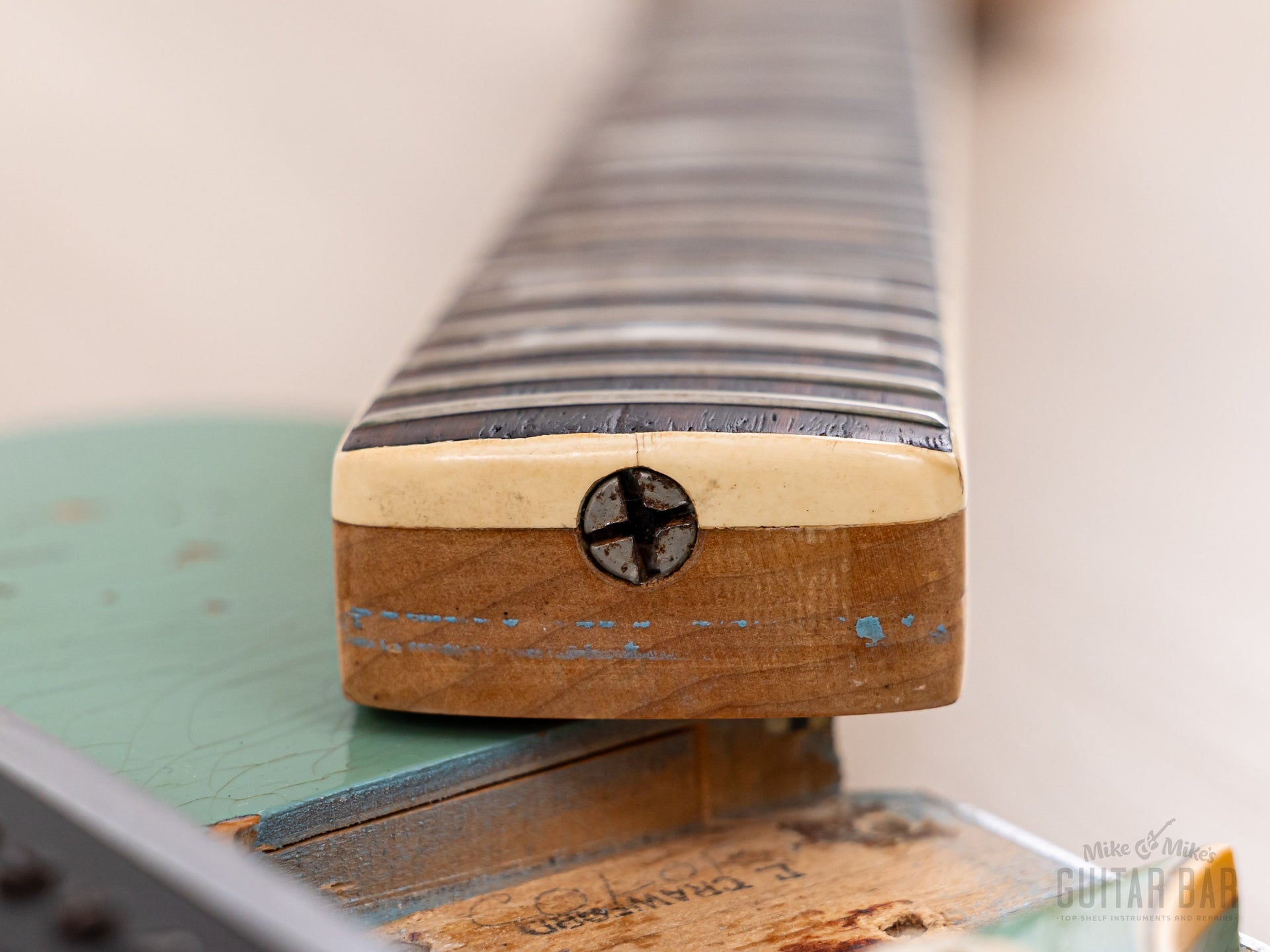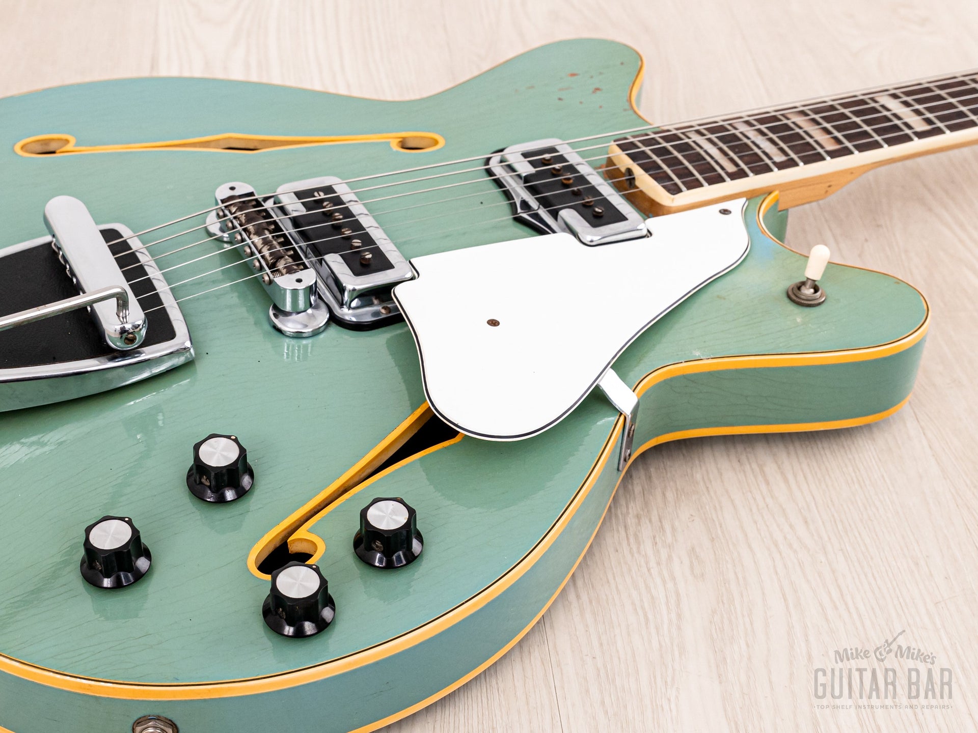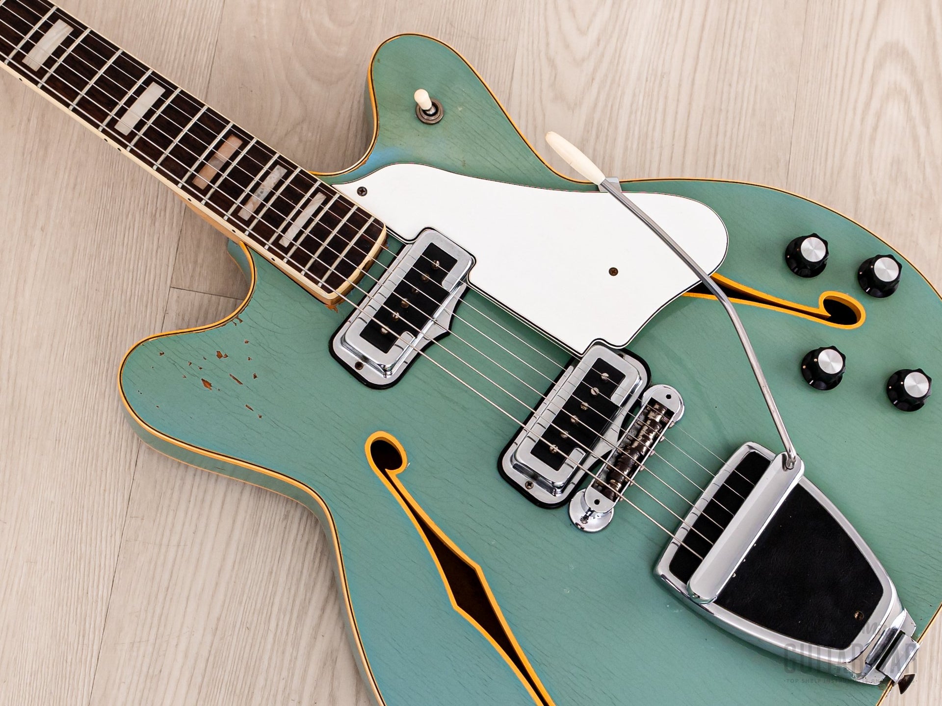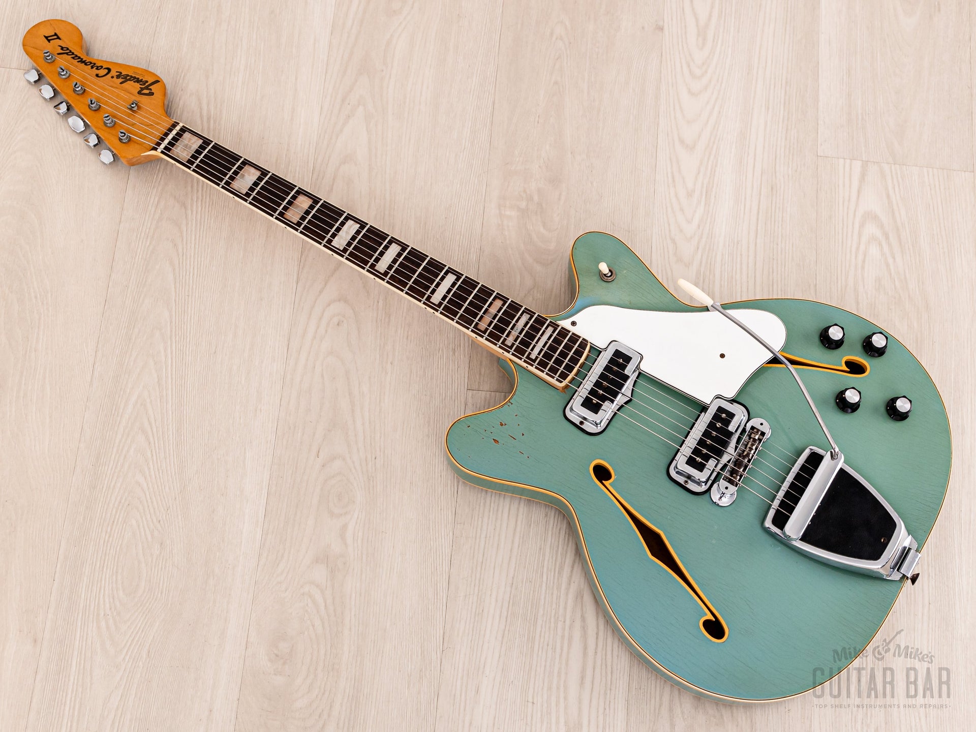 Notable for being finished in nitro lacquer, despite Fender largely abandoning this practice in 1968, this Coronado’s original custom color Sonic Blue finish exhibits extensive tight and wavy lacquer checking across the body, with notable greening of the clear coat and some minor (stabilized) finish chipping along the back lower bout body edge and on the bass-side cutaway on top. The finish is otherwise notably well-kept, with a bit of strap-related wear to the left of the tailpiece hinge and zero buckle wear on the back. The nitro gloss on the neck profile is flawless.