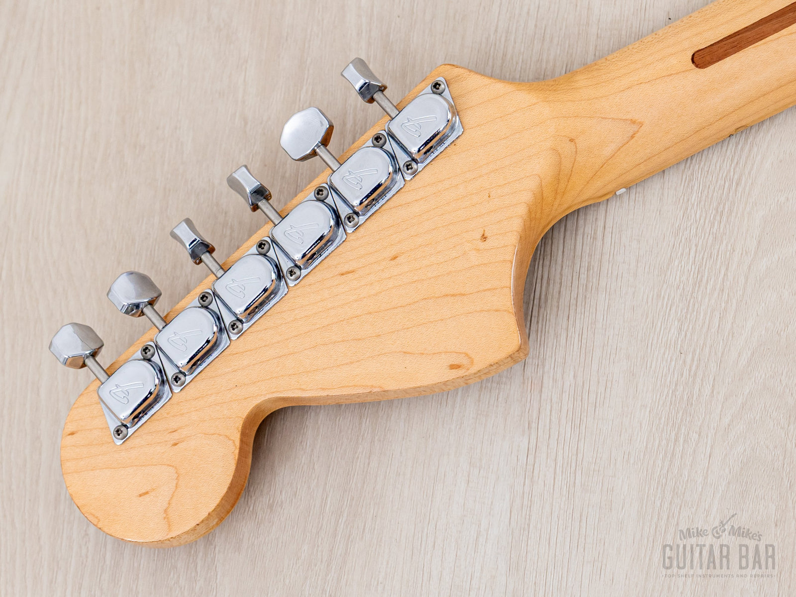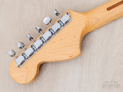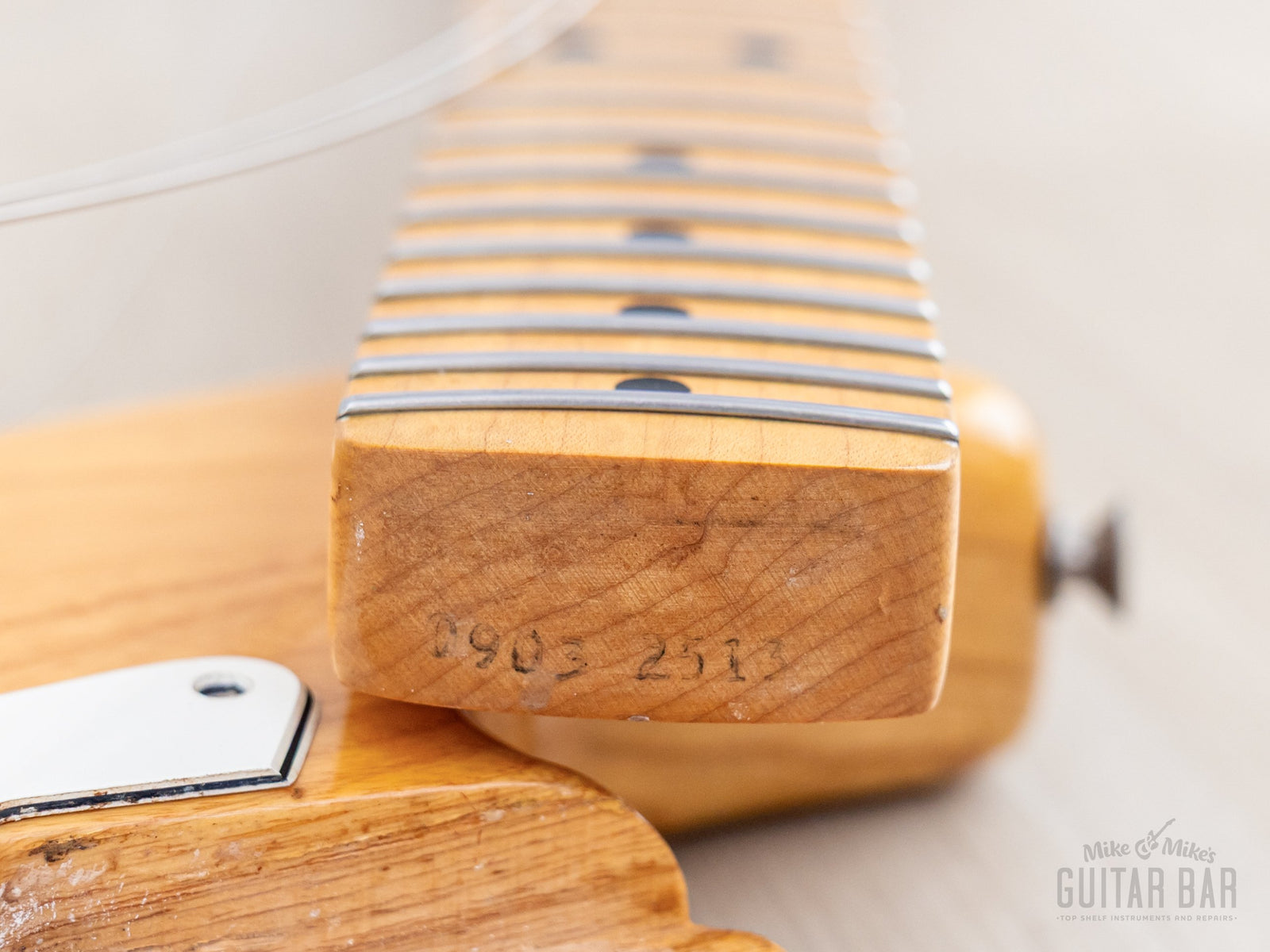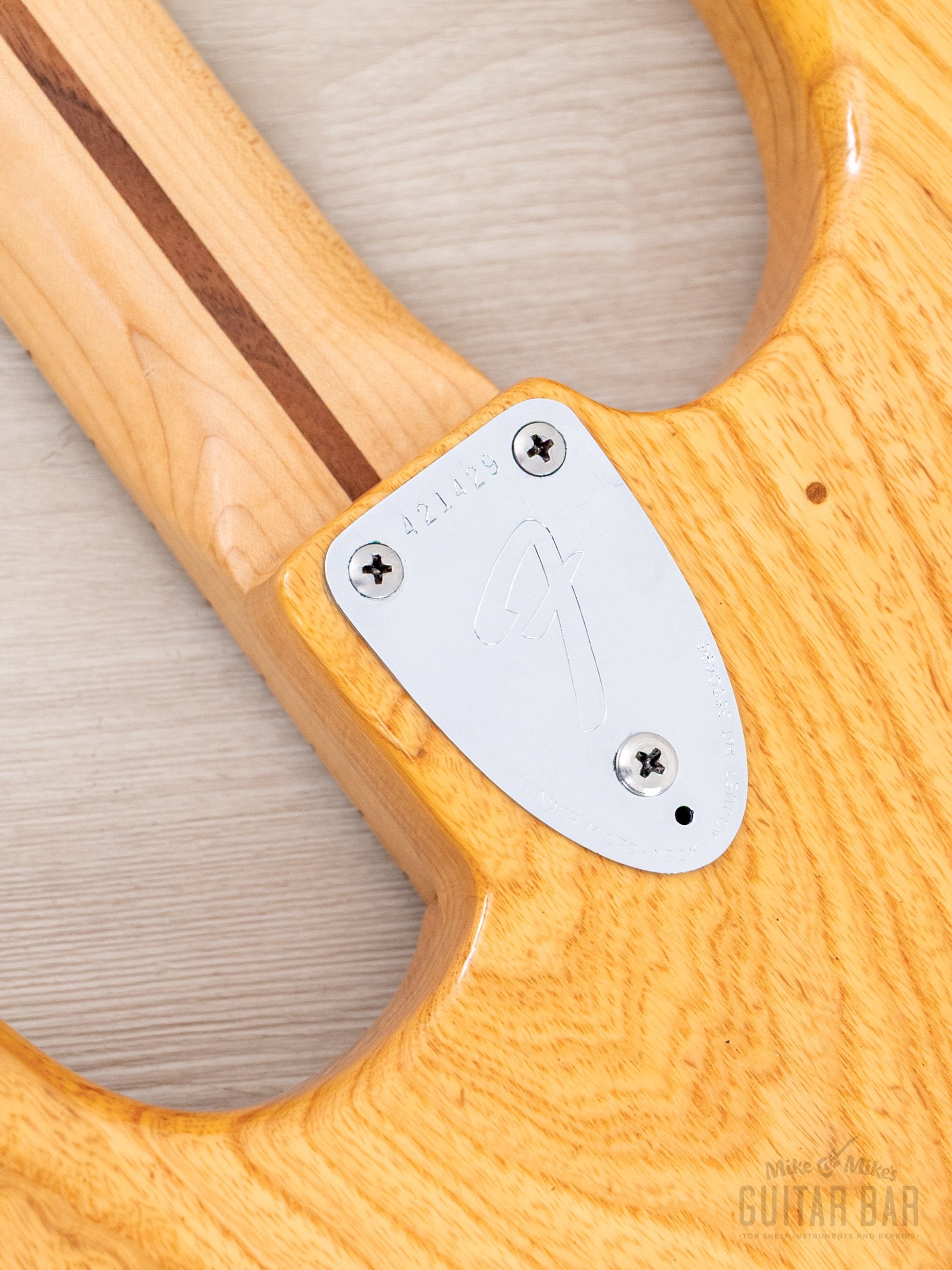 The gloss Natural finish is extremely clean, with a bit of vertical checking central to the back, light buckle scuffing on the back (largely relegated to the trem cavity cover) and just a few faint marks on the top and body perimeter. The original finish on the neck profile is smooth and clean, with a worn-in, easy-playing feel, while the fingerboard was refinished as part of the refret process.