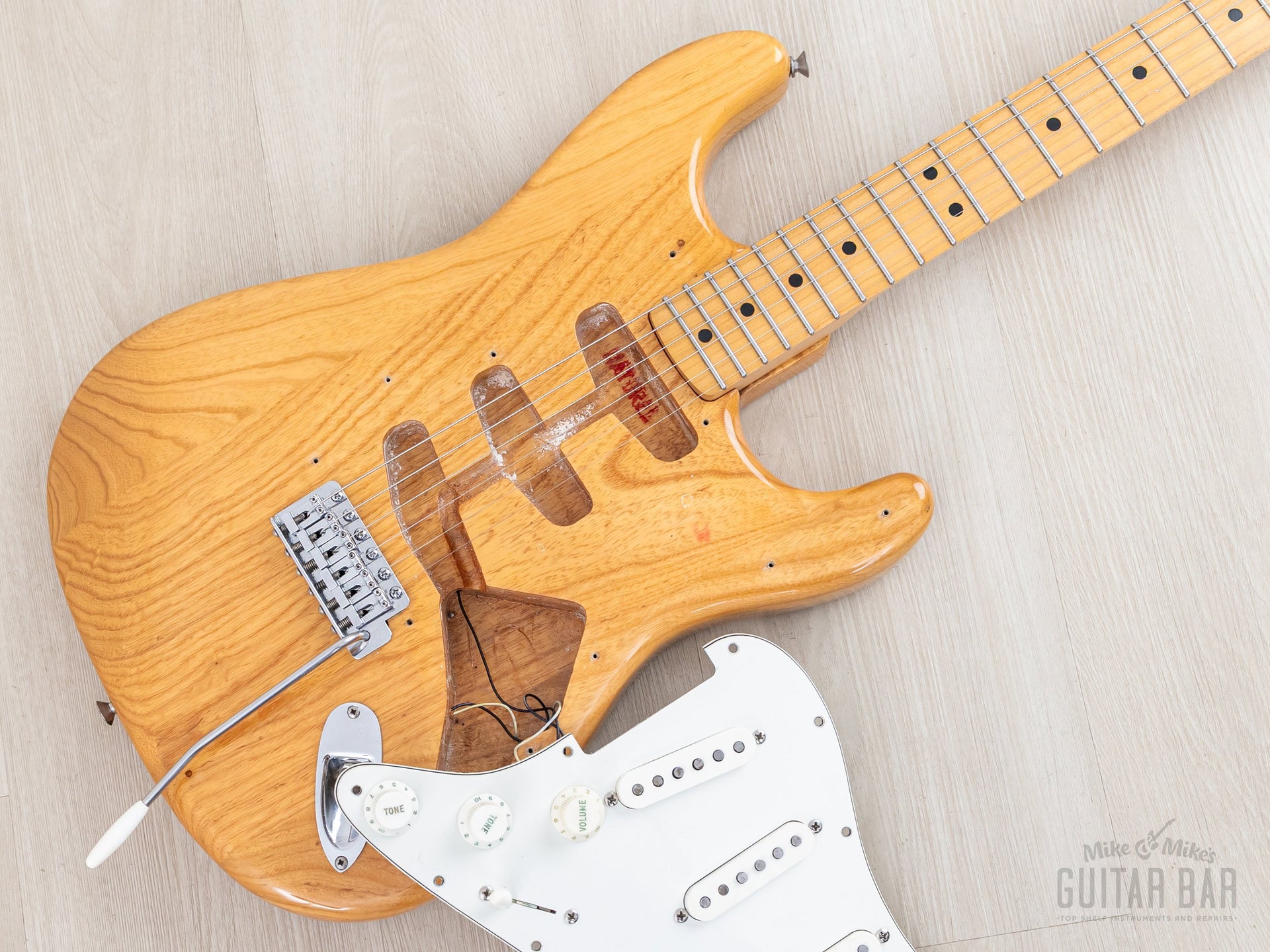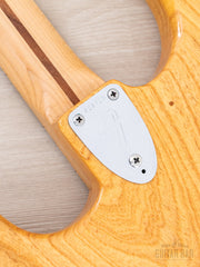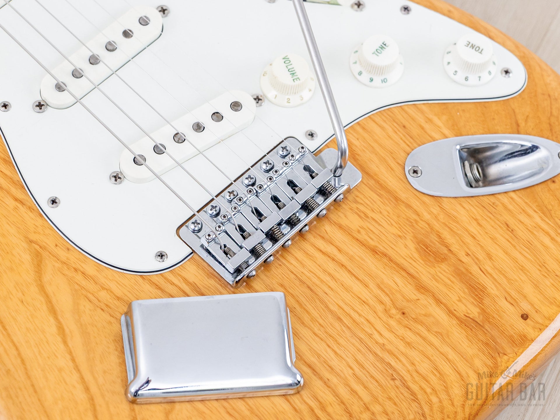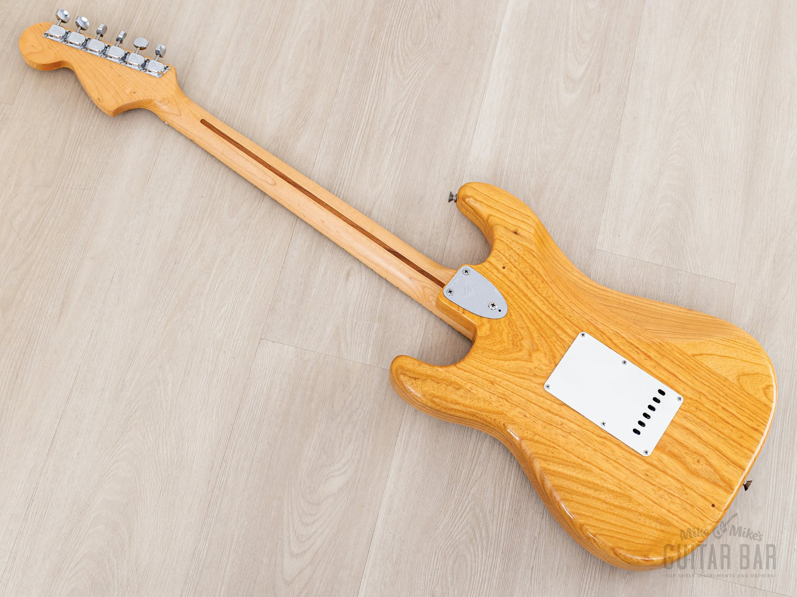 The gloss Natural finish is extremely clean, with a bit of vertical checking central to the back, light buckle scuffing on the back (largely relegated to the trem cavity cover) and just a few faint marks on the top and body perimeter. The original finish on the neck profile is smooth and clean, with a worn-in, easy-playing feel, while the fingerboard was refinished as part of the refret process.