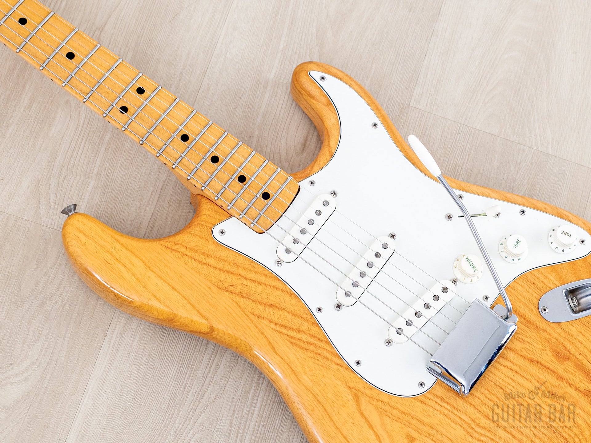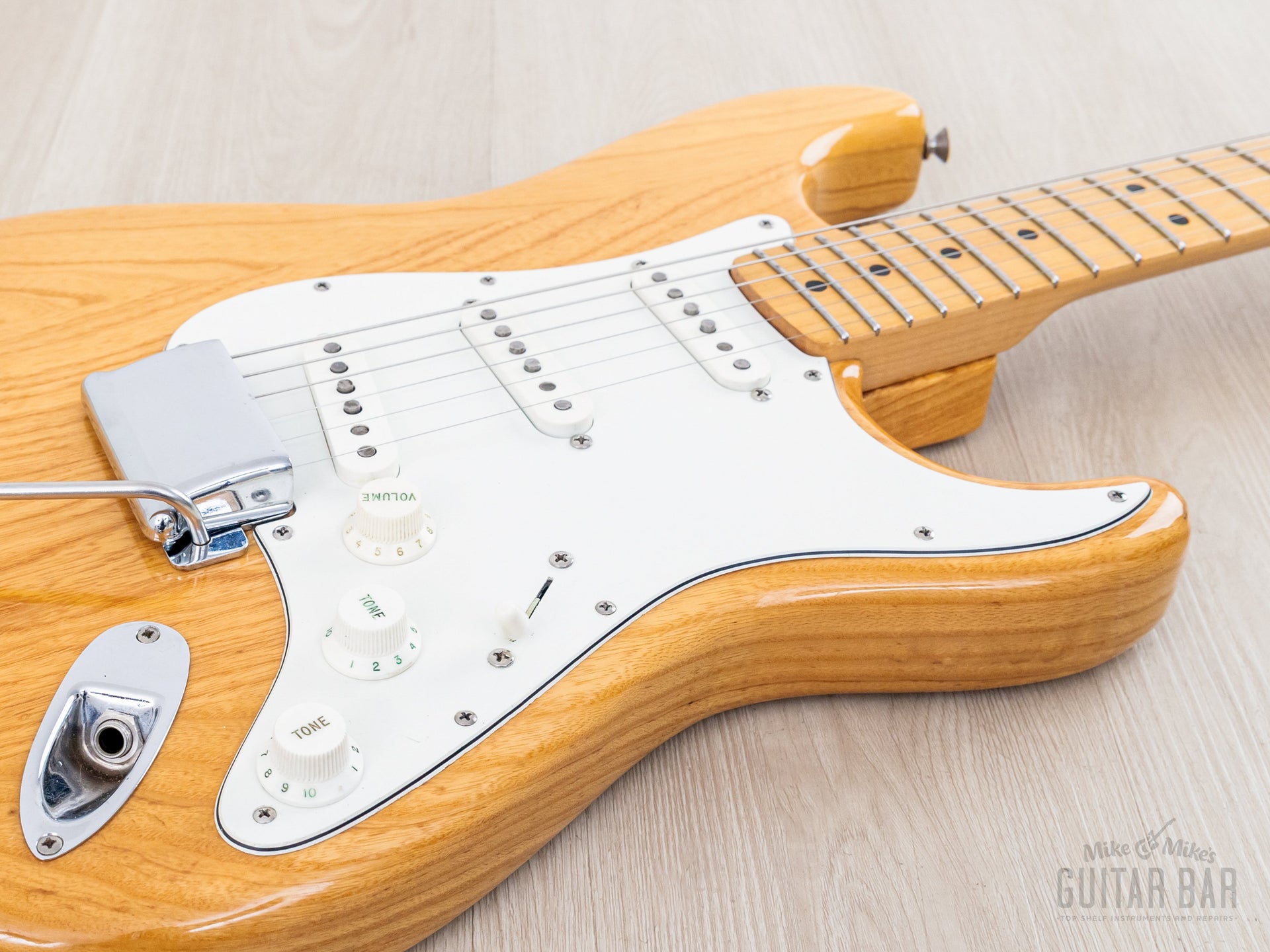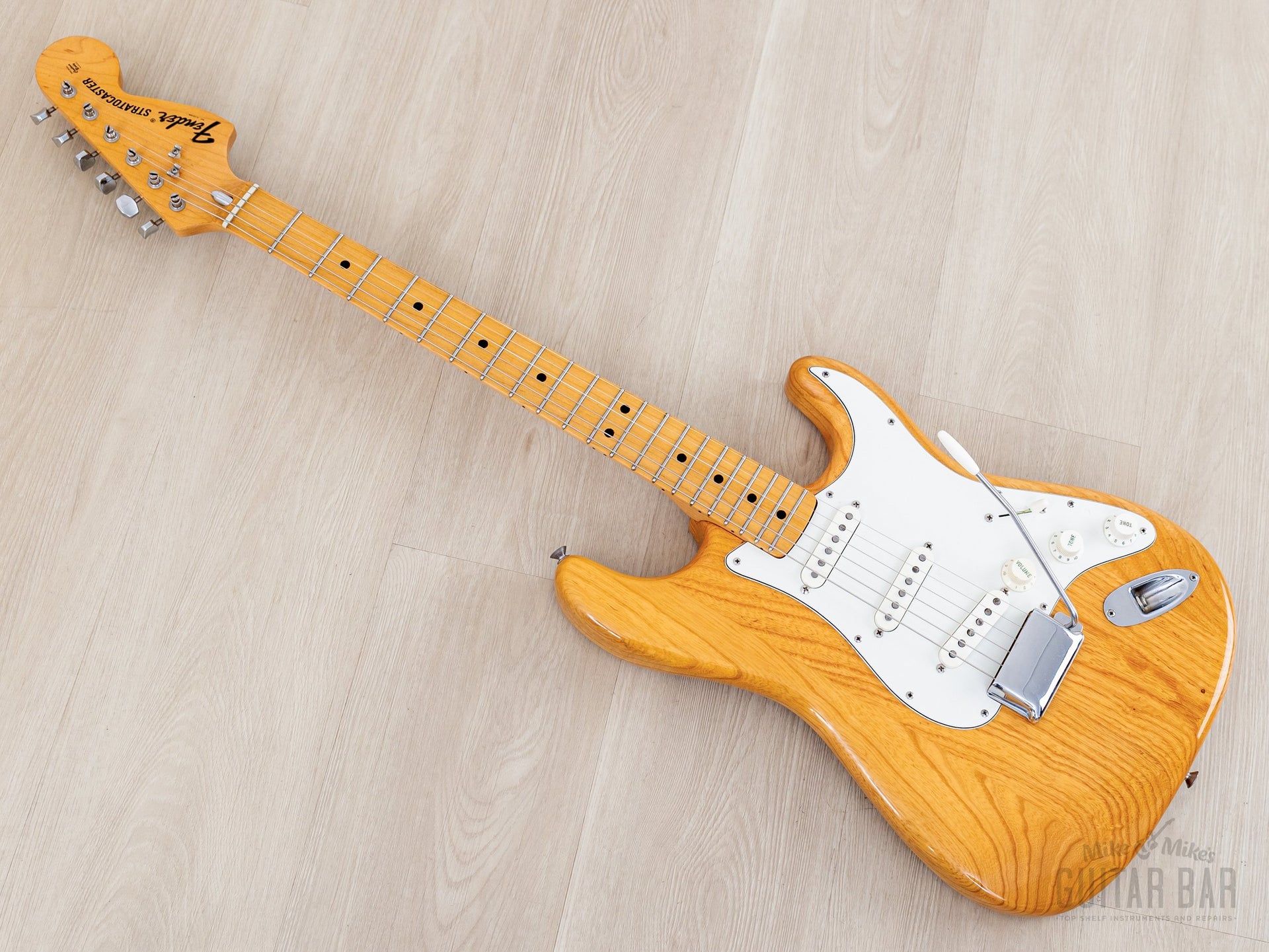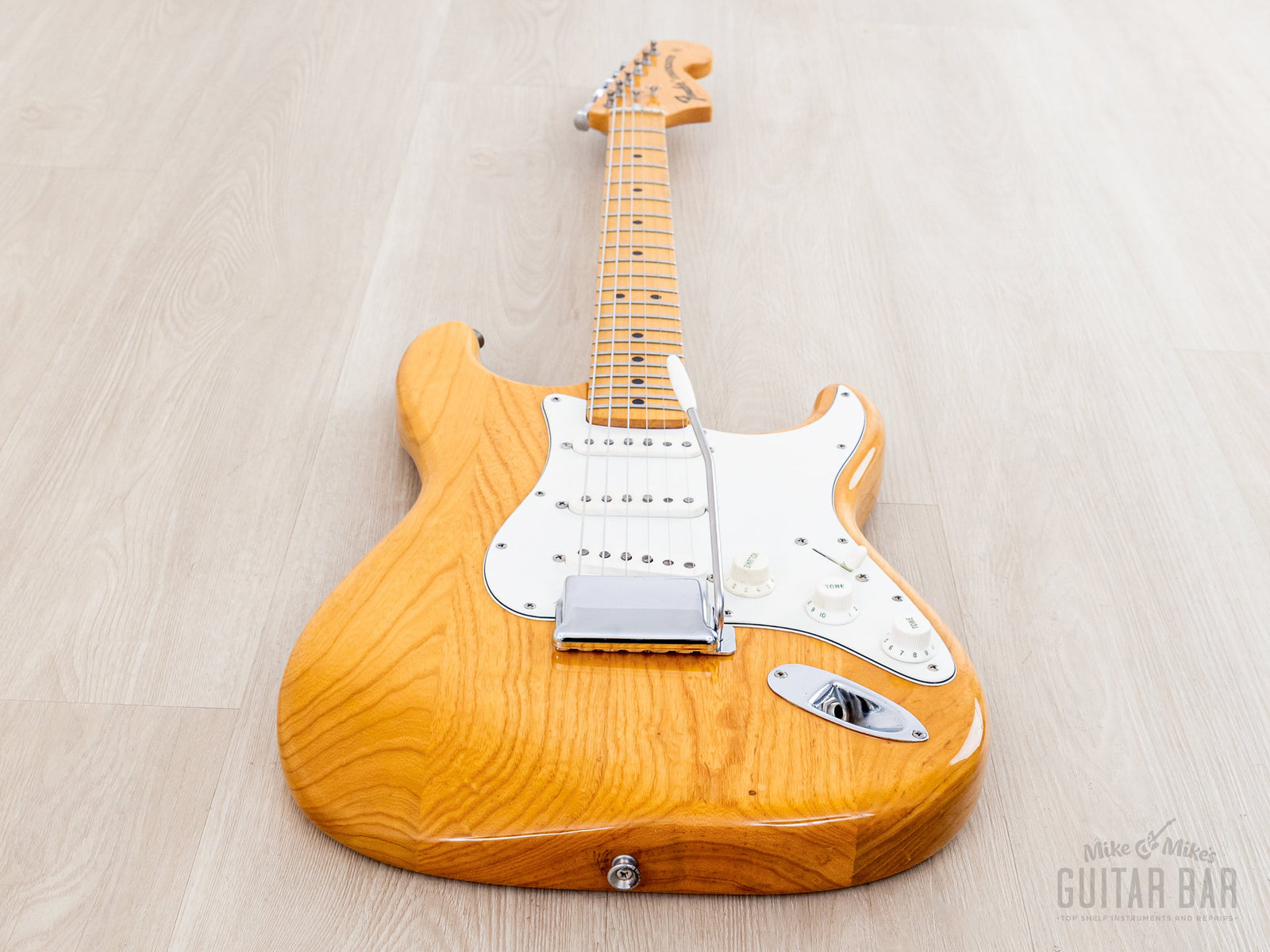 Weighing 8lbs 4oz, the ash body and one-piece maple neck yields plenty of treble detail, complex midrange, and round, focused bass register punch. The gray bobbin pickups deliver a distinct sound in each position on the upgraded five-way switch; the neck pickup is bold and deep, with a clear and spanky middle position, and a bridge pickup that offers both plenty of body and treble zing, with a fuller midrange character than most Strat bridge pickups, and the in-between positions yield a particularly honky quack. This Stratocaster benefits from a professional setup here at Mike & Mike's Guitar Bar with fresh 10-46 strings, low action, and accurate intonation.