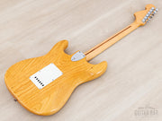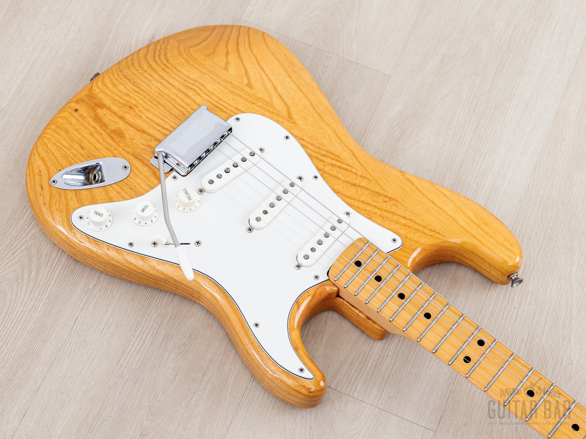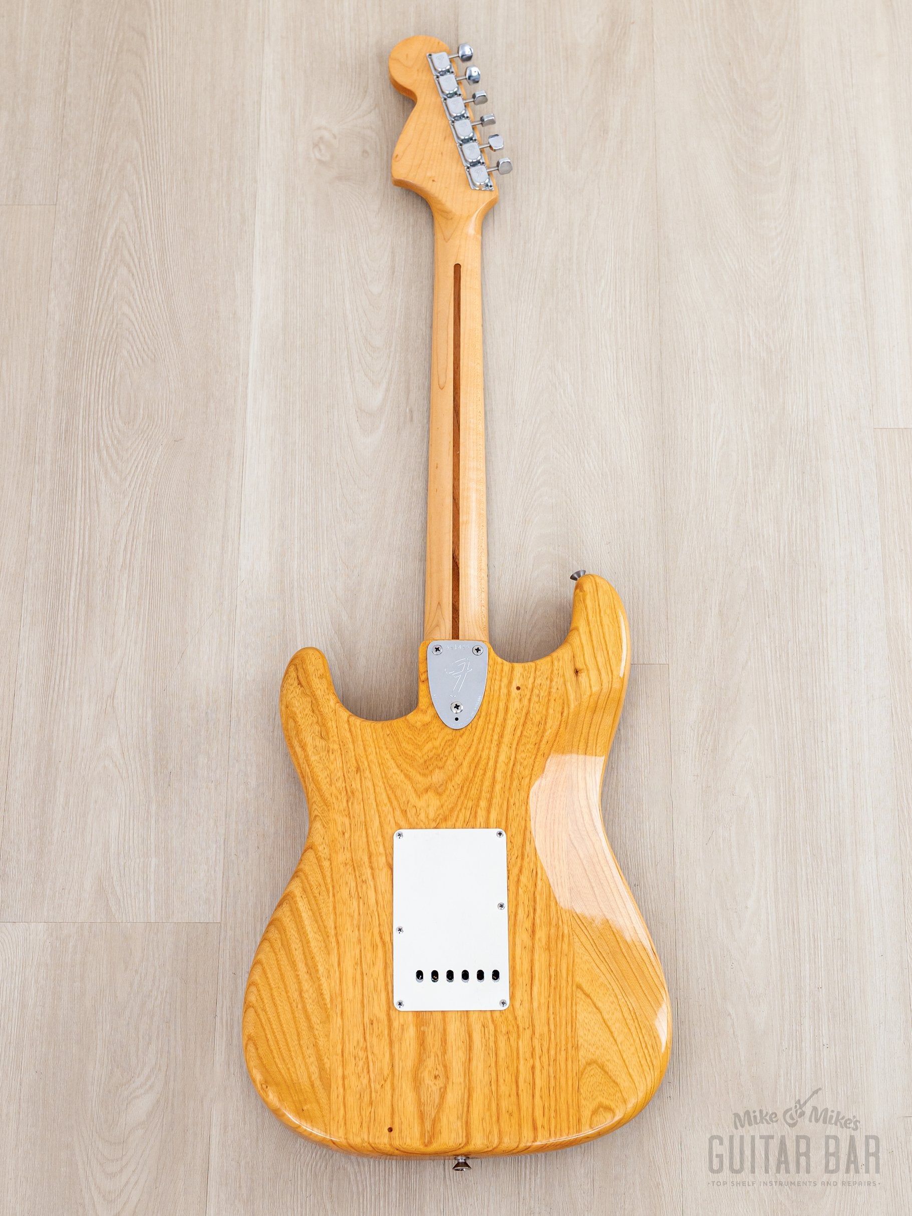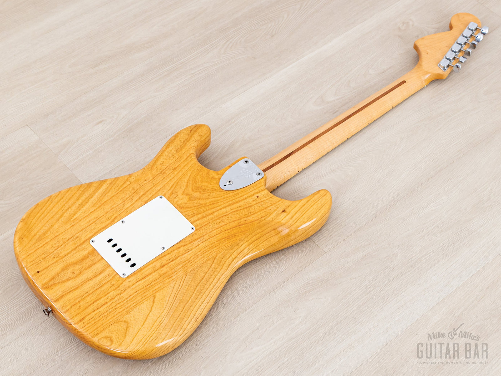 Weighing 8lbs 4oz, the ash body and one-piece maple neck yields plenty of treble detail, complex midrange, and round, focused bass register punch. The gray bobbin pickups deliver a distinct sound in each position on the upgraded five-way switch; the neck pickup is bold and deep, with a clear and spanky middle position, and a bridge pickup that offers both plenty of body and treble zing, with a fuller midrange character than most Strat bridge pickups, and the in-between positions yield a particularly honky quack. This Stratocaster benefits from a professional setup here at Mike & Mike's Guitar Bar with fresh 10-46 strings, low action, and accurate intonation.
