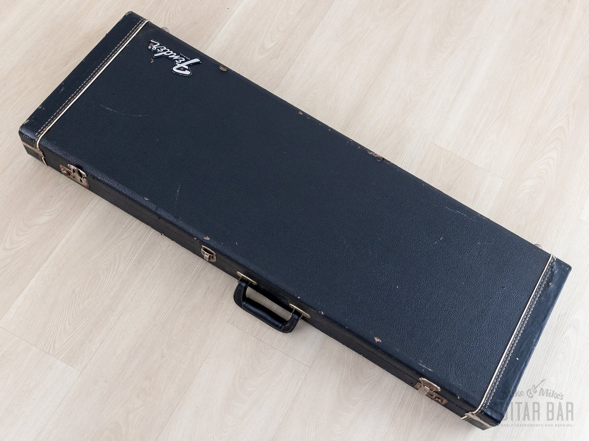 The original black tolex hardshell case is included. Two of the original latches are functional, the original handle is intact, and the raised Fender logo is present on the lid.
