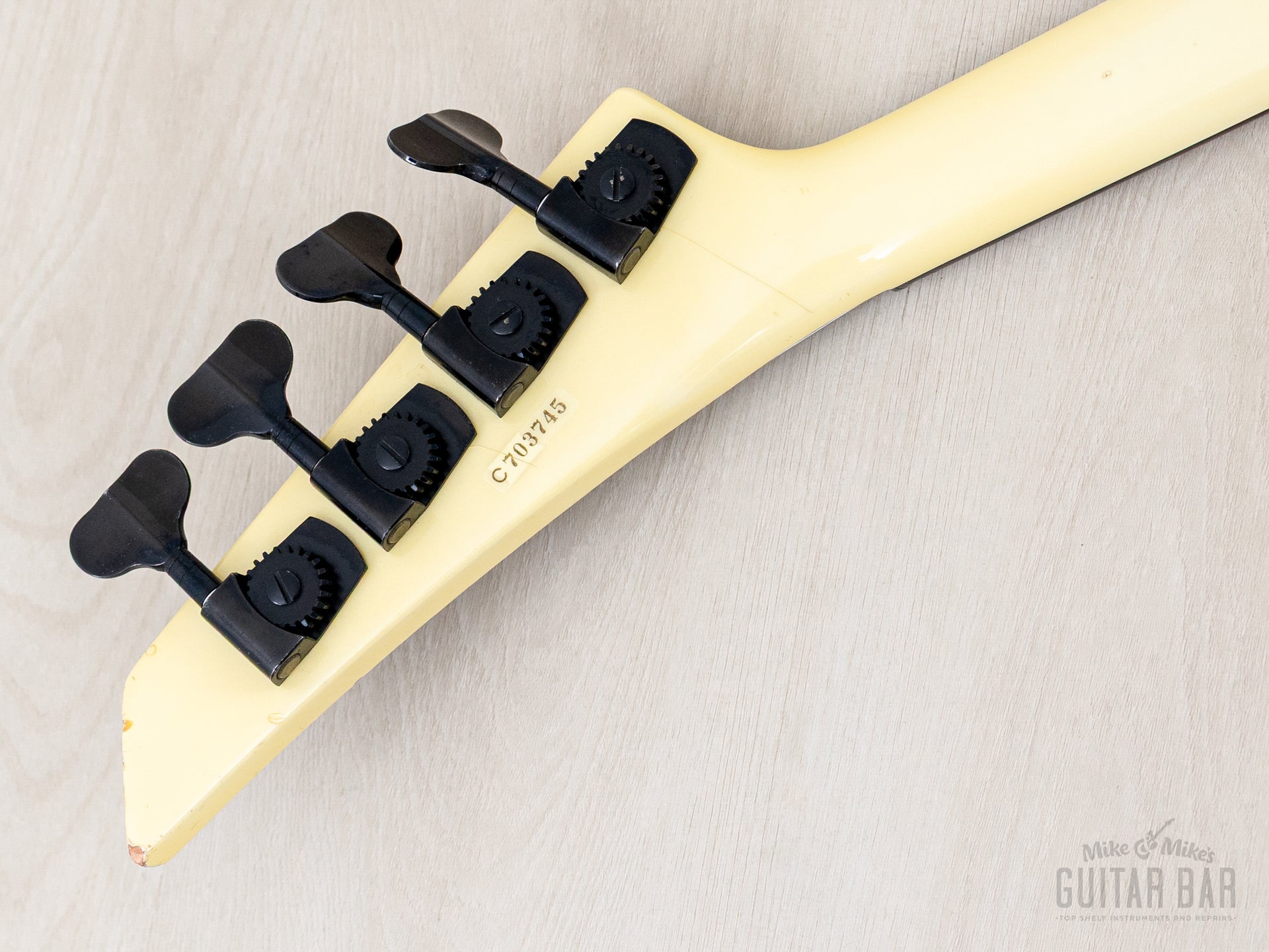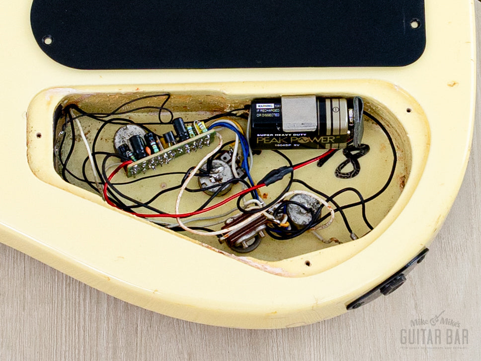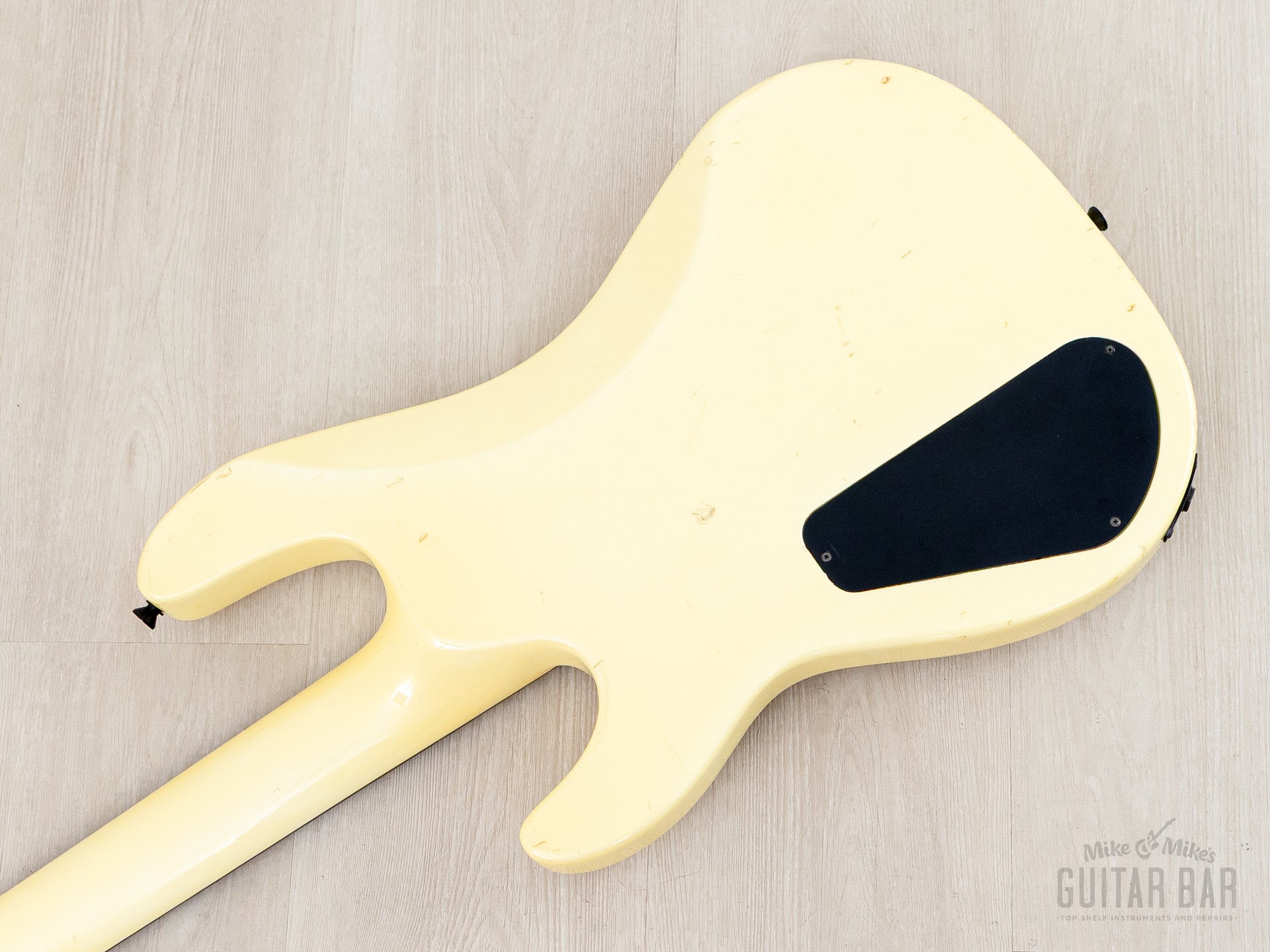 The gloss Pearl White finish exhibits uniform yellowing of the clear coat, with light buckle scuffing central to the back and a few dings, including one small chip adjacent to the output jack. The gloss finish on the neck profile is smooth and clean, with limited checking and a couple small dings on the peghead.
