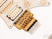 The HSH pickup array includes DiMarzio Evolution humbuckers and a centrally located Evolution single coil, designed for maximum impact, power, and versatility. The neck pickup is fat and punchy, while the bridge is tight and aggressive. Both pickups have DiMarzio’s dual-resonance configuration to reproduce more harmonic overtones than conventional humbuckers, while their excellent presence and definition help slice through the densest mix. With five-way switching and the ability to pair the single coil with either humbucker for greater clarity and top-end snap, this JEM has a broad tonal spectrum, ideal for singing high gain or pristine, complex-sounding cleans. Weighing 8lbs 1oz, this JEM7V has been professionally setup here at Mike & Mike’s Guitar Bar with 10-46 strings, slinky action, and accurate intonation.