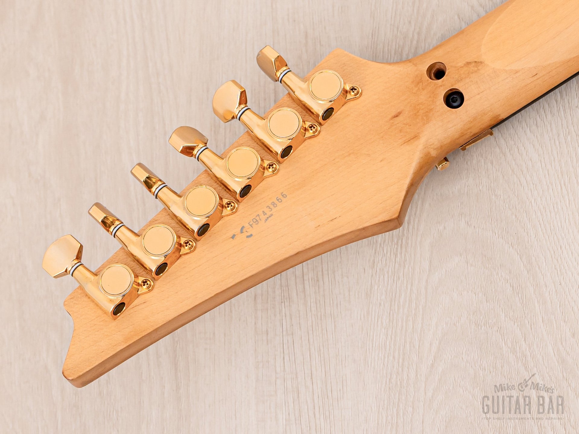 Up for sale, a 1997 Ibanez J. Craft JEM7V Steve Vai signature model in near-mint, 100% original condition and in perfect working order. Crafted in Japan at the Fujigen factory as part of Ibanez’s top-tier J Craft series, this early example of the JEM7V features an alder body with basswood veneers and monkey grip, a one-piece flame maple neck, and a slab 24-fret ebony fretboard (a feature only available on early models) with Tree of Life inlay and scalloping on the last four frets.