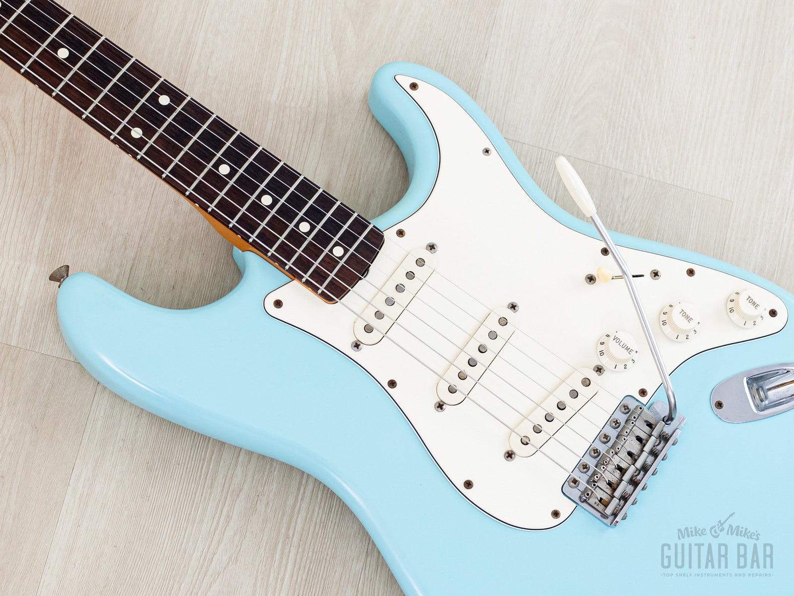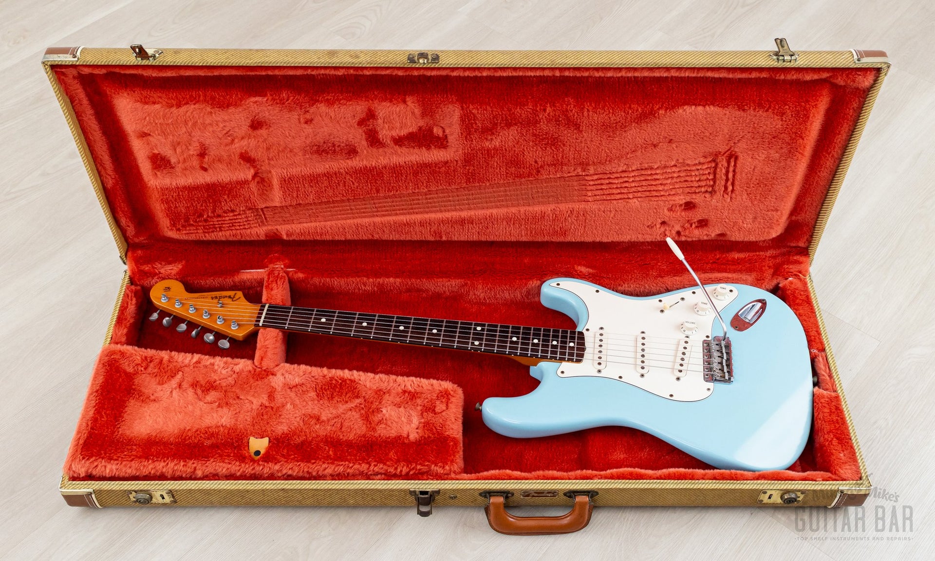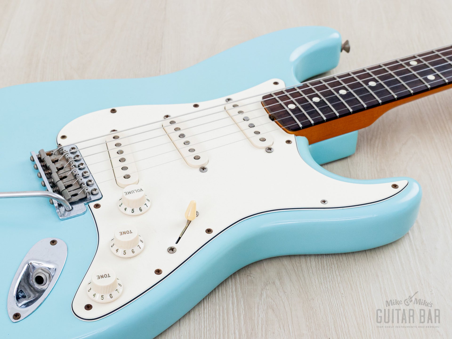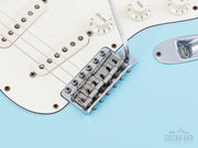 Weighing 7lbs 14oz, tonewoods include an alder body, maple neck and slab rosewood fretboard, naturally balanced, clear and sweet-sounding. The Van Zandt Vintage Plus single coils feature black fiber bobbins, staggered Alnico V magnets, and cloth-covered leads, channeling the best qualities of an early ‘60s Pre-CBS Strat, with ample sparkle and snap, plus a bit more heft in the midrange. The bridge pickup has a spanky cut, and the neck pickup has a throaty bell-like chime. This Stratocaster benefits from a professional setup here at Mike & Mike's Guitar Bar with 10-46 strings, low action, and accurate intonation.
