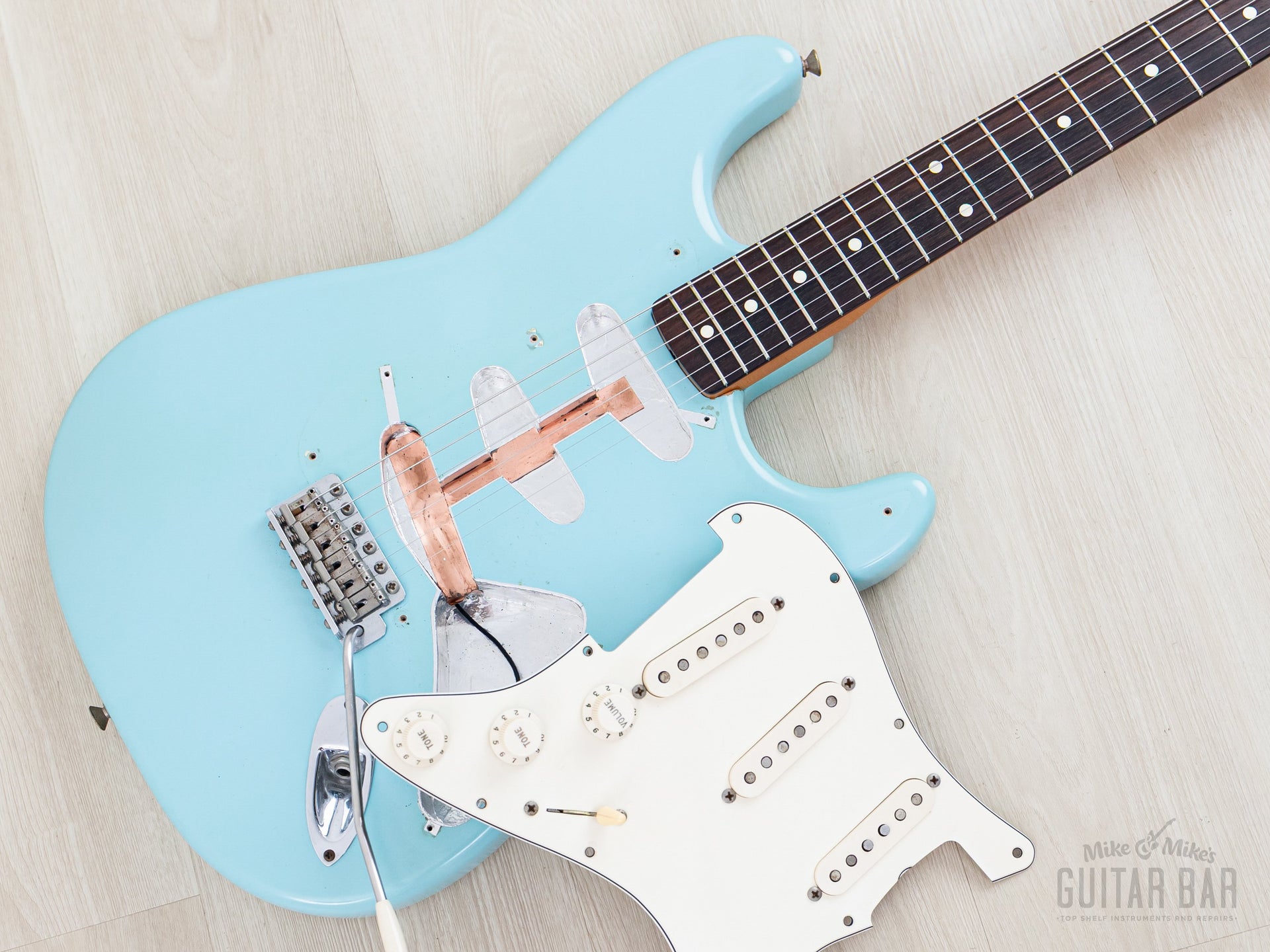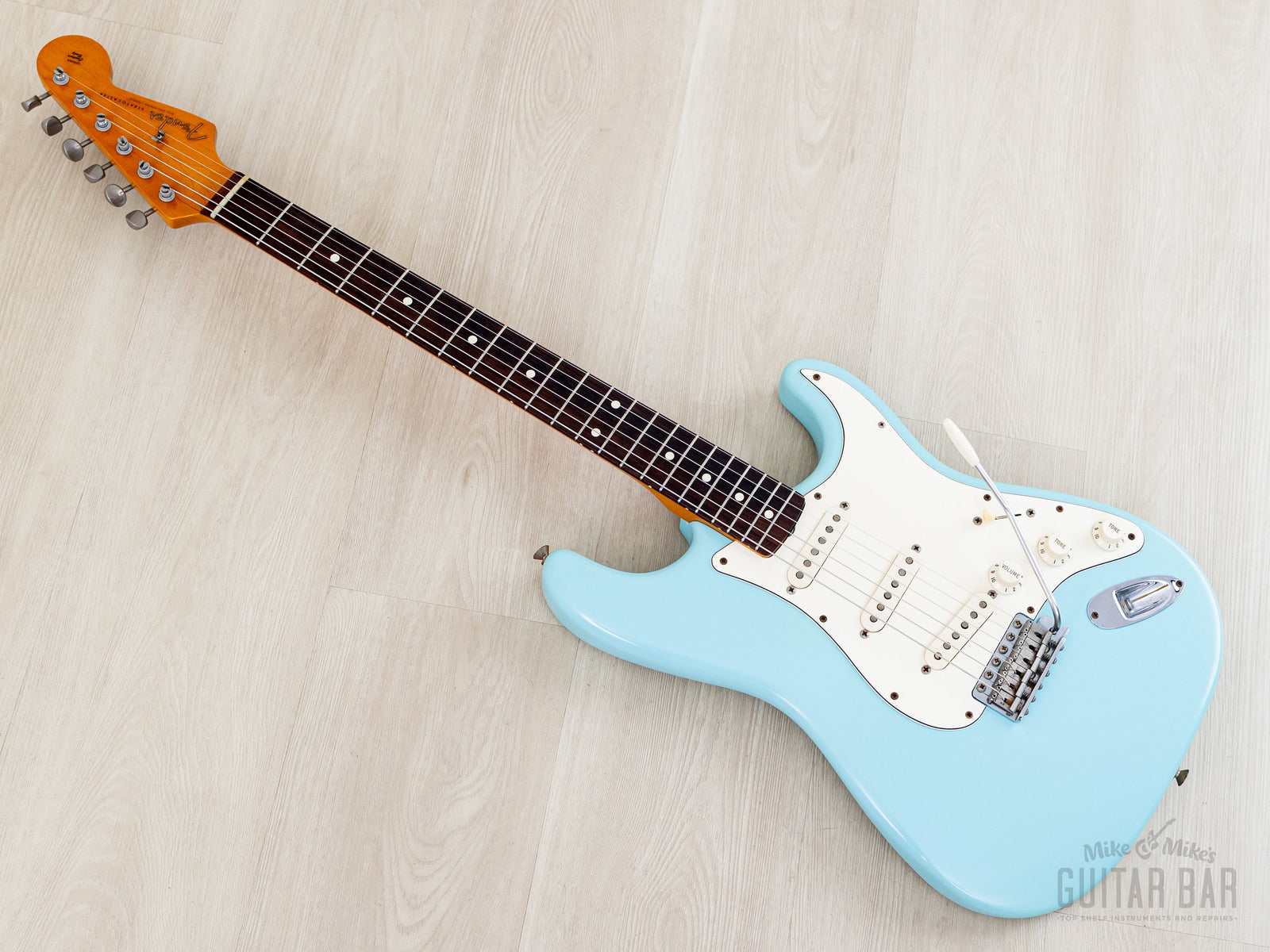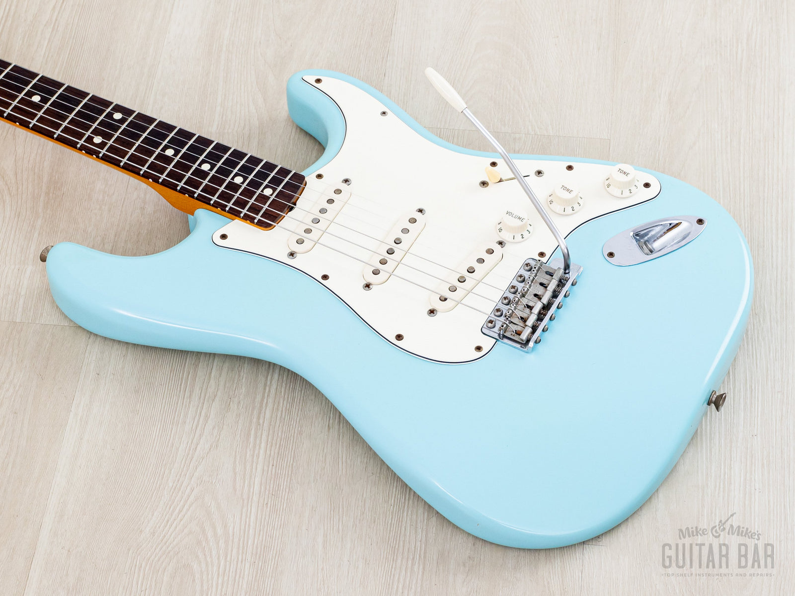 Weighing 7lbs 14oz, tonewoods include an alder body, maple neck and slab rosewood fretboard, naturally balanced, clear and sweet-sounding. The Van Zandt Vintage Plus single coils feature black fiber bobbins, staggered Alnico V magnets, and cloth-covered leads, channeling the best qualities of an early ‘60s Pre-CBS Strat, with ample sparkle and snap, plus a bit more heft in the midrange. The bridge pickup has a spanky cut, and the neck pickup has a throaty bell-like chime. This Stratocaster benefits from a professional setup here at Mike & Mike's Guitar Bar with 10-46 strings, low action, and accurate intonation.