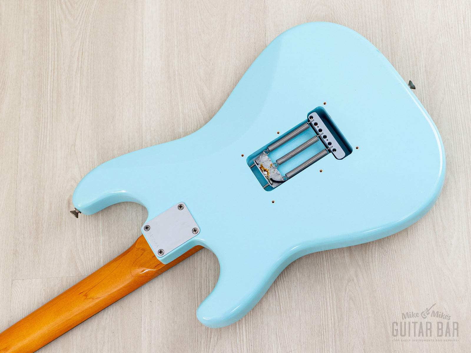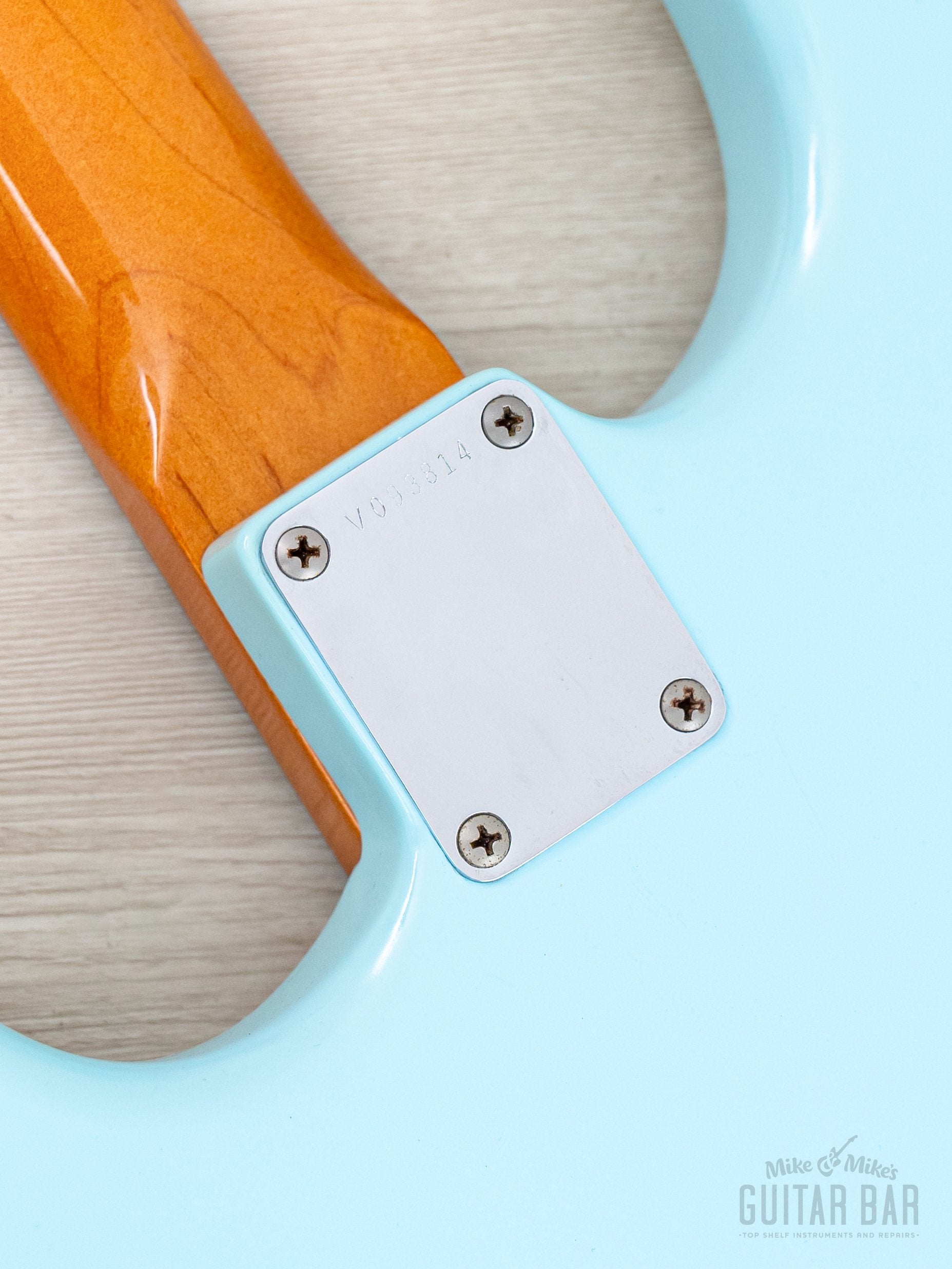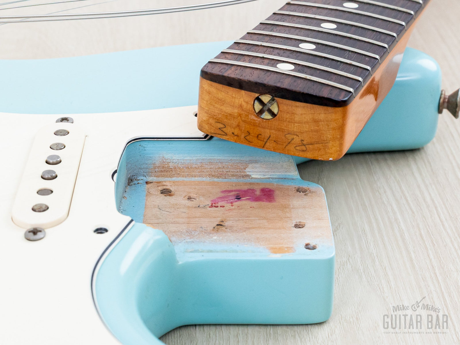 The refinished satin Sonic Blue body shows only a few minor dings, while the original ambered nitro lacquer gloss on the neck profile is flawless.