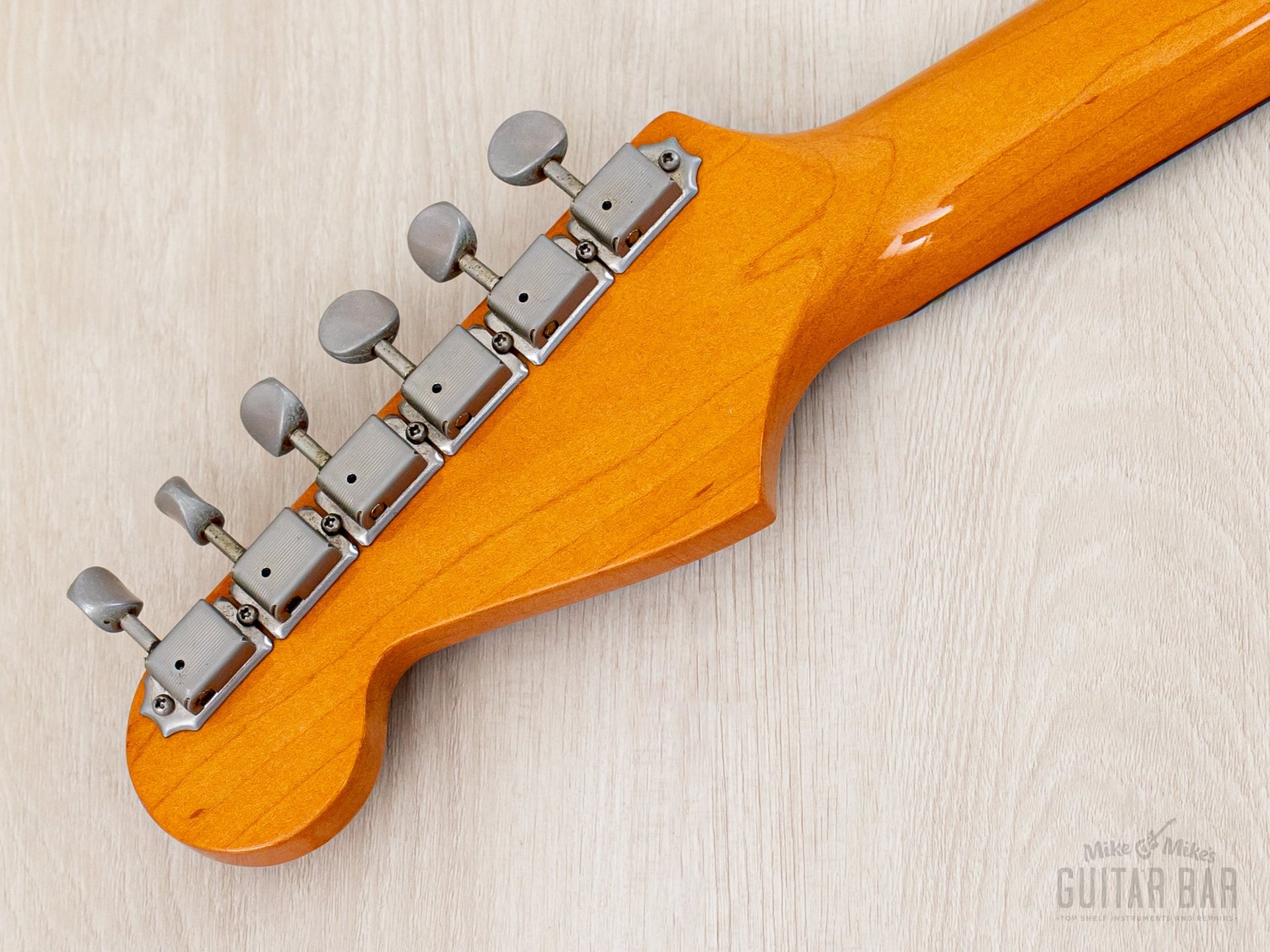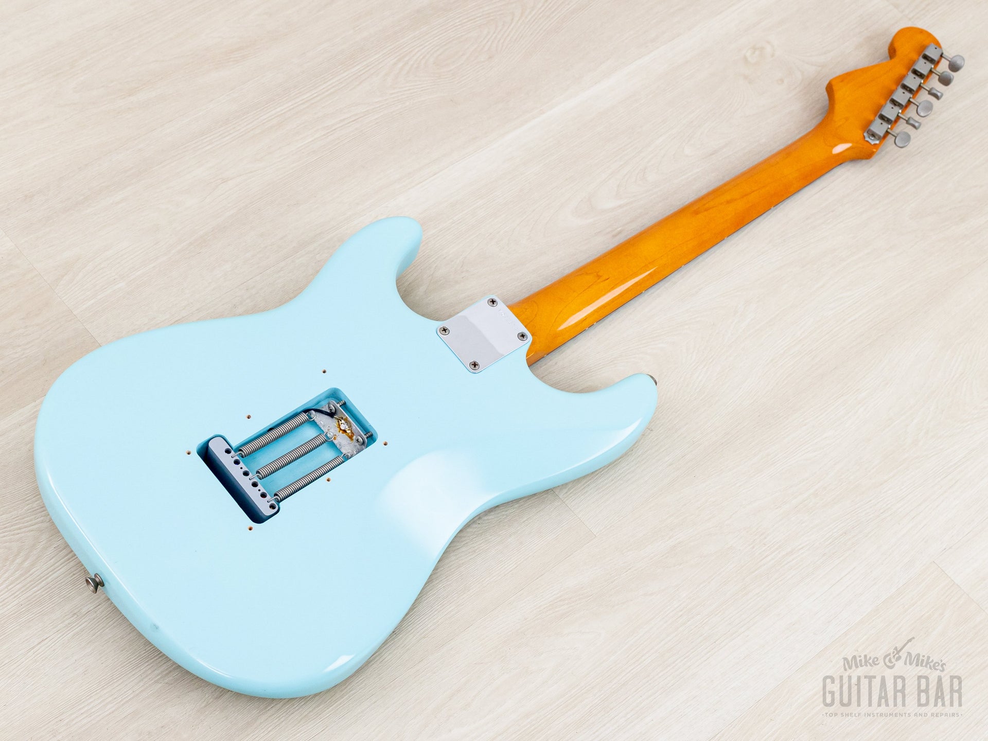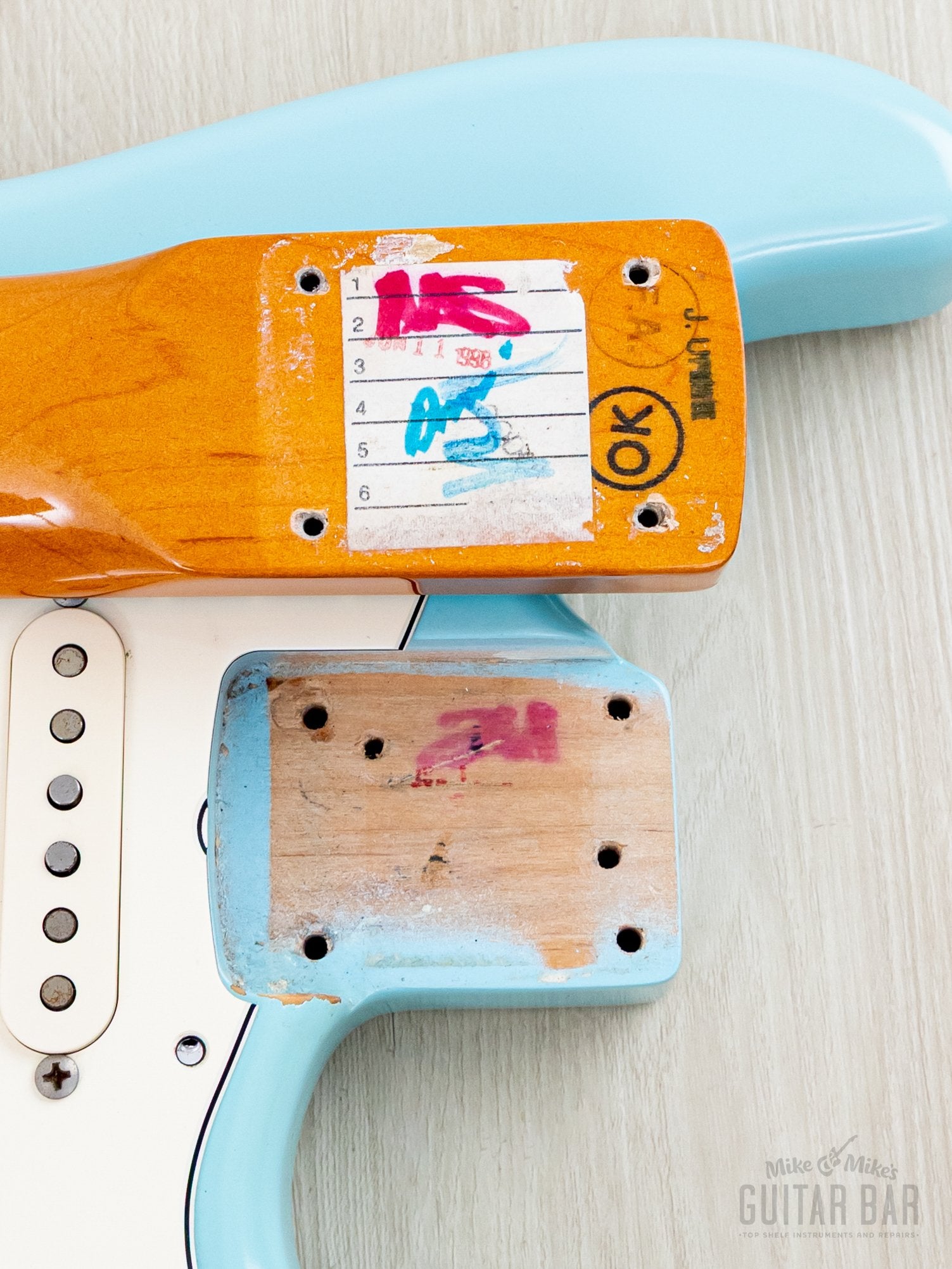 The refinished satin Sonic Blue body shows only a few minor dings, while the original ambered nitro lacquer gloss on the neck profile is flawless.
