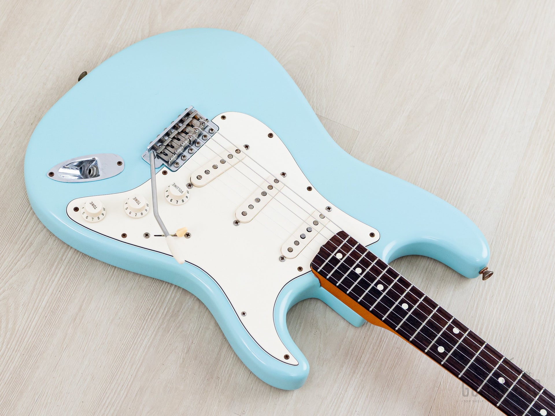 Plastics: Three-ply white pickguard, lightly aged knobs