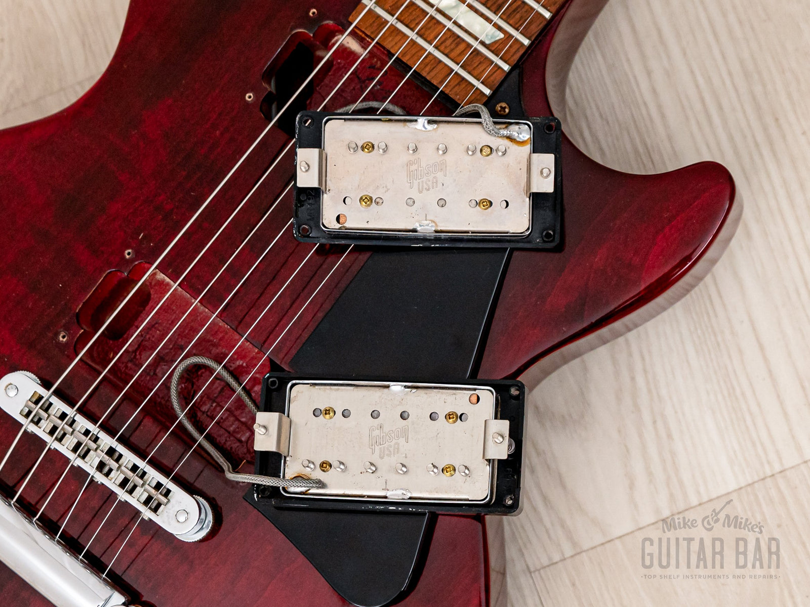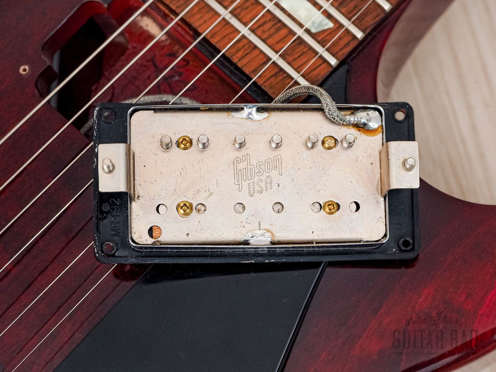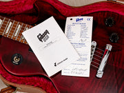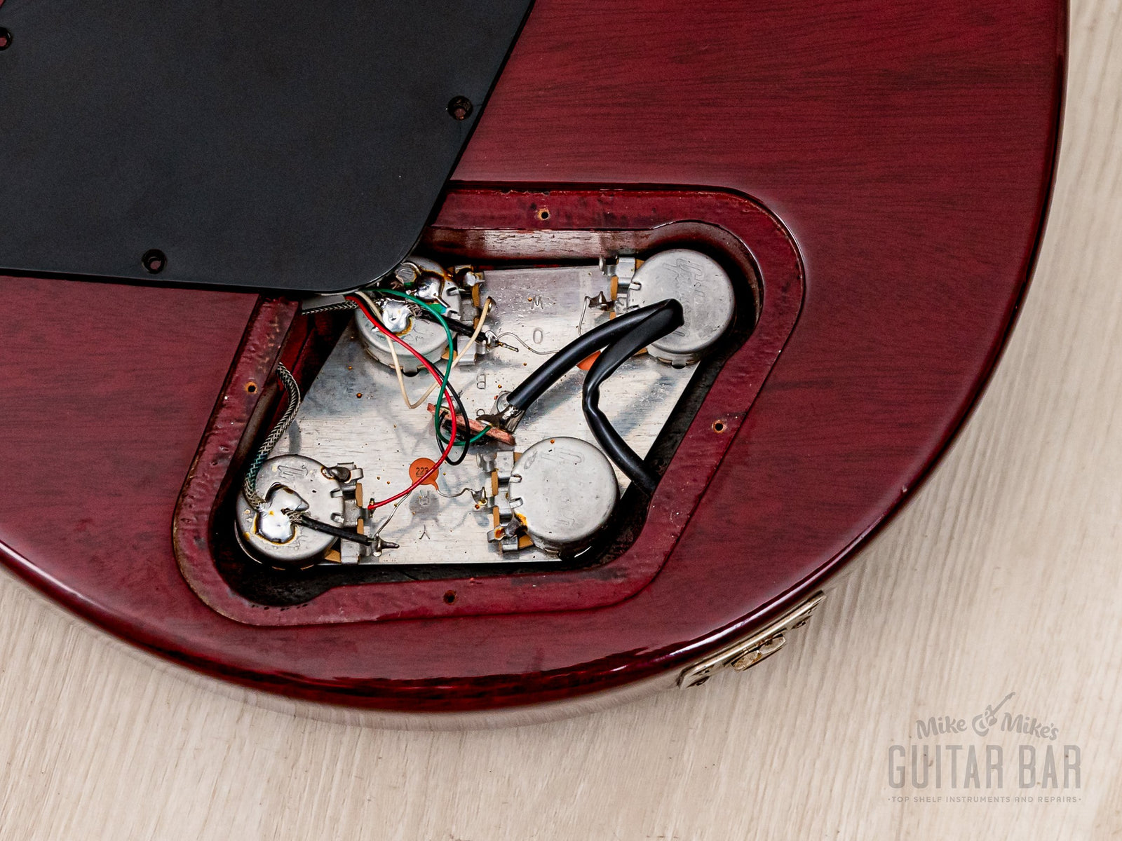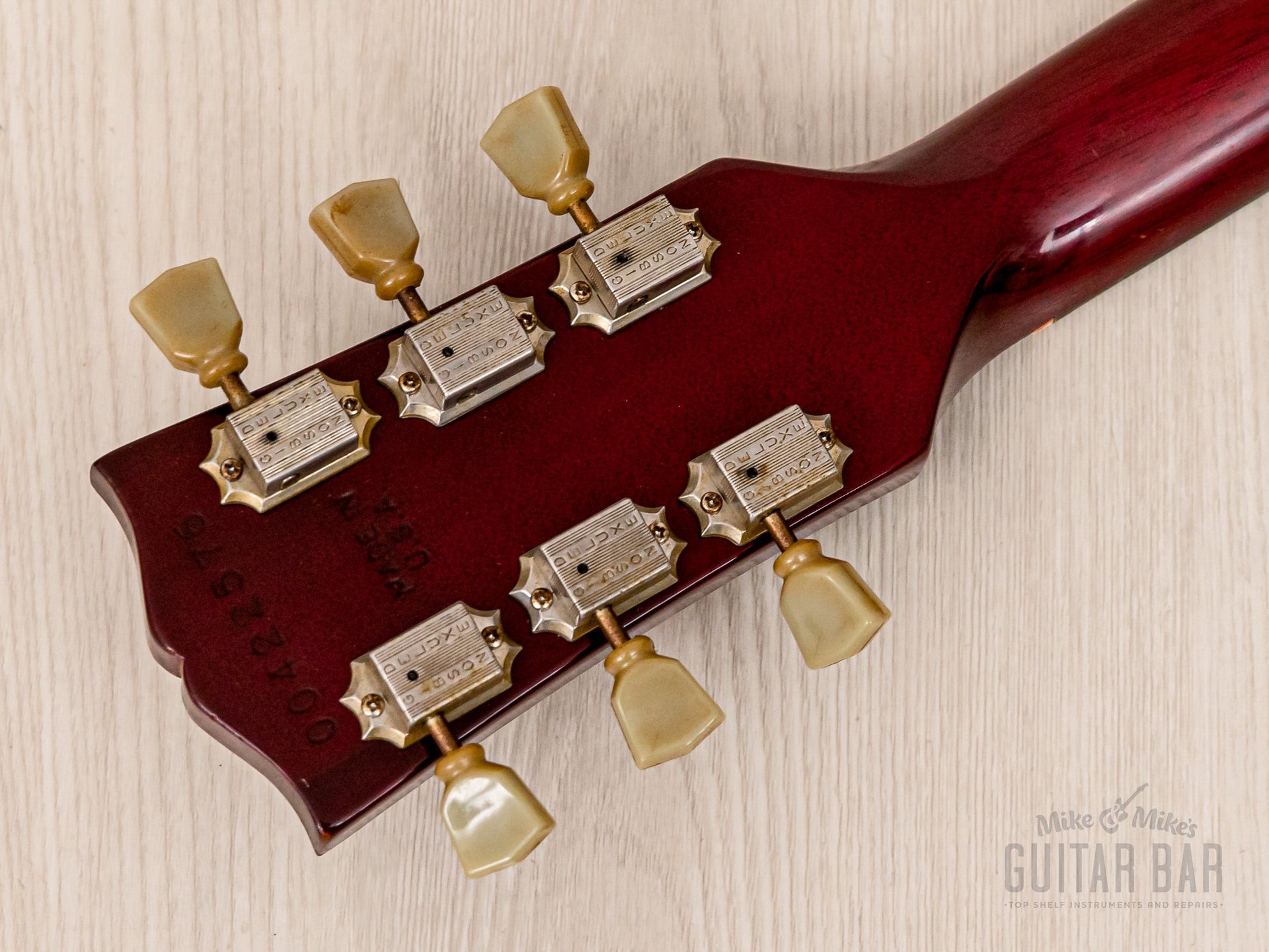 The gloss Wine Red finish highlights the figuring in the flame maple top, with limited subtle lacquer checking on top. Cosmetic wear is limited to a few minor nicks along the lower bout perimeter and some additional tiny dings on the body as a whole. The finish on the neck profile is immaculate.