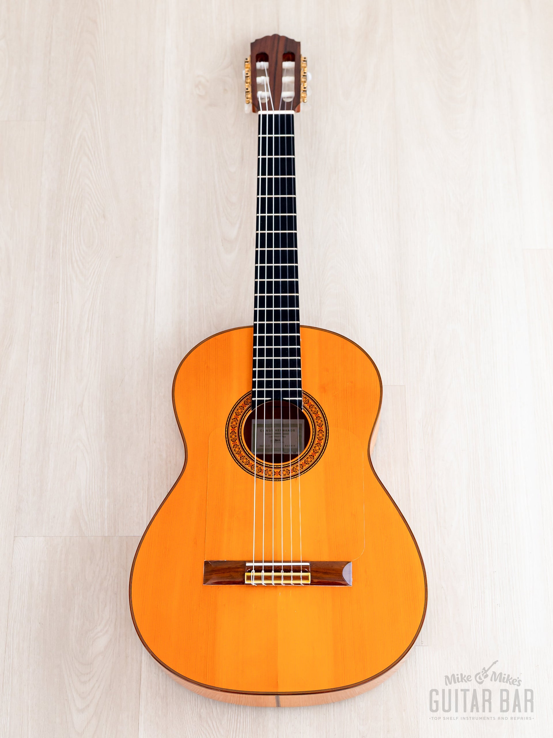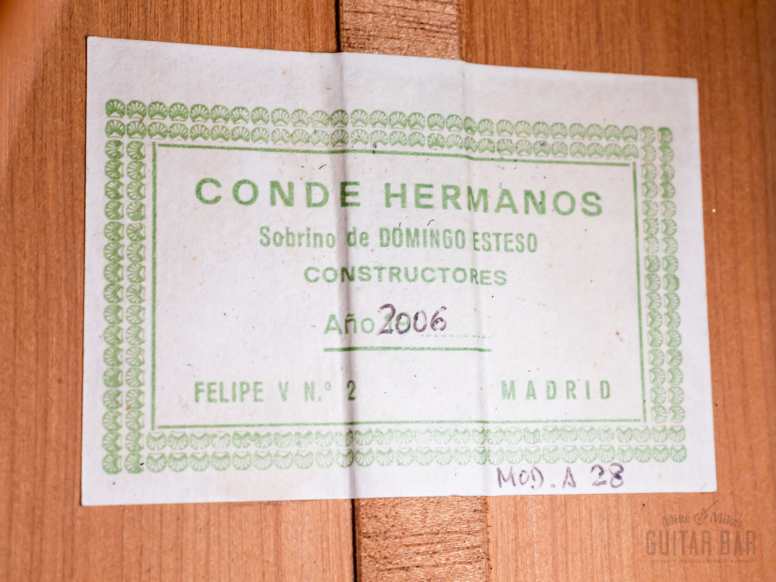 Up for sale, a 2006 Conde Hermanos Felipe V No. 2 Model A28 flamenco guitar in near-mint condition, complete with a molded hardshell case. The Madrid-based Conde dynasty began in 1915 with master luthier Domingo Esteso, who was succeeded by his nephews (and pupils), Mariano Sr., Faustino and Julio Conde. Eventually Mariano’s sons Felipe and Mariano Jr. took over the business, and their masterfully crafted flamenco and classical guitars are still produced in Madrid to this day, played by luminaries including Pacco De Lucia, Mario Escudero, Sabicas, Al Di Meola, and John Williams. This Model A28 was produced just a few years prior to the family’s split in 2010 (after which the brothers opened their own workshops), and features a German spruce top paired with Spanish cypress back/sides.