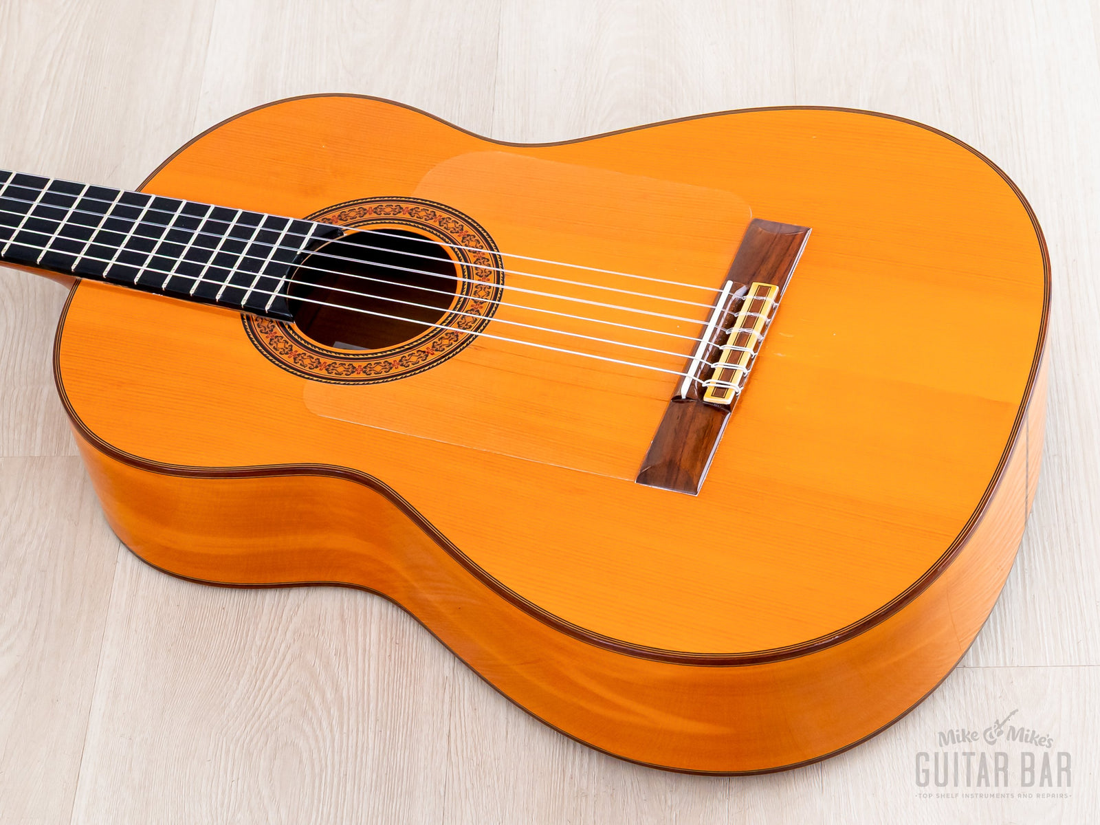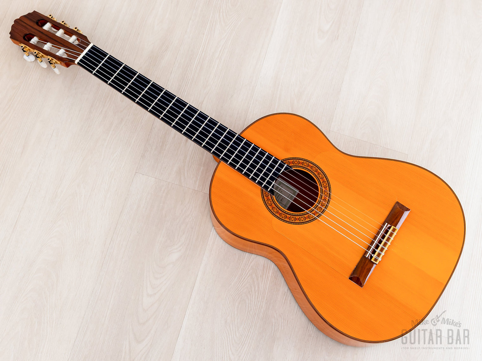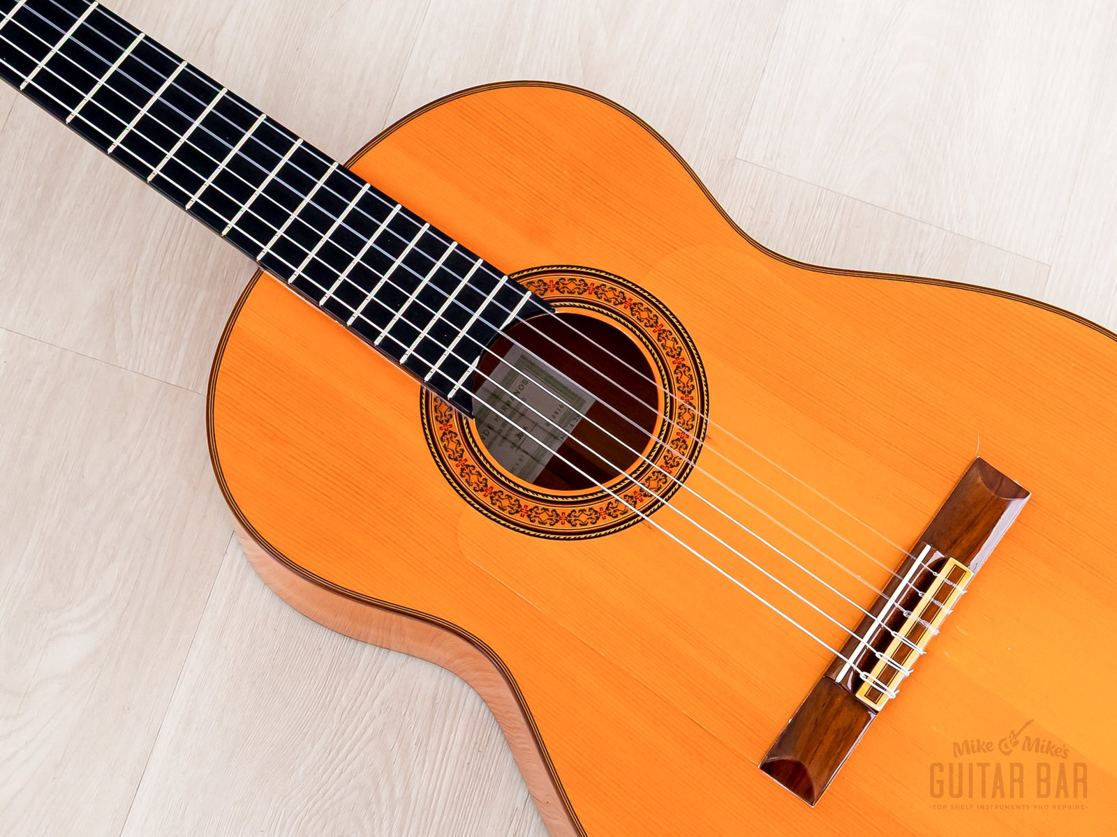 The German spruce top features five-fan bracing (à la Antonio de Torres), allowing the soundboard to resonate freely for a crisp, open sound. The Spanish cypress back and sides yield a dry, clear tonal profile, exceptionally well-suited to flamenco applications. There’s a certain punchy and immediate quality to this A28, encouraged by the longer 664mm scale length, and while the lows are dark and pensive, the trebles are smooth and soaring, ensuring this Model A28 is very able-bodied for melodic playing. Weighing 3lbs 5oz, this Model A28 has been professionally setup here at Mike & Mike’s Guitar Bar with normal tension strings and ideal action.
