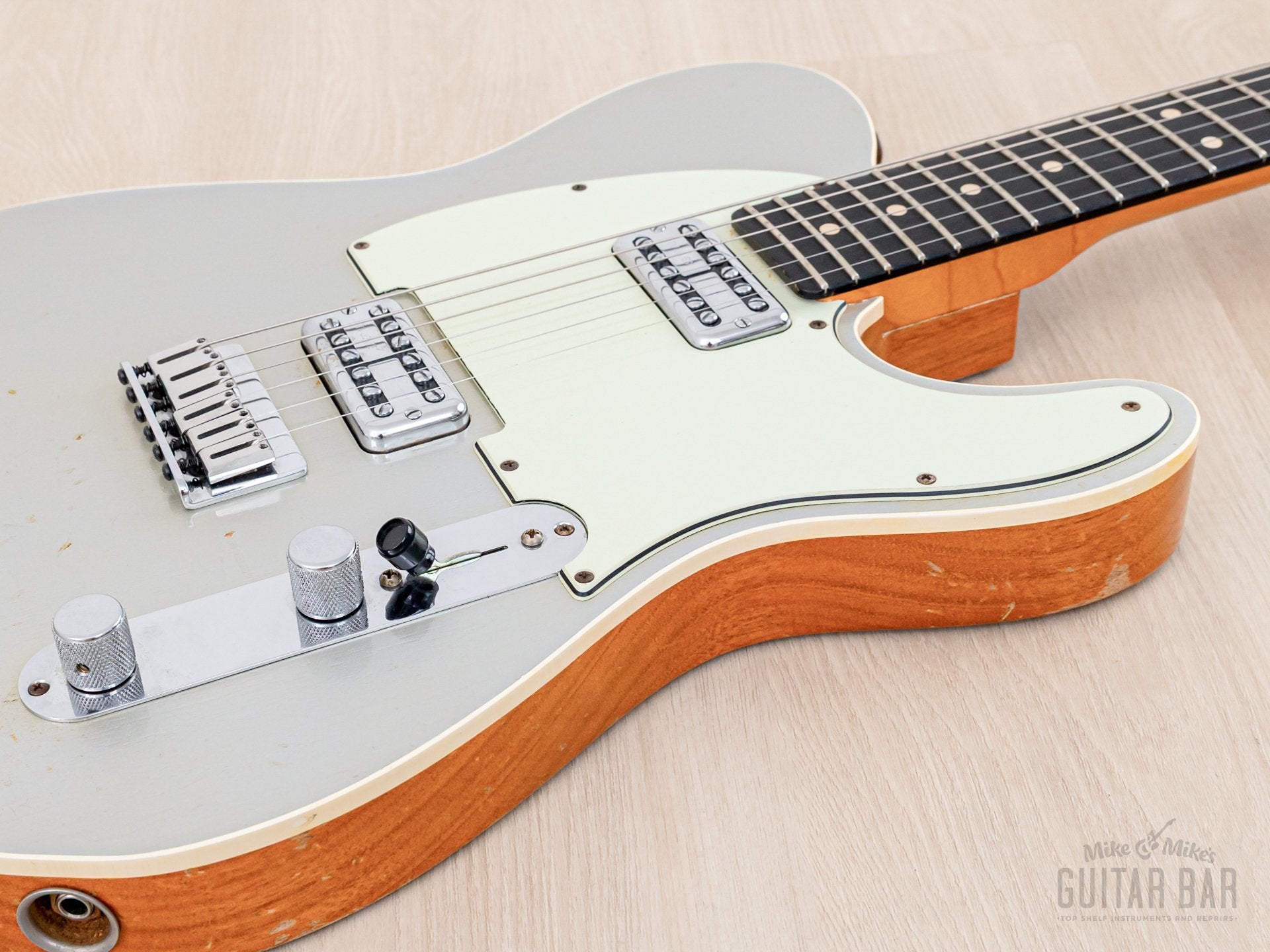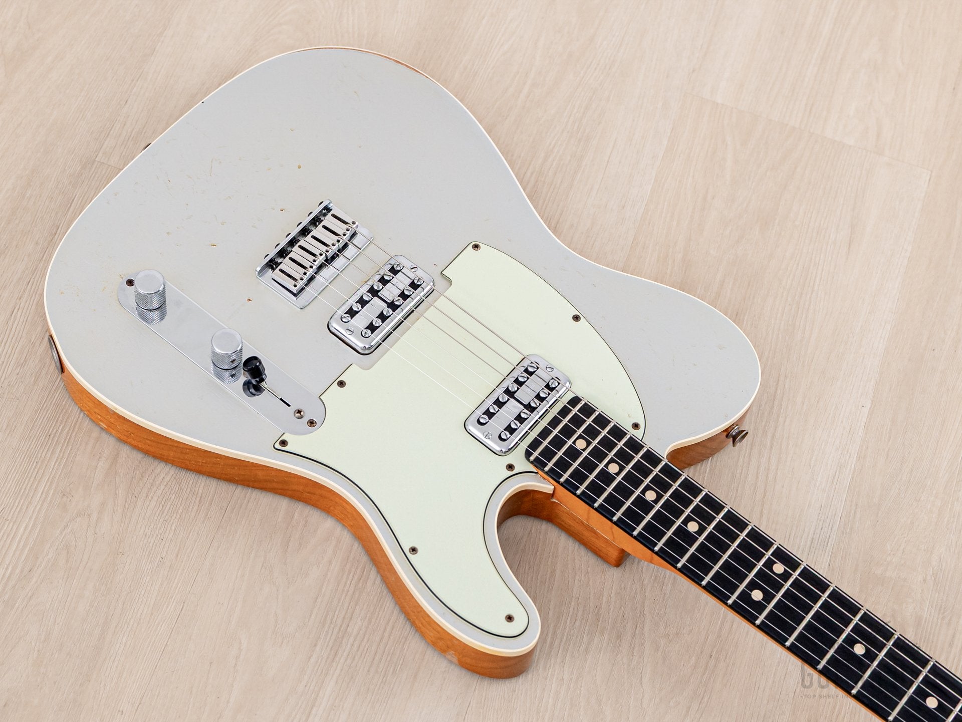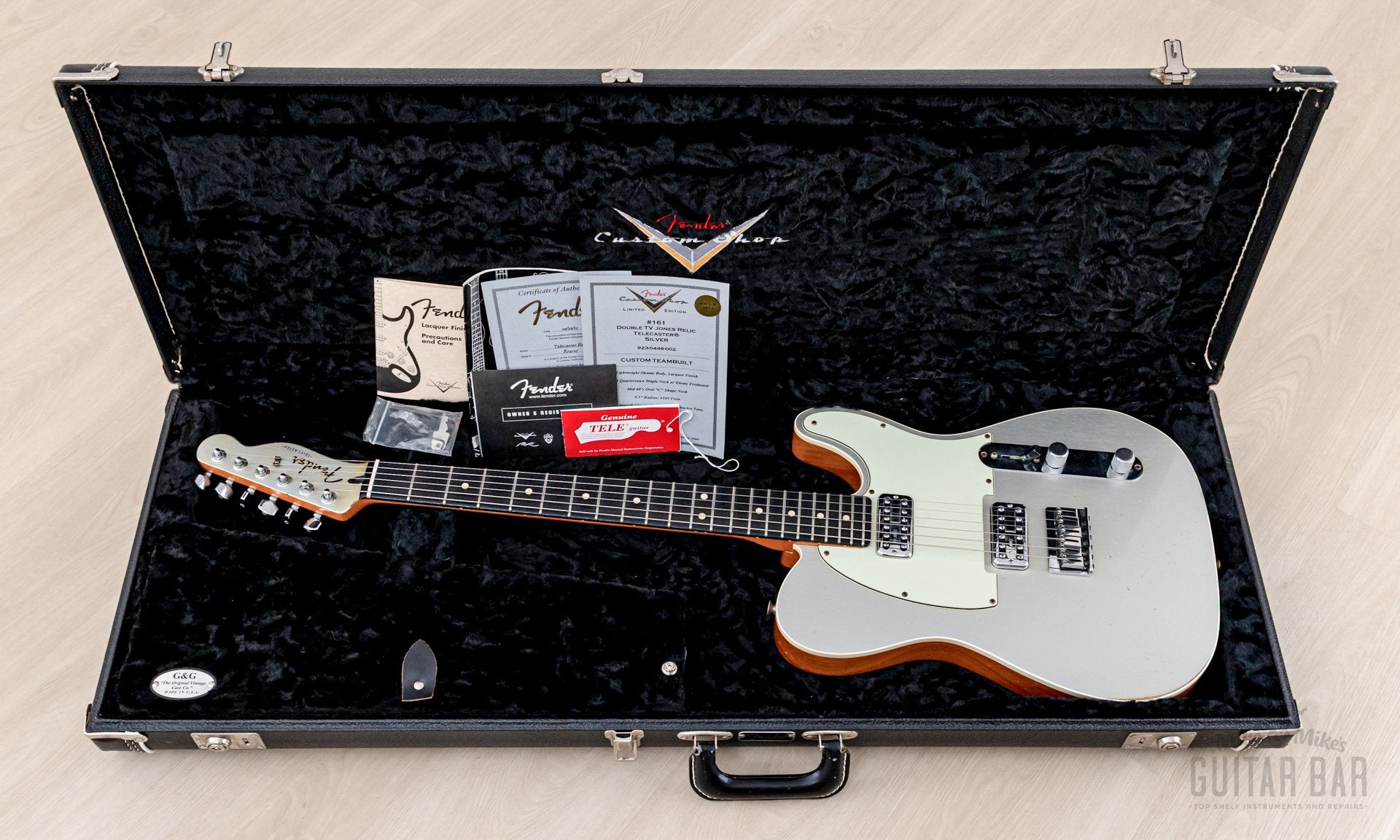 Up for sale, a 2013 Fender Custom Shop Custom Teambuilt Double TV Jones Telecaster Relic in showroom-clean, 100% original condition and in perfect working order, complete with the original hardshell case, CoA(s), and hangtags. This Custom Teambuilt Telecaster Relic boasts a number of unique, premium features including a pair of TV Jones Classic Filter’Tron humbuckers with a Greasebucket Tone circuit, six-saddle bridge, and a gloss Silver nitro lacquer finish with a matching headstock and a moderate Relic treatment.