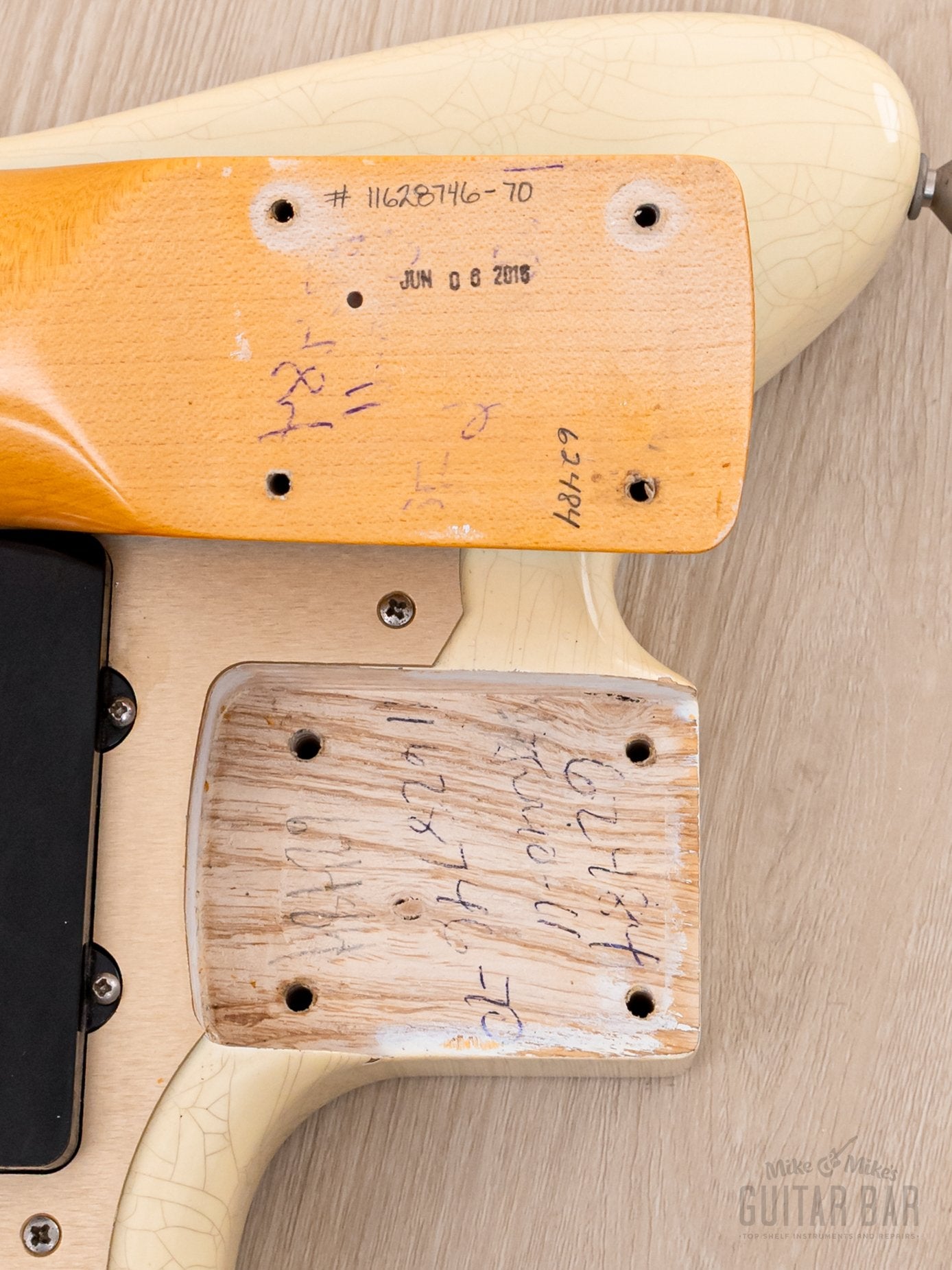 The Closet Classic relic treatment on the gloss Desert Sand nitro lacquer finish is designed to evoke the look of an instrument that has been carefully cased up for decades, exhibiting extensive “shattered glass” checking with sparingly little playwear. This is a well-kept example, with minimal wear beyond the factory aging, while the ambered nitro gloss on the neck profile is flawless.