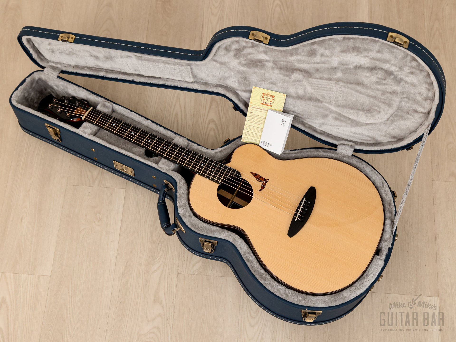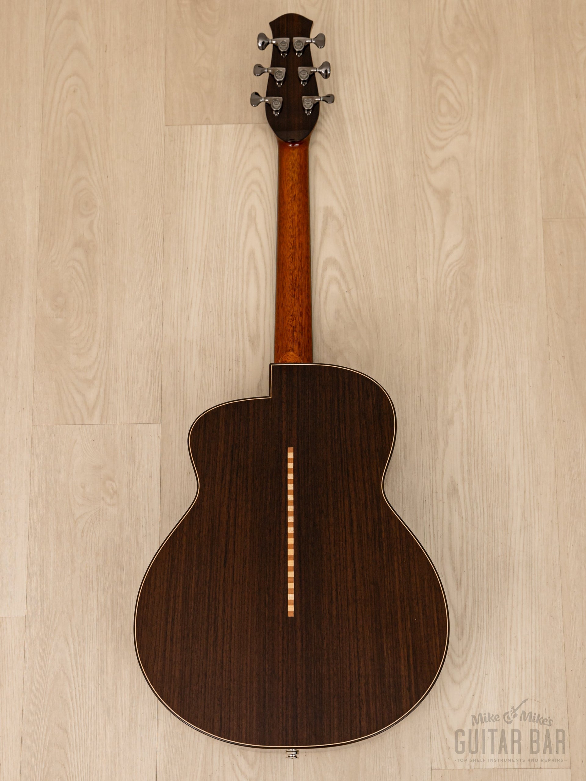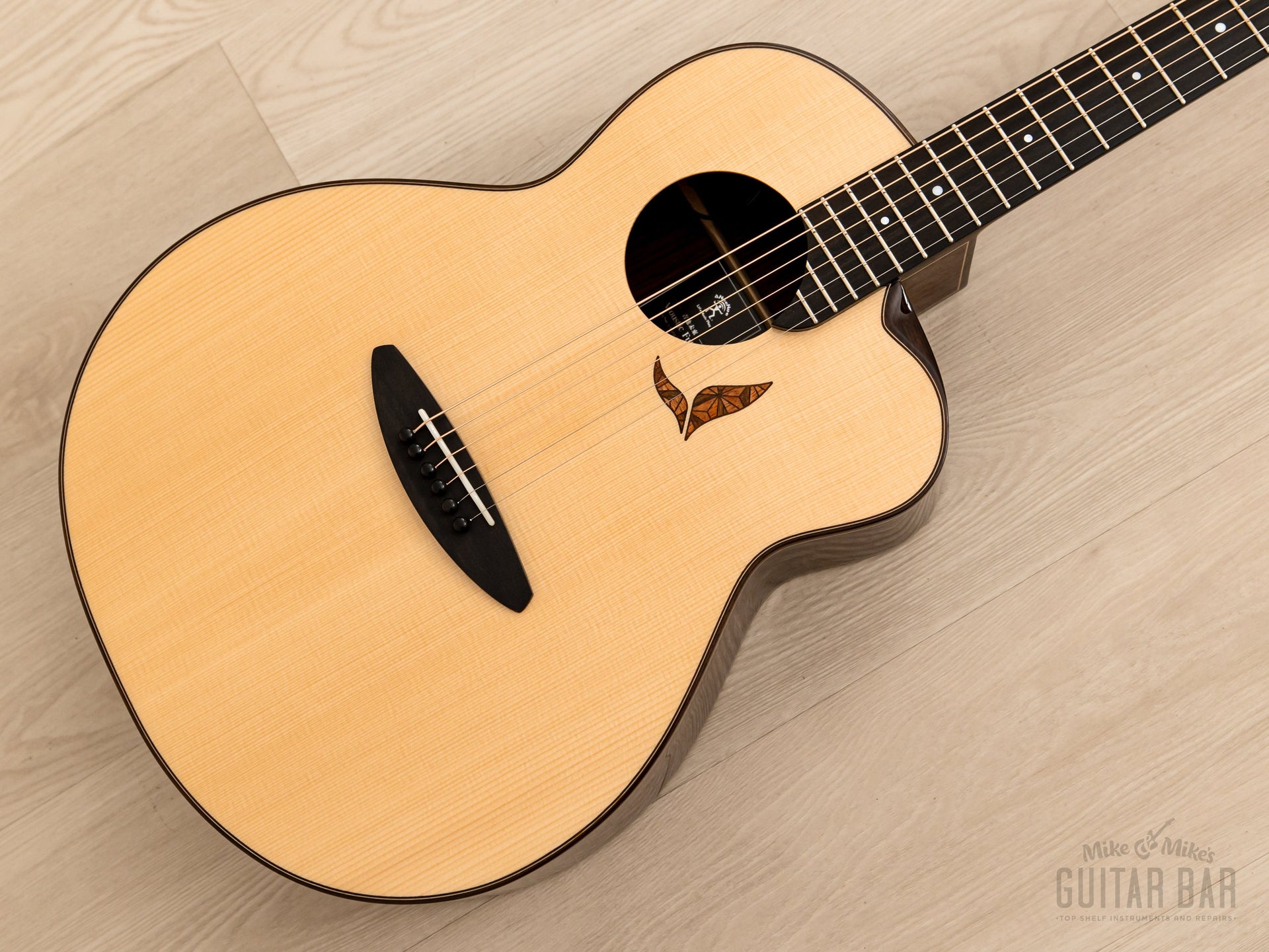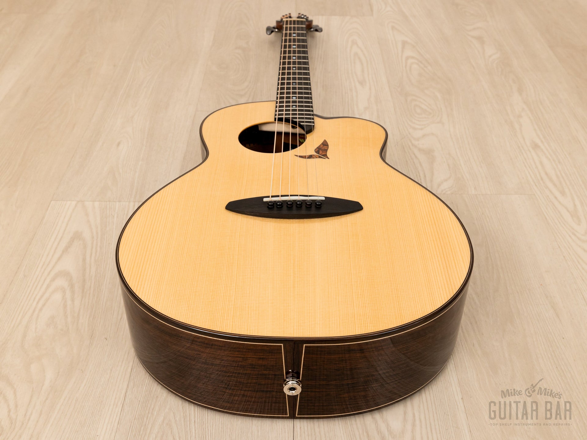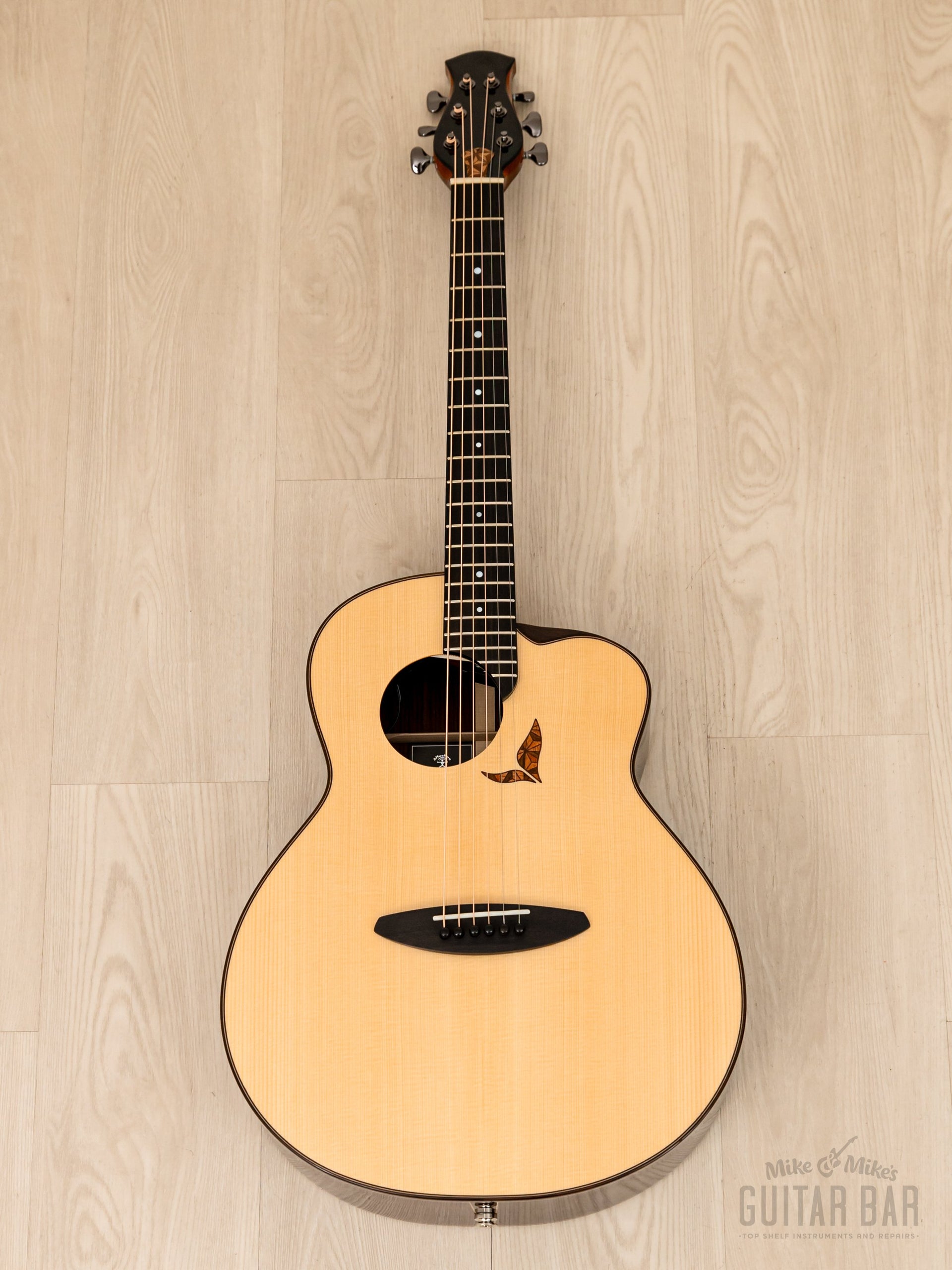 The tonewood complement includes a Swiss moon spruce top, Indian rosewood back and sides, mahogany neck, and ebony fingerboard, with a lower bout width of 15 1/8“ and a body depth of 4 3/8“. Tonally, this LS700E is crisp and punchy, with tight lows and a dynamic, immediate feel ideal for fingerstyle playing. There’s tons of natural projection on tap, and master luthier Kenji Sugita’s proprietary “Coherence Vibration” bracing was refined over three years of design for maximum resonance and openness. Additionally, the piezo undersaddle pickup has Volume and Tone wheels mounted to the inside edge of the soundhole for onstage flexibility. This aNueNue weighs 4lbs 5oz, professionally setup here at Mike & Mike’s Guitar Bar with 12-53 bronze strings and easy-playing action.