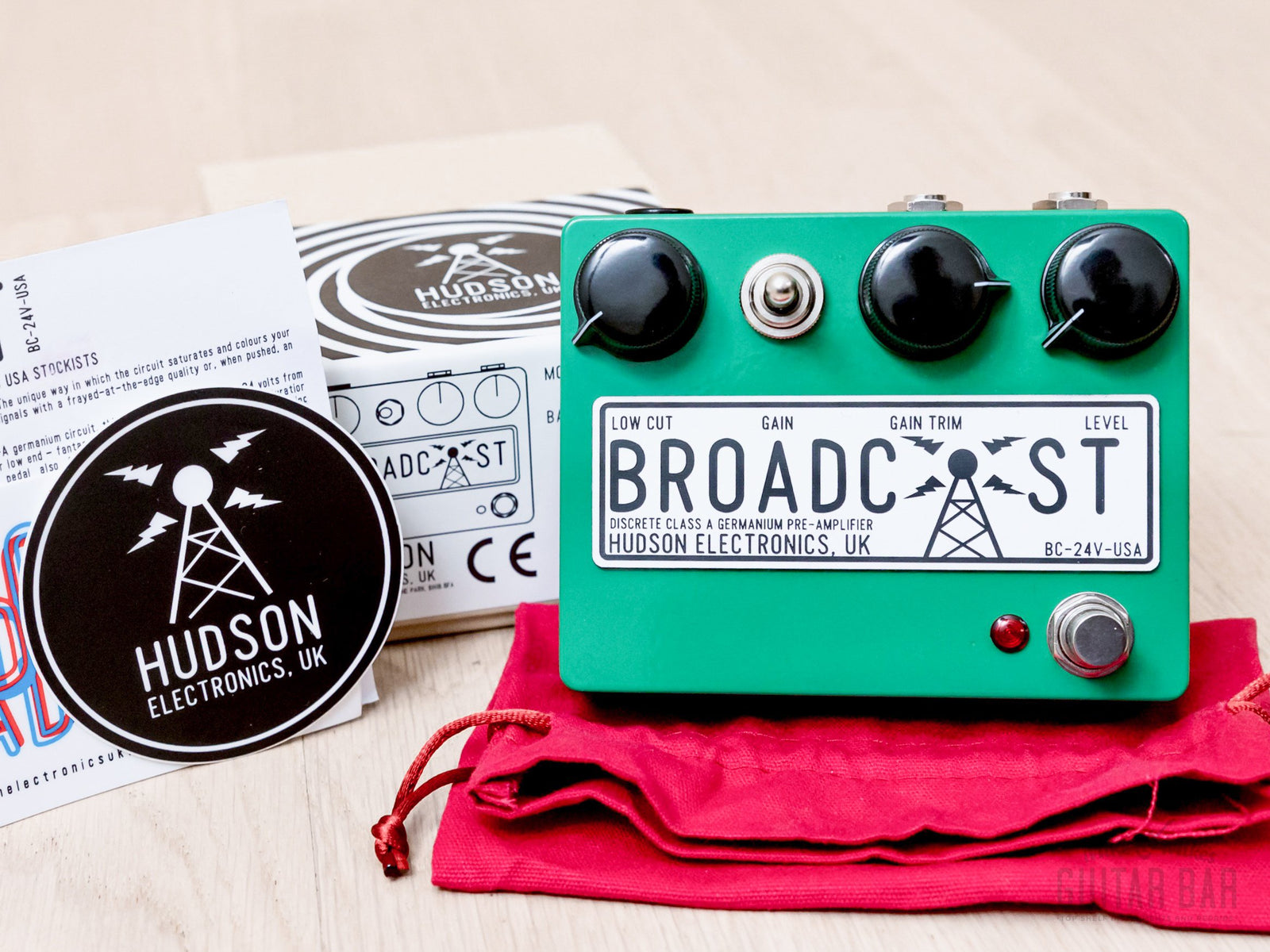 Up for sale, a Hudson Electronics, UK Broadcast 24V preamp effects pedal. This limited edition model has a distinctive green finish, featuring an internal voltage booster. The voltage booster converts the 9VDC coming in from the power supply up to 24VDC, giving the pedal increased headroom whilst being powered by a standard 9VDC power supply.