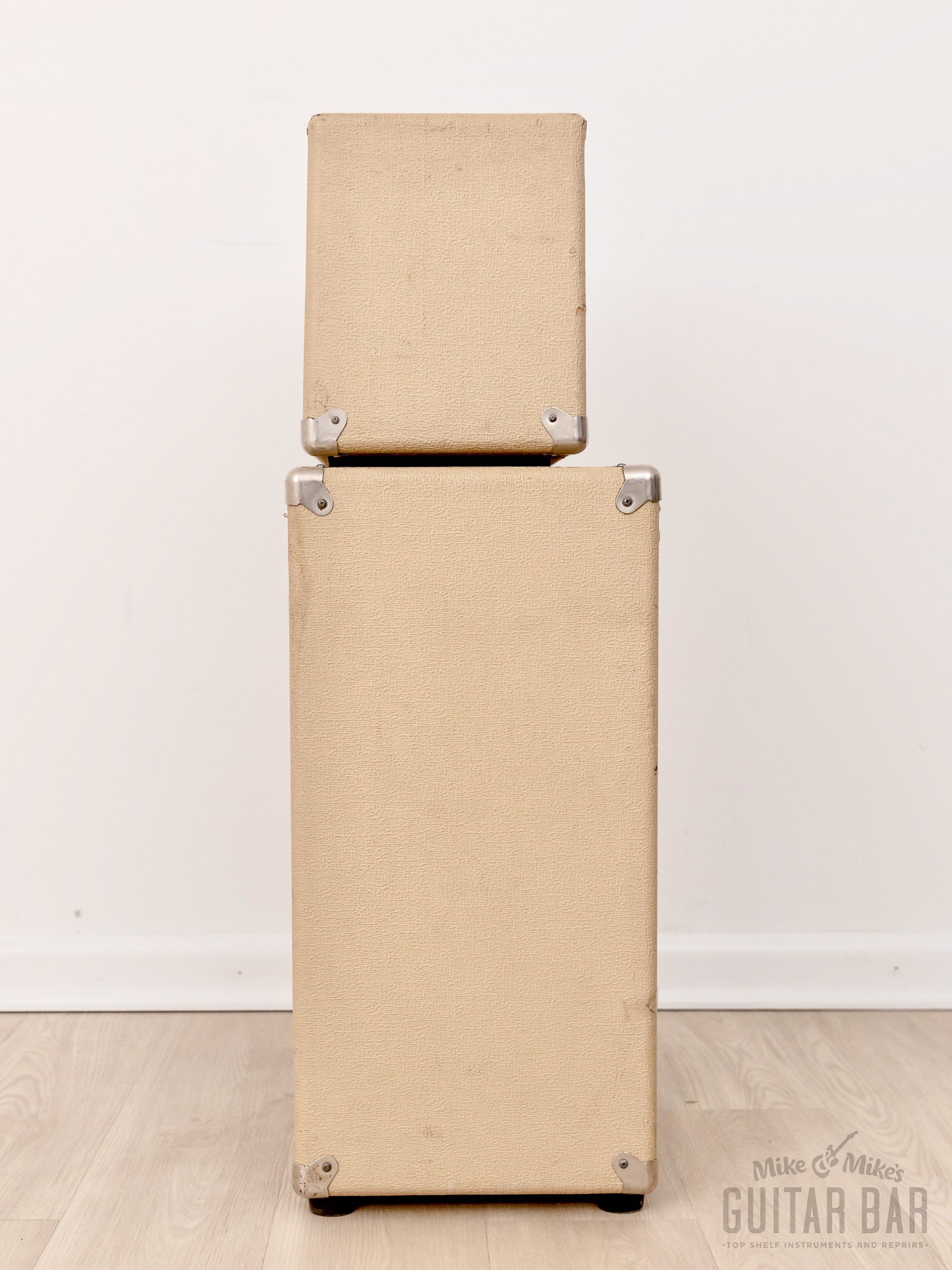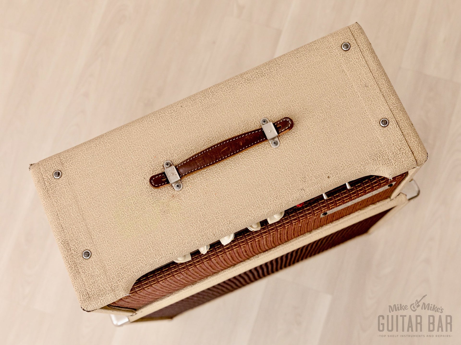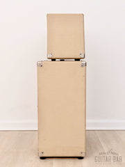 Cosmetic touches on the amp include blonde tolex, oxblood grillcloth, Hurricane badges, a vintage-style jewel LED, and leather handles. Cosmetic wear is limited to a few minor scuffs and tolex tears. The original quintet of chickenhead knobs are intact, and the faceplate graphics are clean.