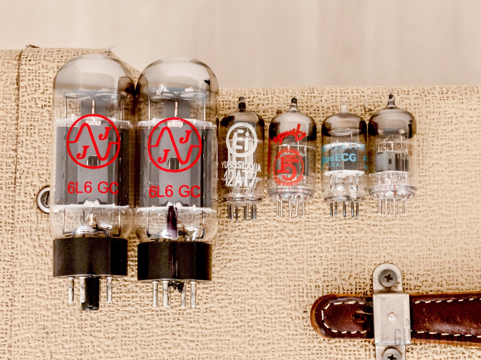 The tube complement comprises a matched pair of JJ 6L6 power tubes, with a preamp section of one Ei (Yugoslavian made) 12AX7, one Sovtek 12AX7, one PhilipsECG 12AT7, and one GrooveTubes/Fender 12AX7.