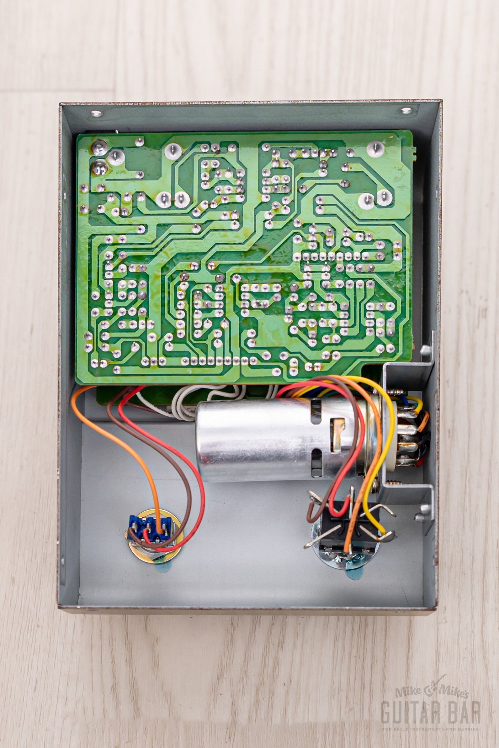 There is only faint wear on the enclosure edges, the original quartet of knobs are present, and the red silkscreen graphics are pristine.