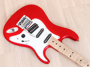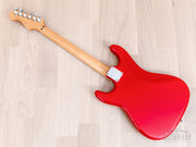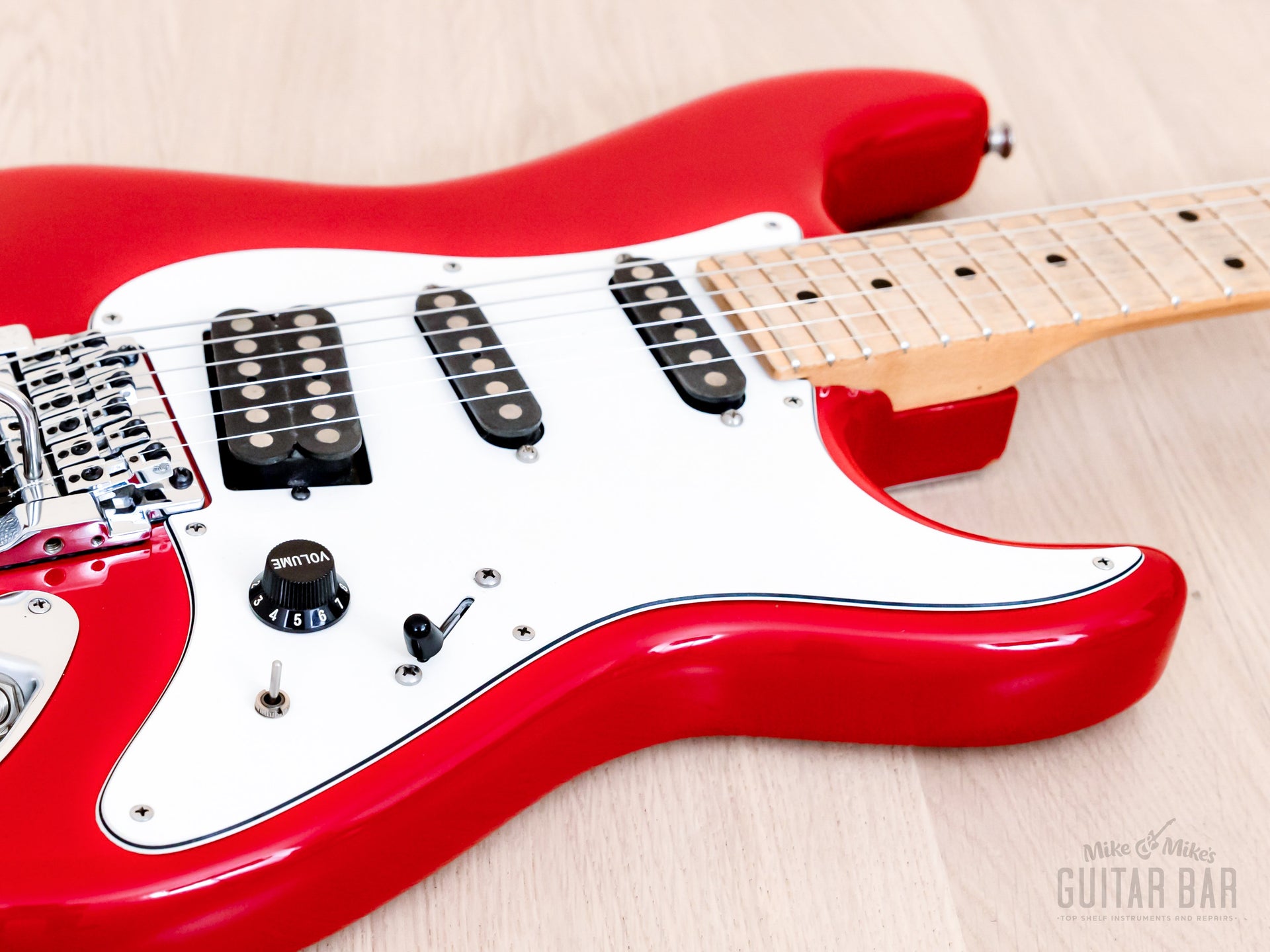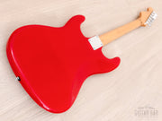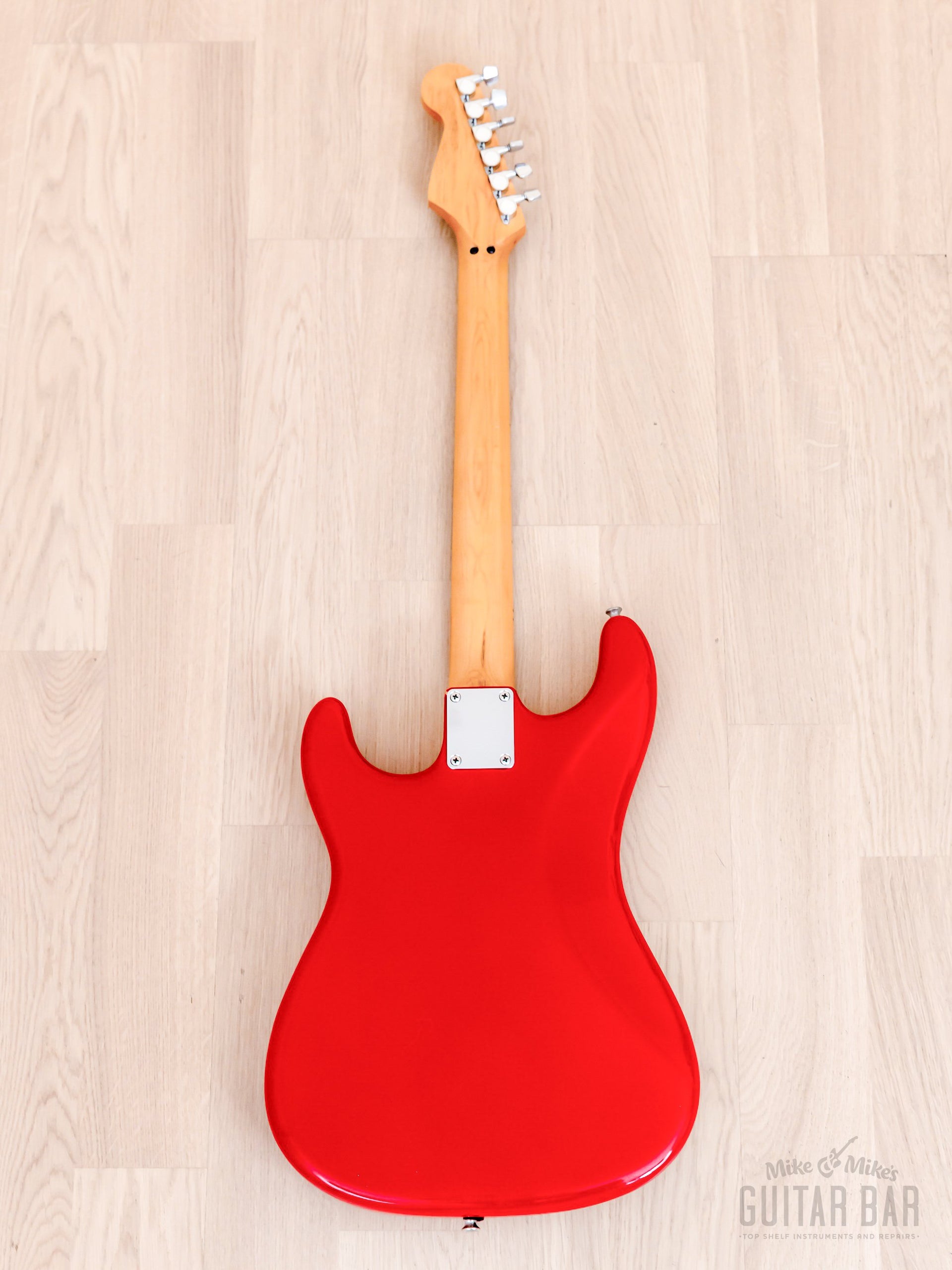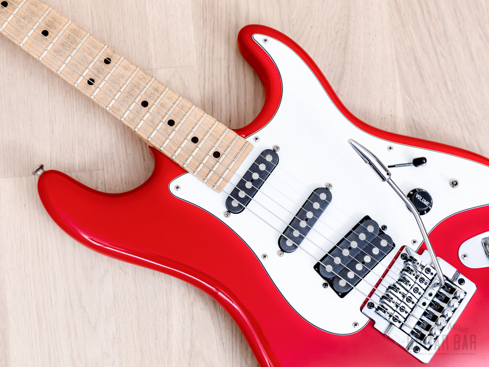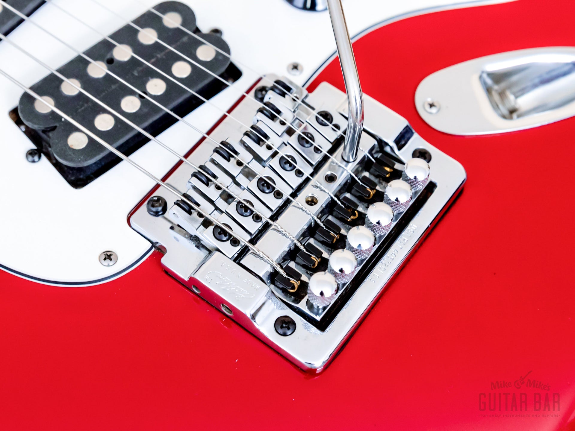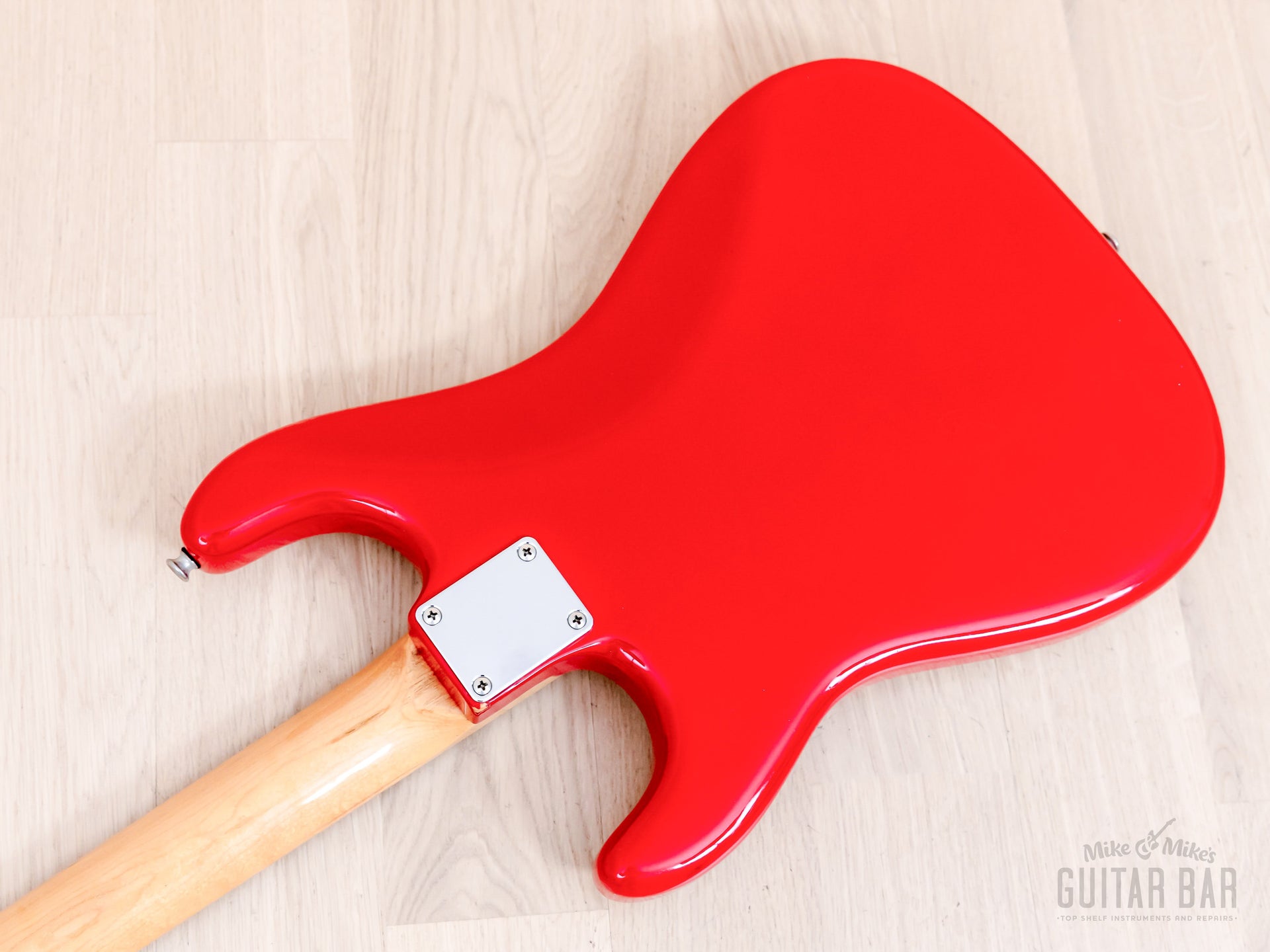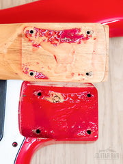 The Ferrari Red gloss finish exhibits some pick scuffing across the strum path, with small nicks and light finish scratches on the body as a whole, a bit of localized scuffing on the back lower bout body edge, and a couple tiny finish chips on the edge of the neck pocket. The gloss finish on the neck profile is clean and smooth, with only a couple tiny marks on its length.