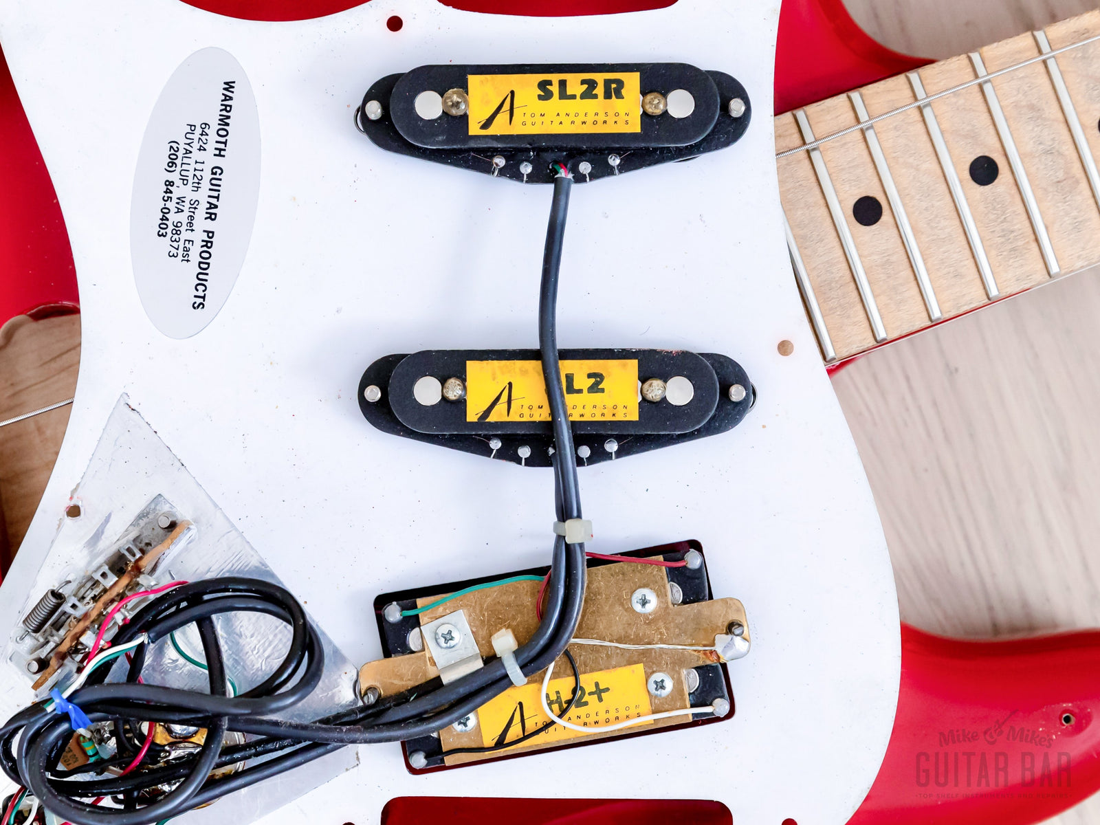 The Tom Anderson pickup complement includes a SL2R in the neck position, SL2 in the middle, and H2+ four conductor humbucker at the bridge. The precursors to Tom Anderson's SA pickups, these pickups owe a debt to the Schecter Monstertones, as Tom first worked for Schecter and his first contract job after starting the Tom Anderson brand was wiring pickups for Schecter. As such, the neck and middle position single coils have large diameter magnets and a hum-cancelling design, offering fat and full tones with plenty of authority and cut. The H2+ bridge position humbucker pairs well in terms of perceived output, delivering power and crunch, also tamable to single coil operation via the two-way mini-toggle. The guitar weighs 7lbs 14oz, professionally setup here at Mike & Mike's Guitar Bar with 10-46 strings, low action, and accurate intonation.