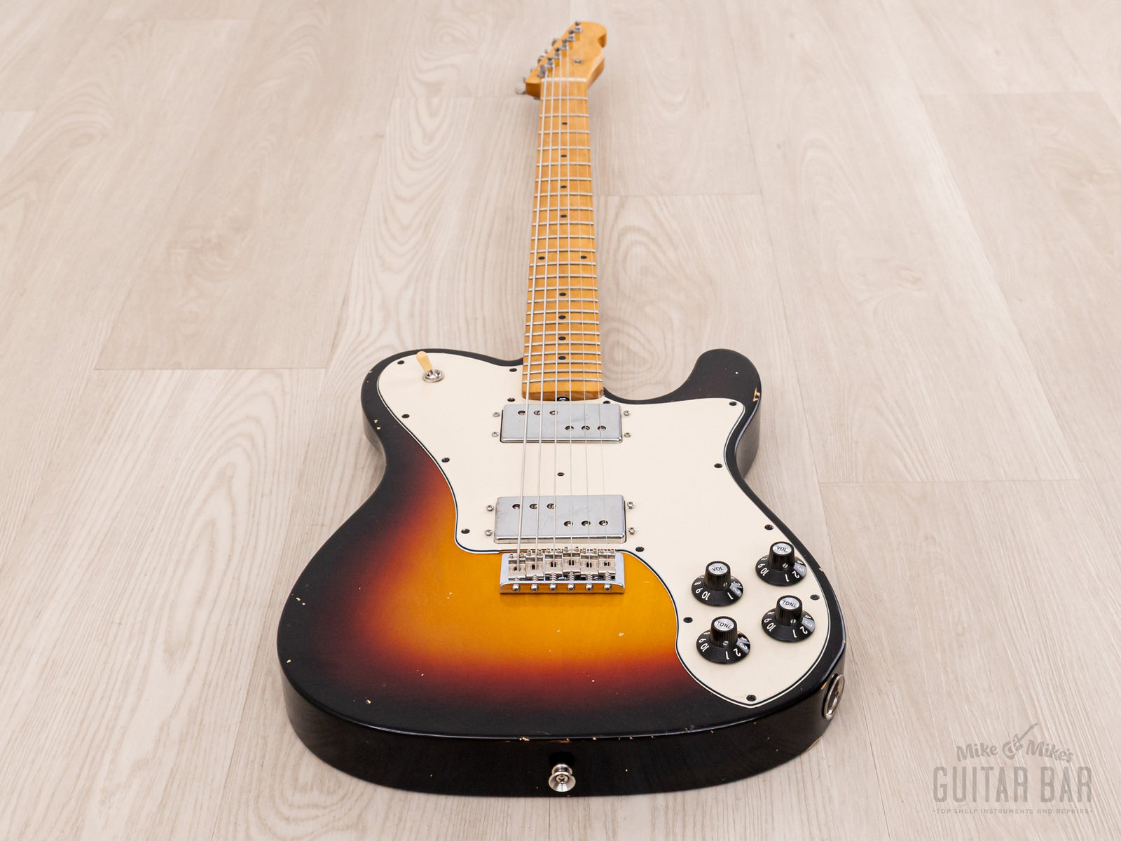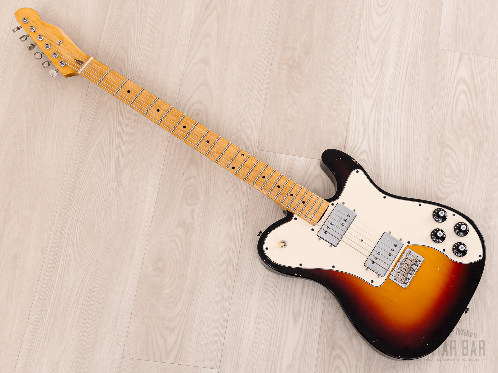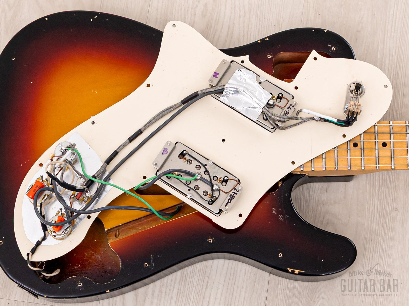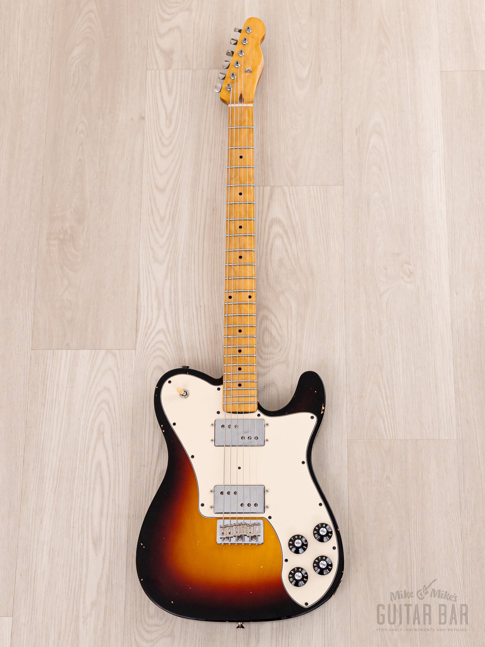 Up for sale, a custom-built Baritone Telecaster Deluxe, featuring a nitro lacquer-finished MJT body and 28 ⅝” scale DC Kunkle V neck. The Road Worn Wide Range humbuckers replicate the warmth, detail, and percussive clarity of the original Seth Lover design, and these pickups are a great match for the sonic range of a baritone, capturing the full, expansive warmth of the low end while still retaining optimal articulation and treble sweetness. This guitar weighs 7lbs 10oz, professionally setup here at Mike & Mike’s Guitar Bar with 13-62 strings, low action, and accurate intonation.