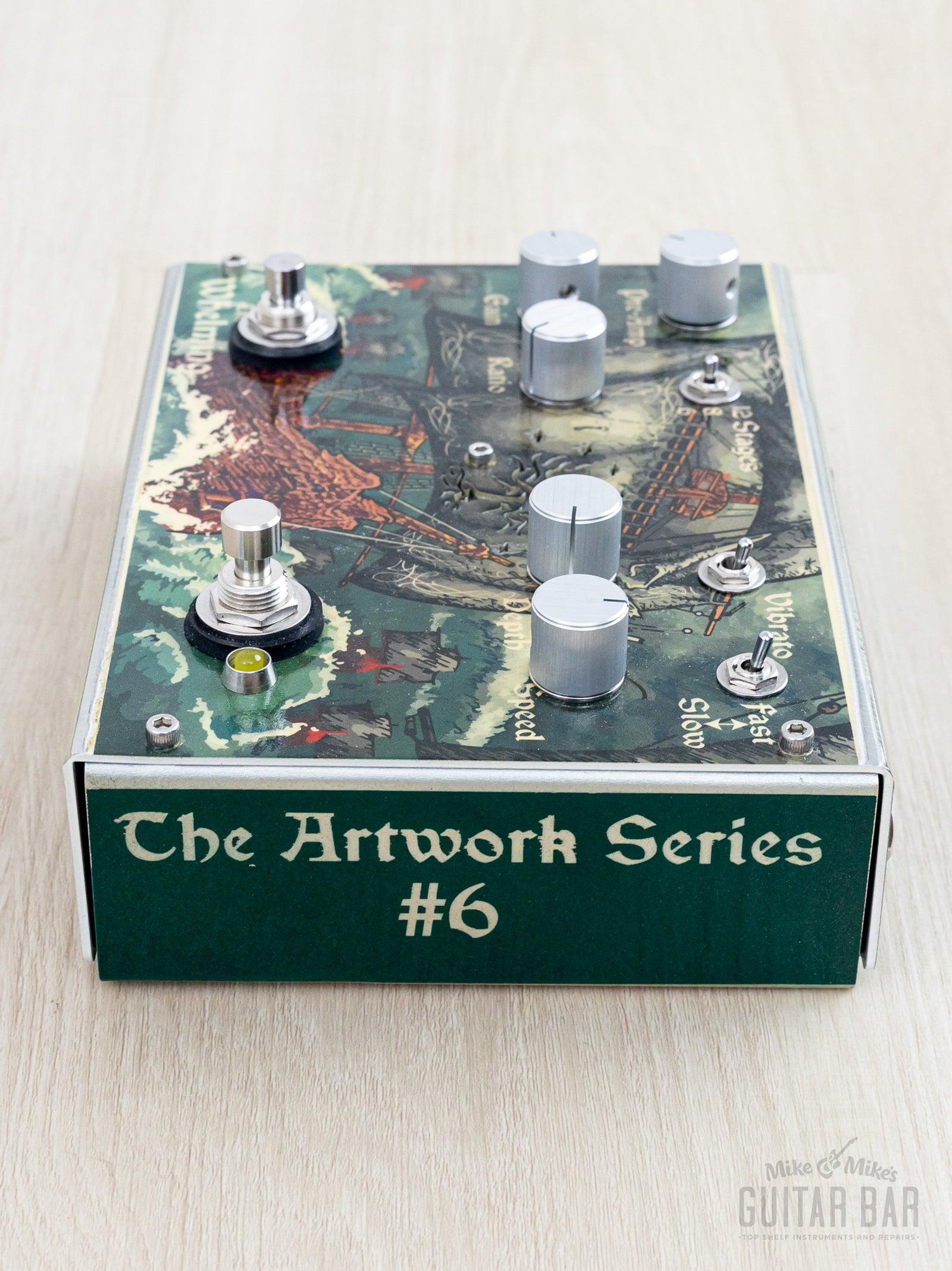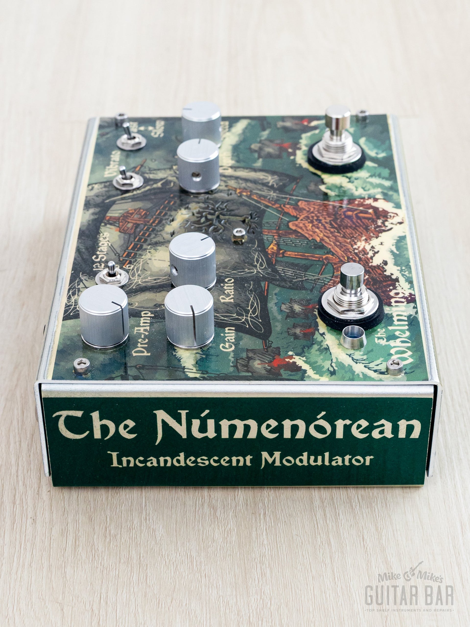 Up for sale, a Wrought Iron Leather & Effects The Numenorean Incandescent Modulator in like-new condition, complete with the original box. This (currently sold out) handcrafted pedal is an all-analog optical phase shifter with selectable 12, 8, or 6 phasing stages, with each stage powered by a discrete JFET transistor. Exceedingly versatile, musical, and dynamic, this The Numenorean was produced as part of Wrought Iron’s limited run The Artwork Series, boasting gorgeous custom artwork by James Martin inspired by the world of J.R.R. Tolkien, depicting the flight of Elendil from the drowning of Numenor.