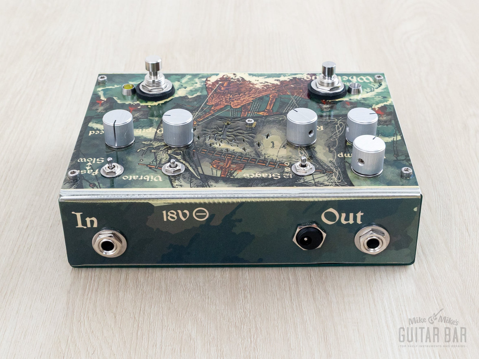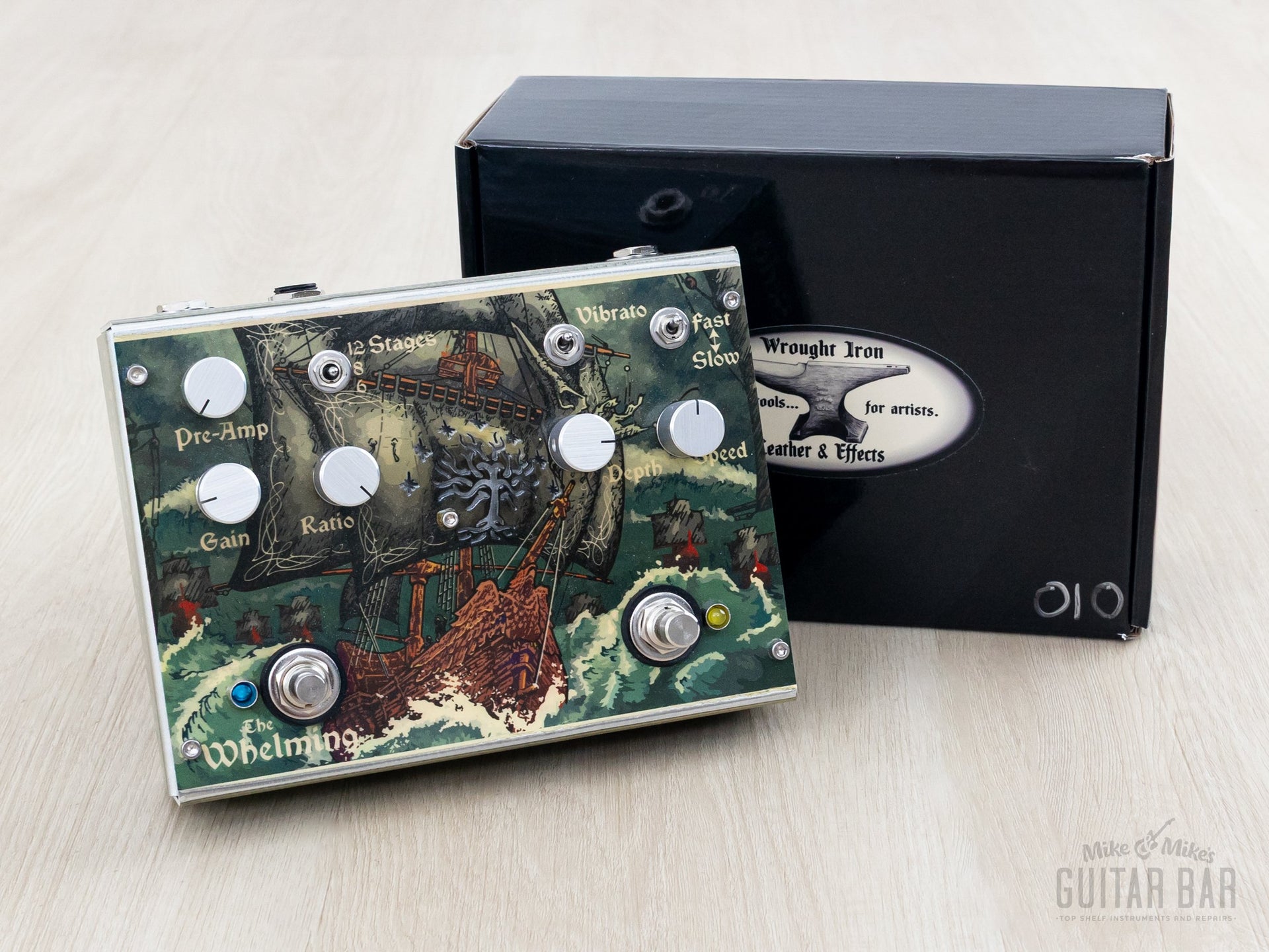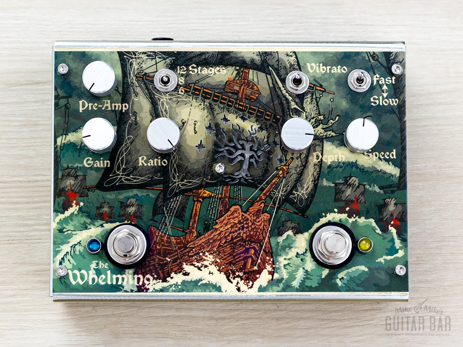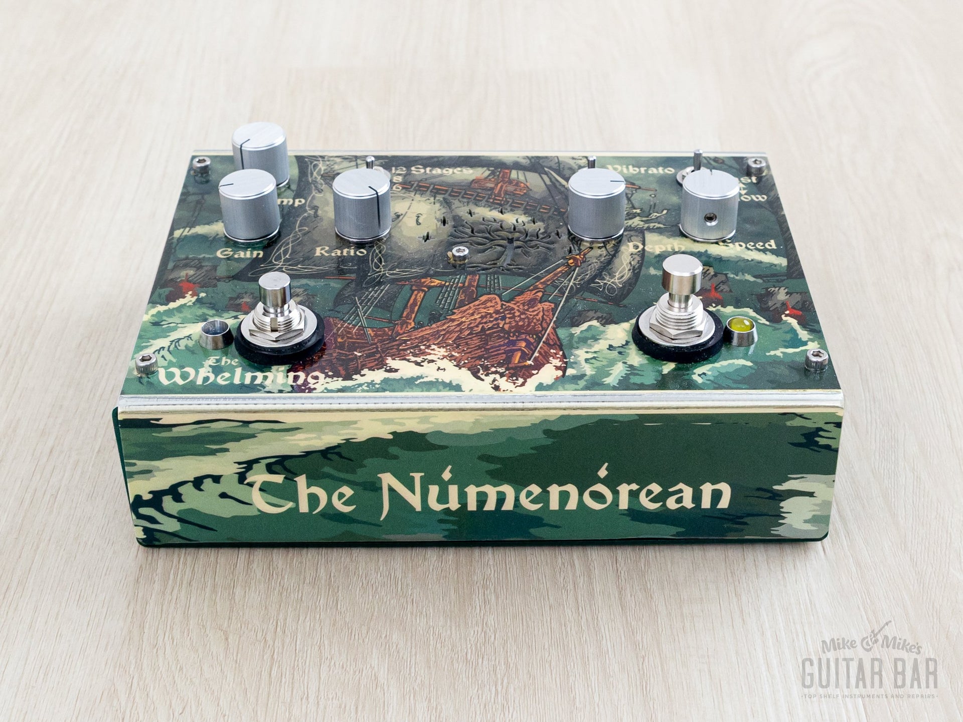 The Numenorean does a remarkable job delivering a sonic profile that matches the sea-faring ways of its namesake people (and graphics), perfectly watery and vibey. Things get especially aquatic with the 12-stage circuit engaged, and depending on the settings, this pedal can serve as a univibe-esque chorus, phaser, flanger (at low speeds), or vibrato. To represent the downfall part of the drowning of Numenor, Wrought Iron added The Whelming footswitch which, when engaged, introduces 2 separate positive feedback paths, upping the gain and generally making the pedal a whole lot more chaotic and unpredictable with runaway oscillation and fuzz. Finally, the central insignia on Elendil’s sails lights up when the pedal is active (real Tolkien heads will know that Elendil’s emblem eventually becomes the flag of Gondor).